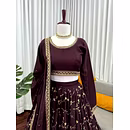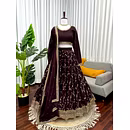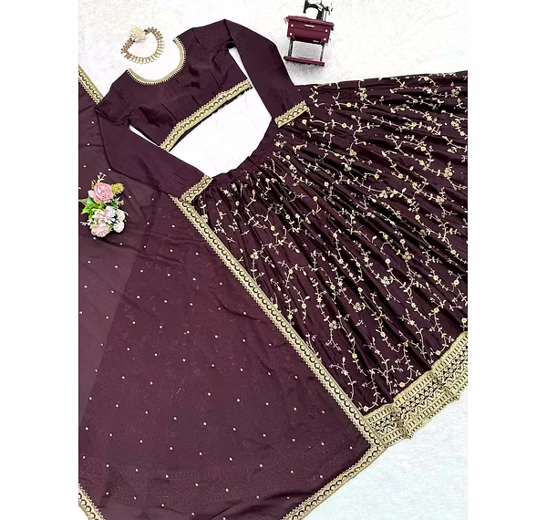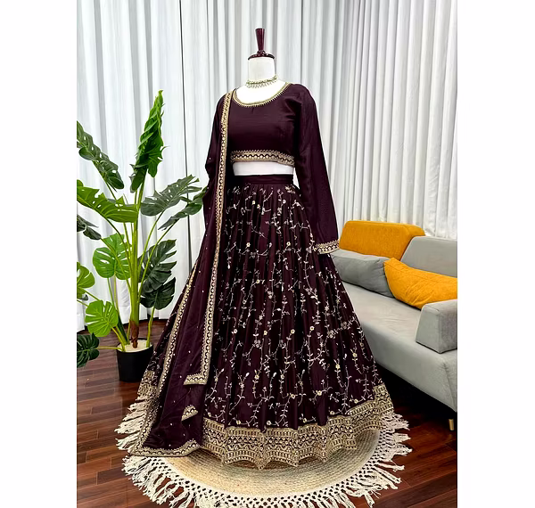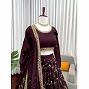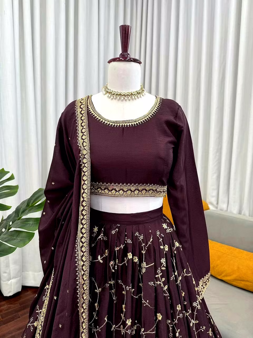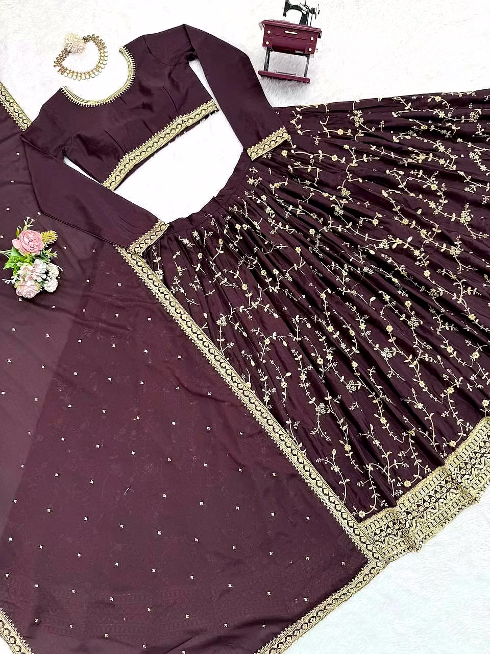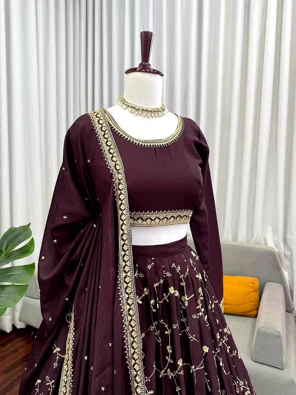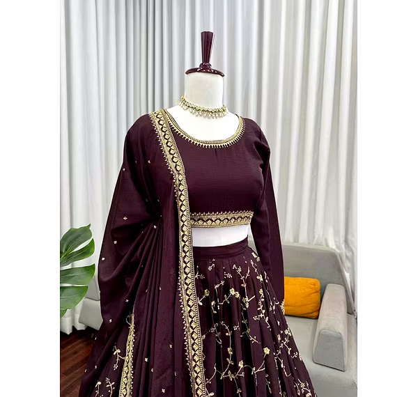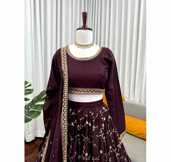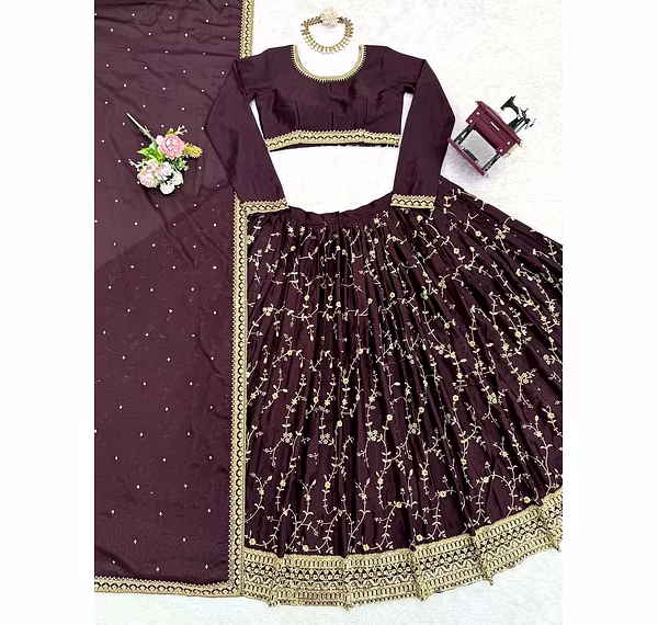Brown Chinon Silk Lehenga Choli is the epitome of elegance and style for women. This exquisite ethnic attire blends tradition with modern design, perfect for special occasions.