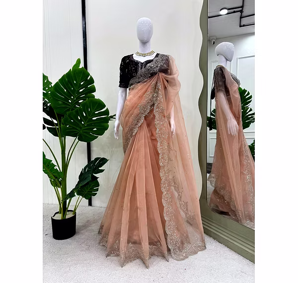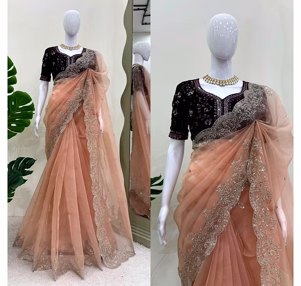 The rich brown hue of this organza saree exudes charm and contemporary allure, making it a standout choice for women seeking a blend of elegance and trendiness. The designer border detail elevates its luxurious appeal, ensuring you radiate style at every event.