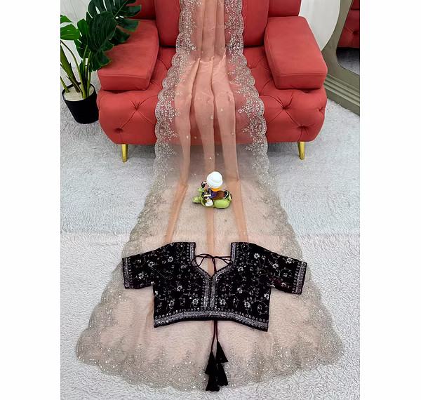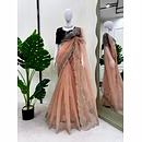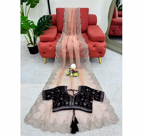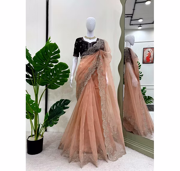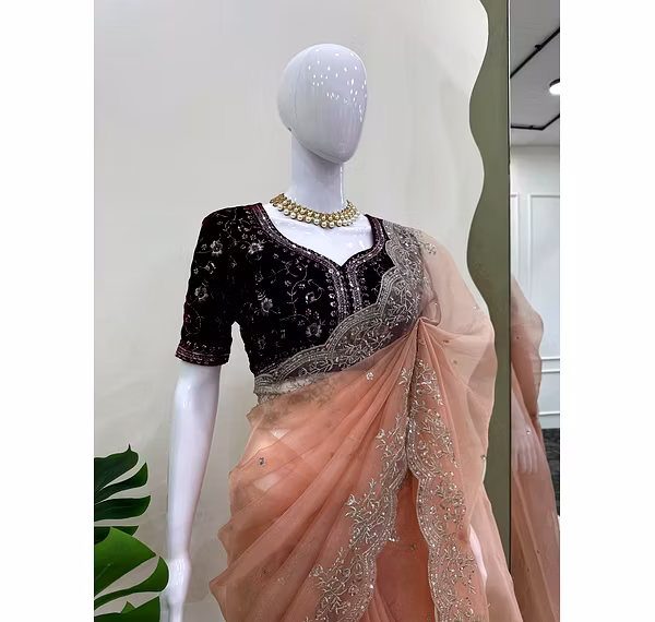 This organza saree effortlessly marries elegance with comfort, creating a versatile garment suitable for various occasions. Whether you prefer a minimalist look or wish to make a statement, this saree caters to diverse style preferences with its refined design and subtle sparkle.