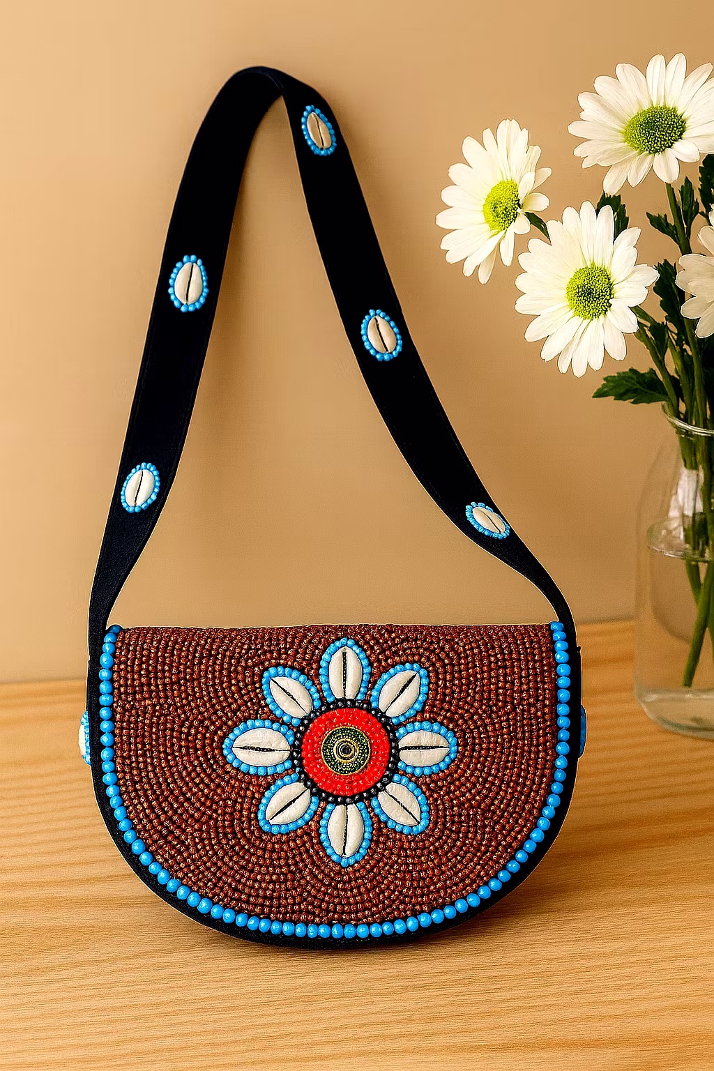 The design highlights brown colour tones described in the product title, complemented by beads and any shells arranged in structured patterns. This bag can be positioned as an accessory for ethnic wear, festive collections and evening events where buyers prefer handmade beaded bags over plain fabric options. It is suitable for importers, wholesalers, boutique owners and online sellers who require clear, repeatable designs that can be presented in lookbooks or catalogues.
