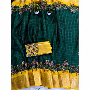 Introducing our latest saree collection, featuring our candy cotton silk saree with a jequrd border. This elegant saree is perfect for any occasion, whether it be a wedding or a formal event. The saree is lightweight, weighing only 500 grams, so you can wear it comfortably for long hours. The saree comes with the same border design as the original, giving it a classic and timeless look. The running blouse is also included, and looks exactly like the one in the photo. The saree is made of high-quality candy cotton silk, which is known for its soft texture and durability. Get ready to turn heads with this stunning saree that combines traditional design with modern elegance.