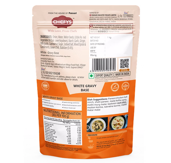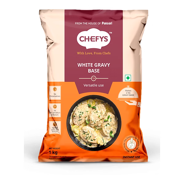 Chefys White Gravy Base is a versatile culinary product designed to simplify the preparation of rich and creamy white gravies, commonly used in various Indian and international cuisines. Packaged in a 1 kg format, it caters to both home cooks and professional chefs seeking convenience without compromising on taste Key Features: High-Quality Ingredients: Crafted from premium components, including cashews, melon seeds, and aromatic spices, ensuring an authentic and rich flavor profile. Convenience: This ready-to-use base significantly reduces preparation time, allowing for quick and consistent meal creation. Versatility: Ideal for a variety of dishes such as Malai Kofta, Shahi Paneer, and other creamy curries, providing a consistent foundation for diverse recipes.