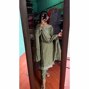 Introducing the Chinnon Silk Top, Pant & Dupatta Set, a perfect blend of elegance and style. This exquisite ensemble is designed to make you stand out from the crowd. Crafted with meticulous attention to detail, the heavy embroidery on the top adds a touch of opulence, making it a true showstopper. Made from premium quality Chinnon silk, this set offers a luxurious feel and a comfortable fit. The ready-to-wear design ensures effortless dressing, saving you precious time. The set includes a matching pant and dupatta, completing the look and giving you a complete outfit in one. Whether you're attending a wedding, a festive celebration, or a special occasion, the Chinnon Silk Top, Pant & Dupatta Set is sure to make a lasting impression. Embrace the beauty of this ensemble and let it enhance your grace and charm. Experience the allure of this timeless piece and be the epitome of elegance wherever you go.