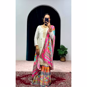 Introducing our stunning Chinon Suit with Sequin Embroidery Work, a perfect addition to your wardrobe for all your special occasions. This suit is designed with intricate sequin embroidery work that adds an elegant and luxurious touch to your overall look. The fabric used for the suit is high-quality Chinon, which is known for its durability, softness, and comfortable feel. The suit comes with a Micro Inner that is designed to provide maximum comfort and ease of movement while wearing it. It is available in various sizes, including M-38”, L-40”, XL-42”, and XXL-44”, ensuring that you find your perfect fit. The Gharara is made with the same Chinon fabric and with sequin embroidery work that matches the suit. The Micro Full Stitched Full Falair Gharara is designed to accentuate your curves while keeping you comfortable. The Gharara is free size, making it easy for you to wear and adjust according to your comfort. To complete the look, the suit comes with an Orgenza Dupatta with Digital Print and Heavy Border Lace Work. The Dupatta is 2.2 meters long, providing ample coverage and versatility in styling. The suit and Gharara together weigh 920gm, making it lightweight and easy to carry. Our Chinon Suit with Sequin Embroidery Work is perfect for weddings, parties, and other special occasions. It is a unique and luxurious piece that is sure to turn heads and make you feel confident and beautiful. Don't wait, add this masterpiece to your wardrobe today and make your next special occasion unforgettable.
