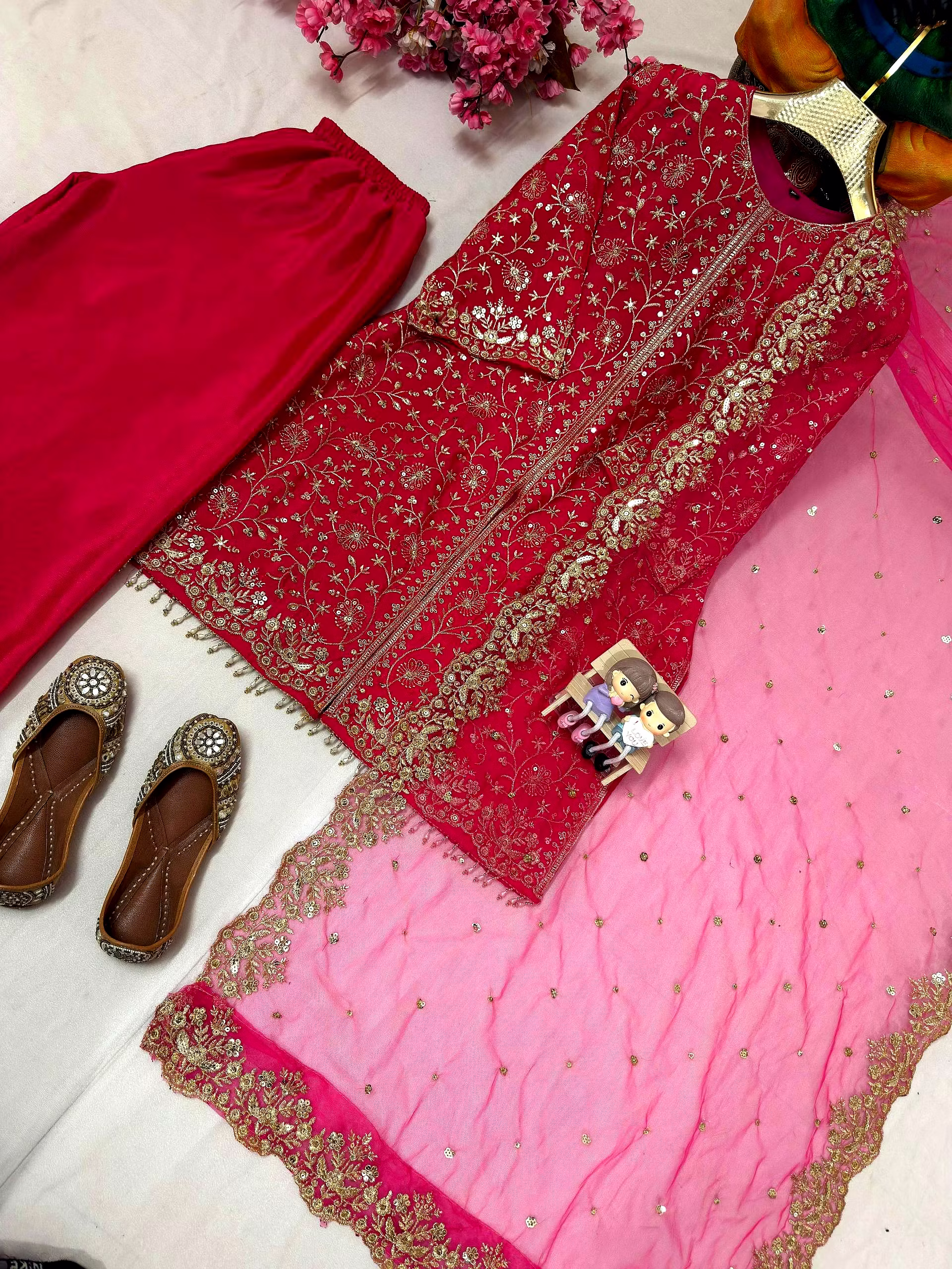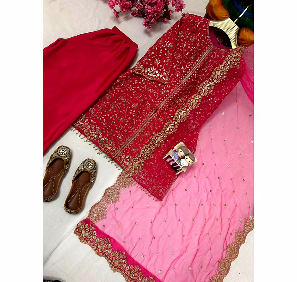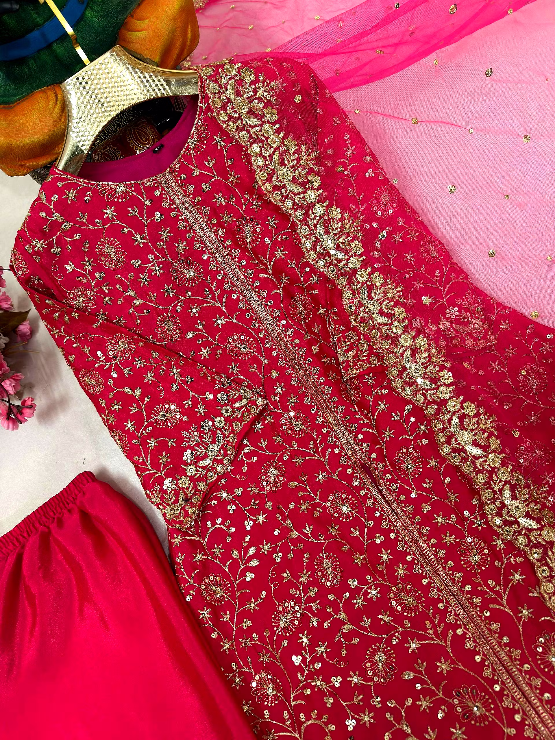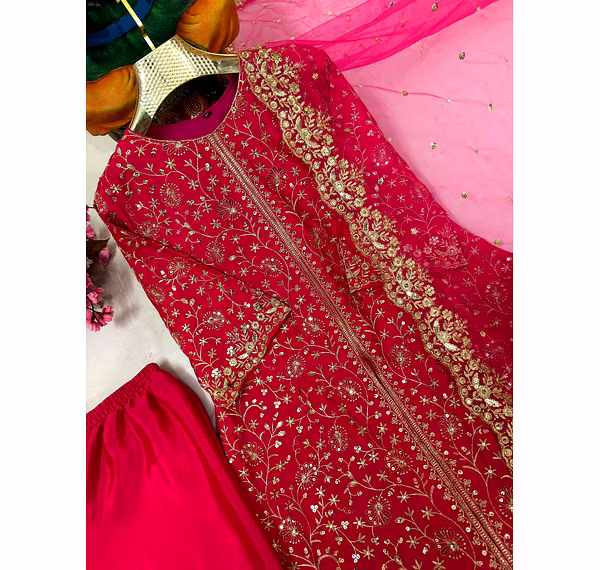 Make a chic style statement with our chinon silk kurti set, complete with palazzo and dupatta. Whether it's a special occasion or a casual outing, this ensemble will elevate your fashion game.