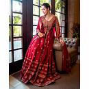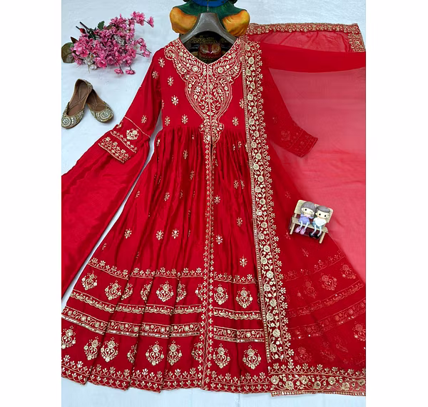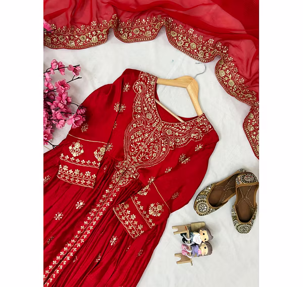 Indulge in luxurious elegance with this Chinon Silk Suit with Dupatta, a perfect blend of soft drapes, festive shine, and timeless style. Ideal for weddings, celebrations, and evening gatherings.
