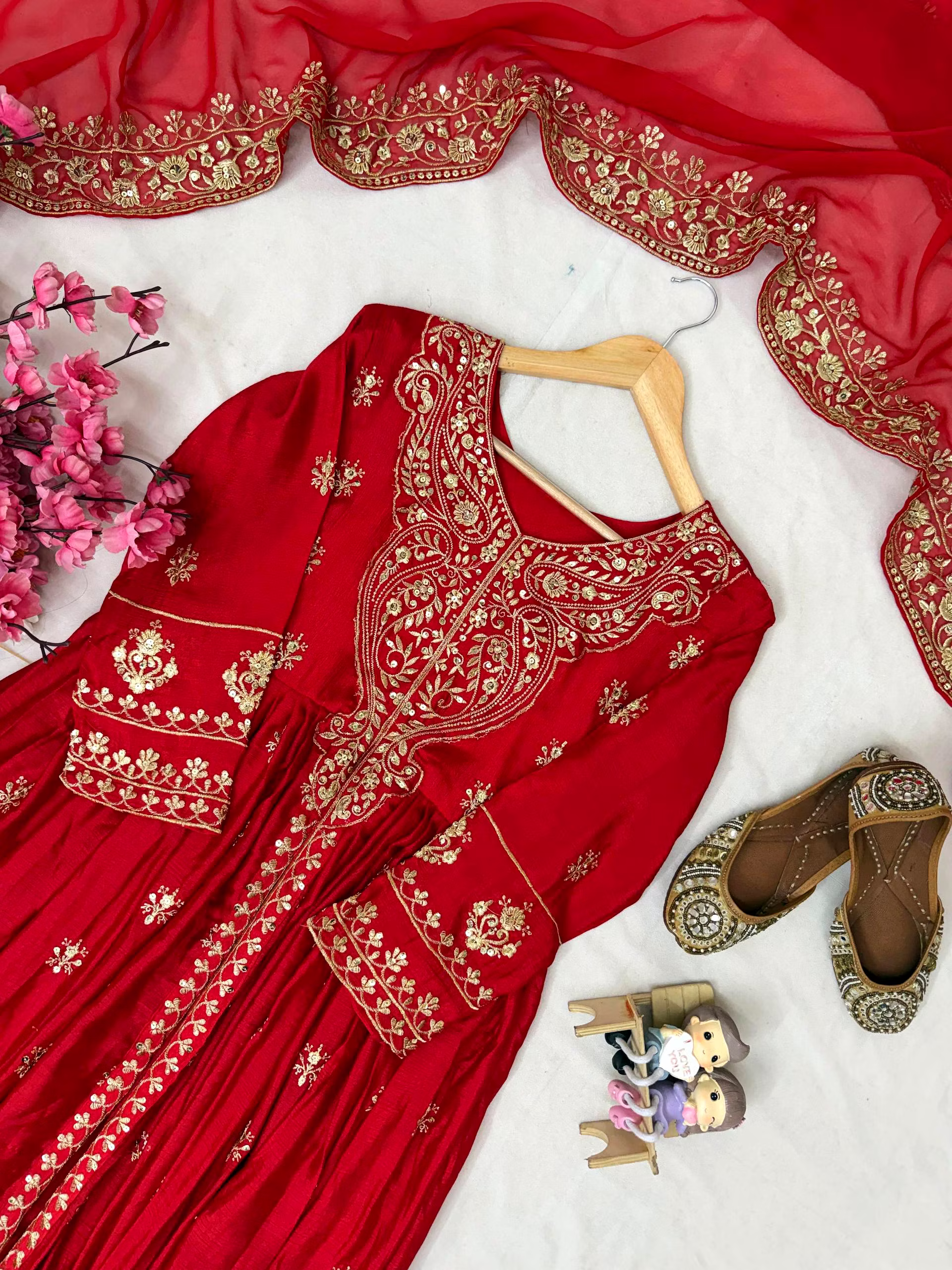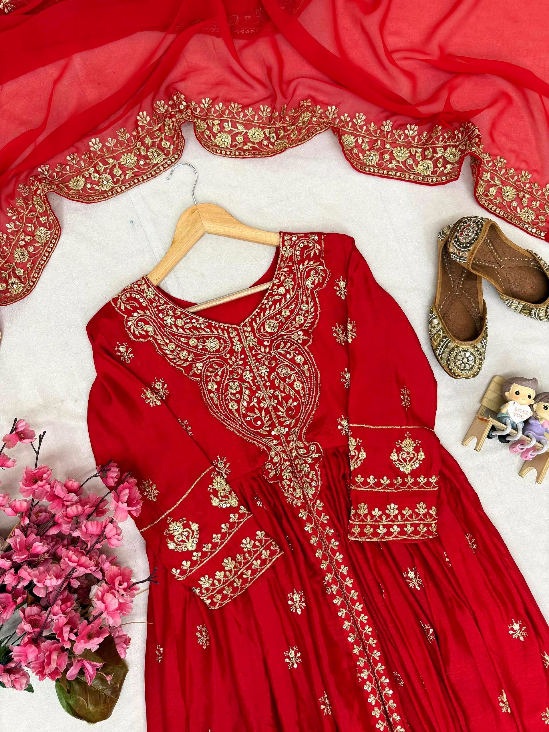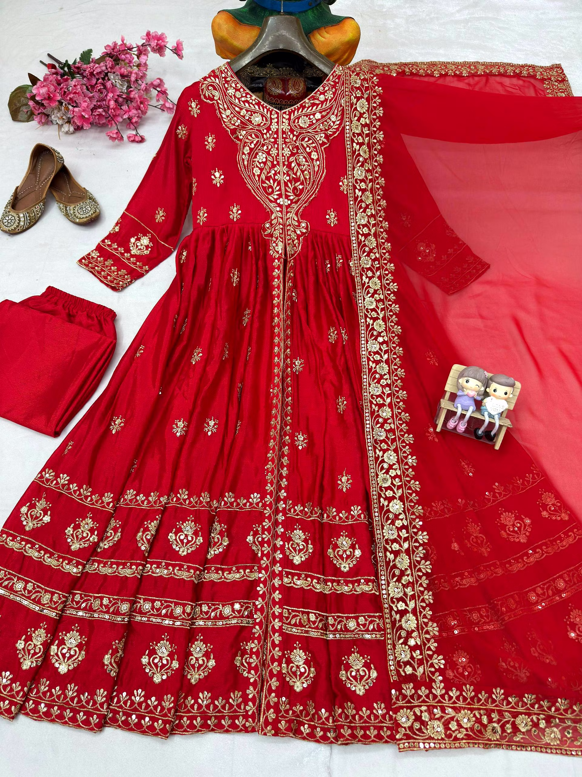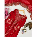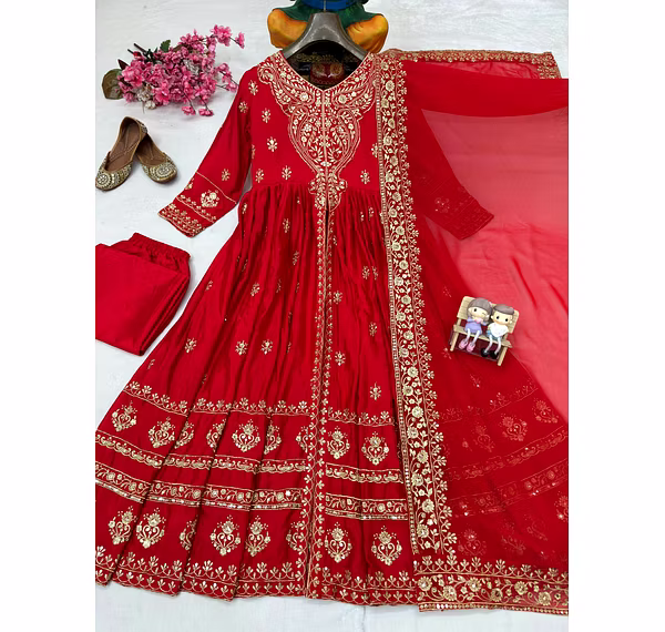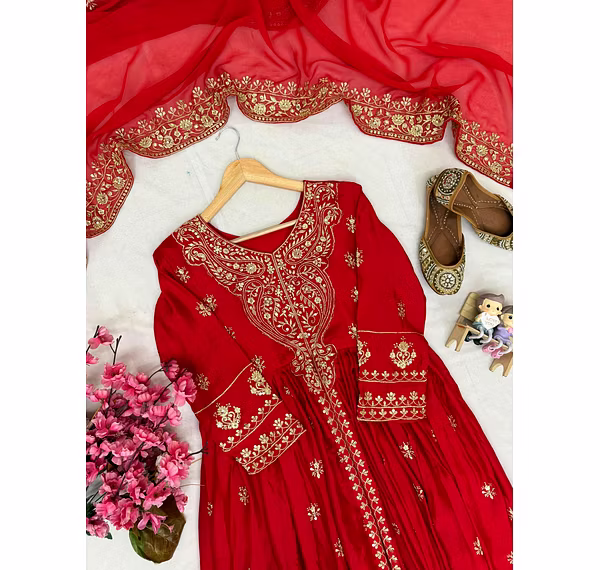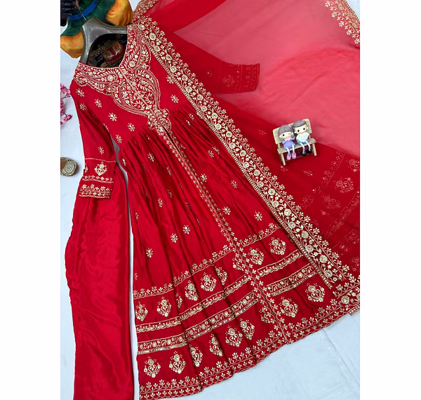Unleash your inner glam with this exquisite Chinon Silk Suit with Dupatta. Experience the feather-light touch and delicate gloss of Chinon silk, accentuated by intricate embroidery/sequin work that exudes pure sophistication.