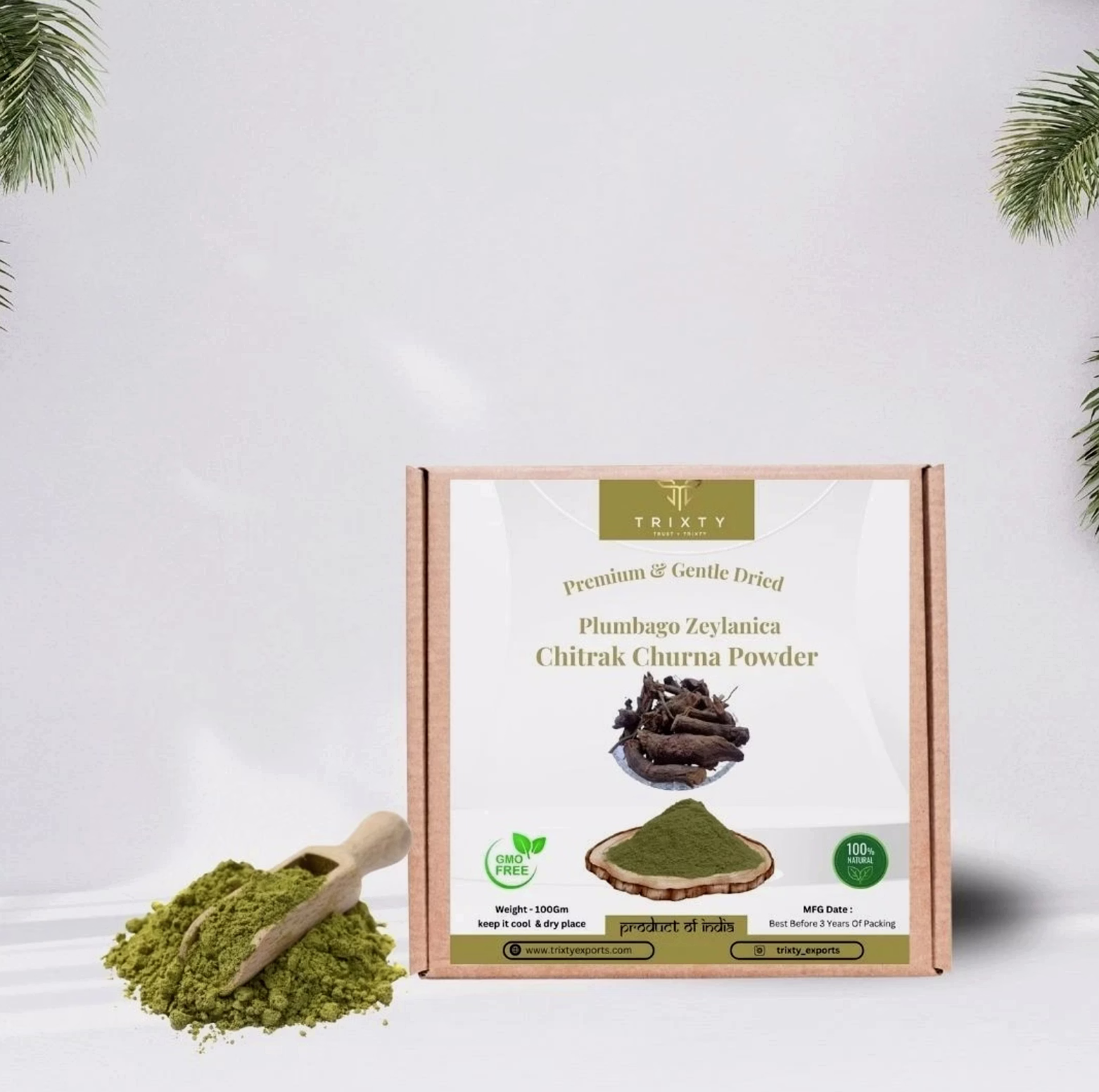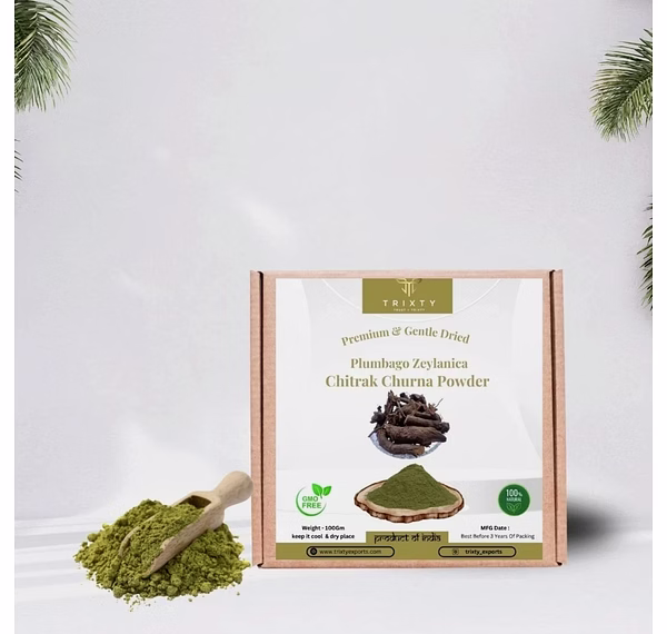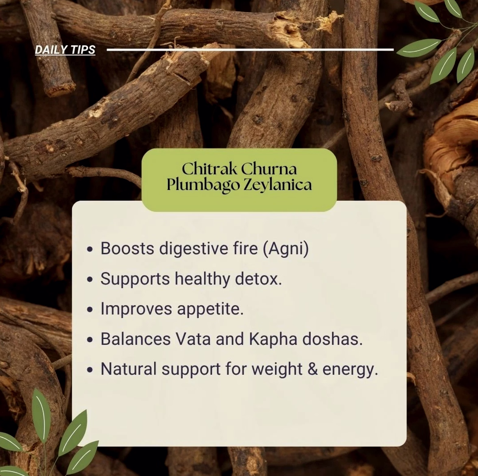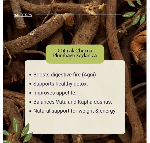 Chitrak Churna (Plumbago Zeylanica), also known as Leadwort Root Powder, is a powerful digestive herb used in Ayveda to stimulate metabolism, support digestion, and eliminate toxins from the body. It is especially effective in correcting sluggish digestion, boosting appetite, and promoting detoxification.