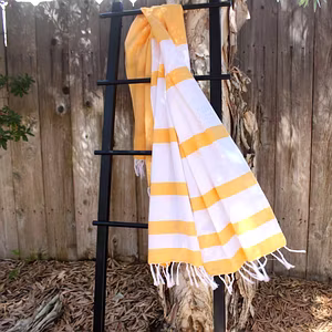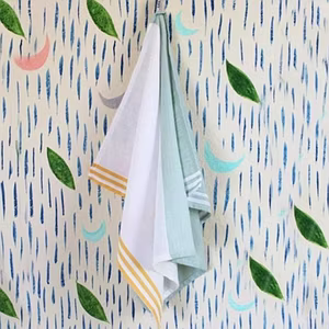 This citrus-colored collection has graphic stripes in sunny yellow, lemon yellow, and white. The textile can be used in multiple ways at home, as a scarf or as beach textiles.