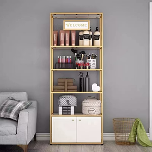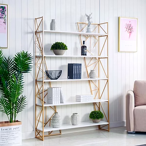 Klarna bookshelf by XOXA Home is a tall beauty of 5ft3 inches with a gold plated iron base with 3 stories of stone shelves and velvet suede elements to give it a chic high-class look.
