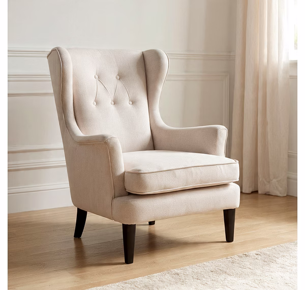 This Wing Back Accent Chair combines timeless elegance with everyday comfort, making it a perfect statement piece for living rooms, bedrooms, or reading corners. Upholstered in soft, neutral fabric, it features a classic winged backrest with subtle button tufting that provides excellent support while enhancing its refined look. The generously cushioned seat ensures lasting comfort, while the sturdy wooden legs offer reliable stability and durability. Designed to complement both modern and traditional interiors, this chair adds warmth, sophistication, and functionality to any space.