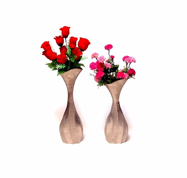 Enhance your decor with the Contemporary Aluminum Vase Duo. This set includes two sleekly designed vases that add a touch of sophistication to your living space. Crafted from high-quality aluminum, these vases are both stylish and durable. Their different sizes and aluminum finish make them ideal for showcasing your favorite blooms.