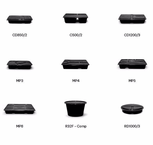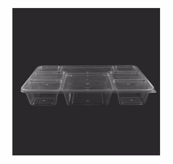 > MP5 plateau repas à 5 compartiments : Volume 1015 ml - Dimensions 230 x 190 x 43 mm - Poids 56,5 g - Couleur noire ou transparente