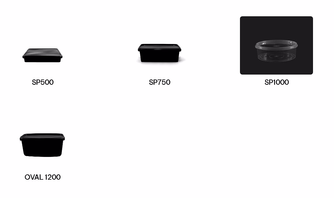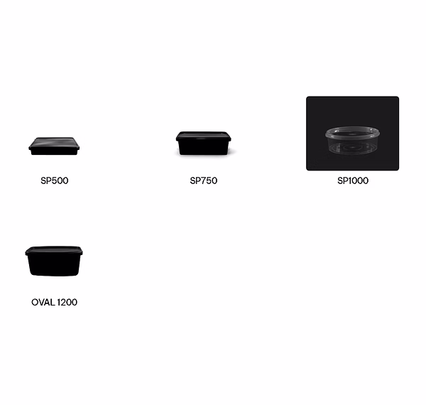 > SP500 rectangulaire : Volume 900 ml - Dimensions 193 x 157 x 35 mm - Poids 51 g - Couleur noire ou transparente