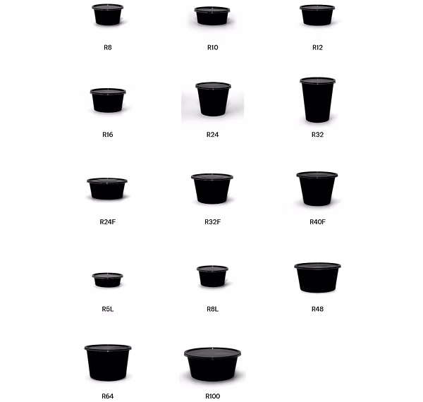 > R5L rond allongé : Volume 150 ml - Dimensions Ø 99 x 32 mm - Poids 9,8 g - Couleur noire ou transparente