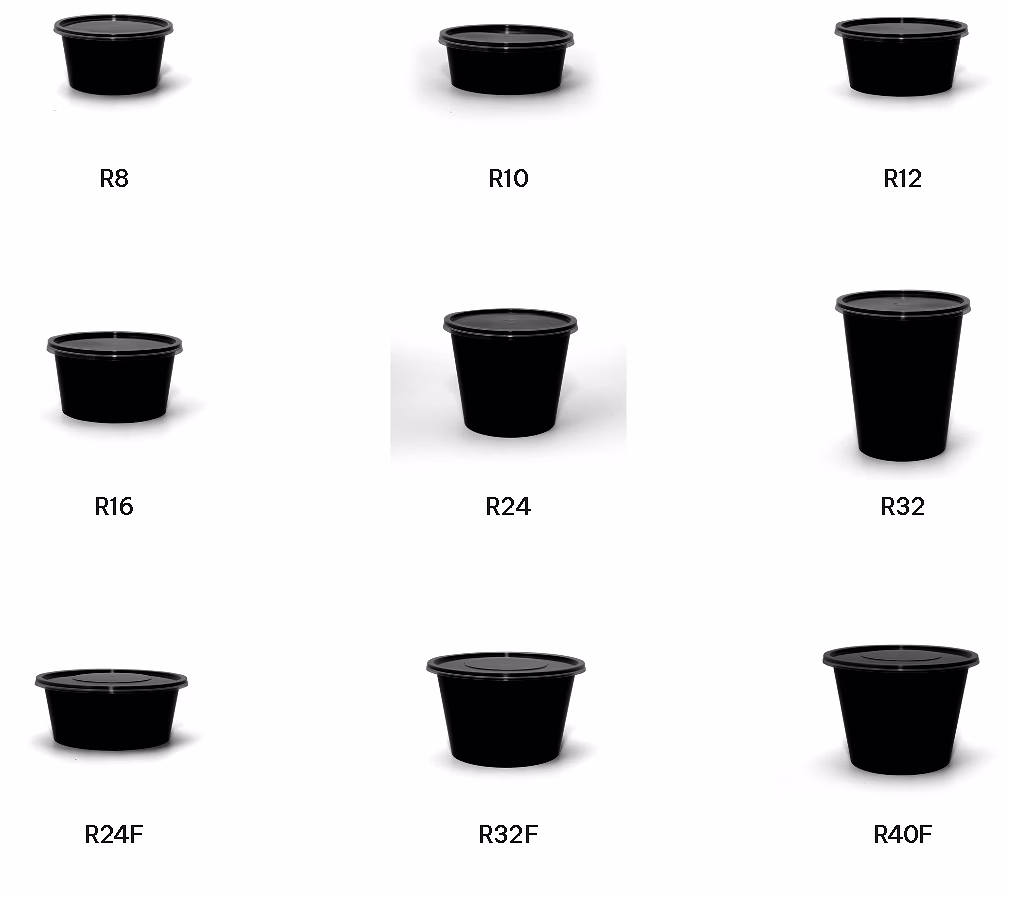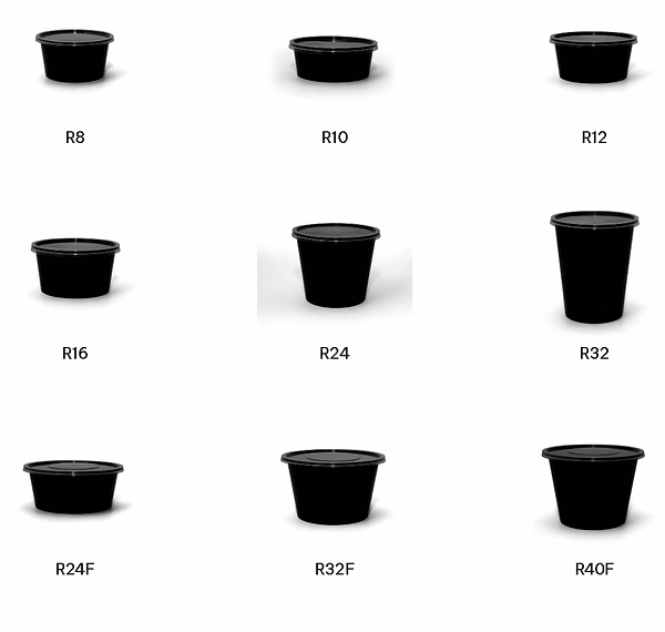 > R40F rond plat : Volume 1200 ml - Dimensions Ø 154 x 110 mm - Poids 34 g - Couleur noire ou transparente