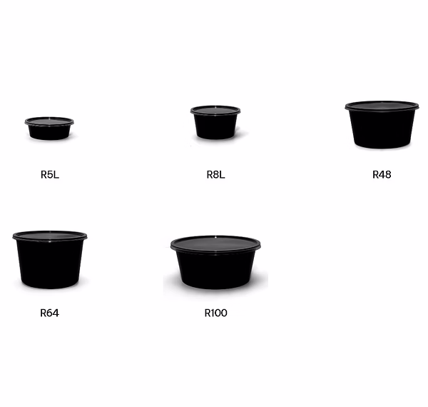 > R64 rond : Volume 2000 ml - Dimensions Ø 176 x 116 mm - Poids 55 g - Couleur noire ou transparente