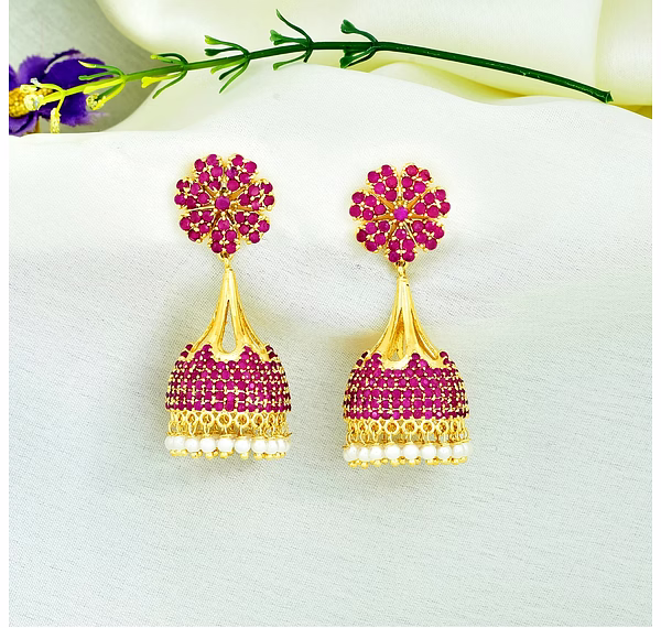This beautiful pair of gold-plated Jhumka earrings are made of the highest quality metalwork and studded with stunning Ruby American Diamonds. An eclectic fusion of unique design, bold colors and ethnic taste, it's perfect for any occasion.