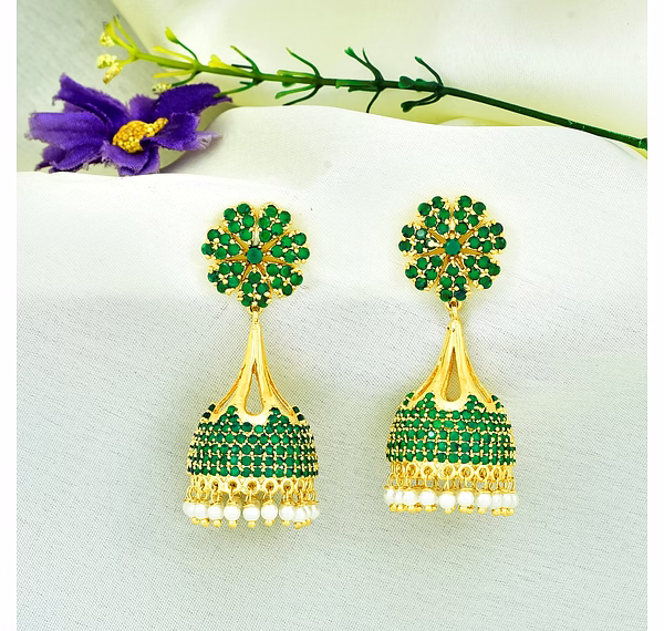 This beautiful pair of gold-plated Jhumka earrings are made of the highest quality metalwork and studded with stunning Emerald American Diamonds. An eclectic fusion of unique design, bold colors and ethnic taste, it's perfect for any occasion.