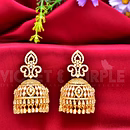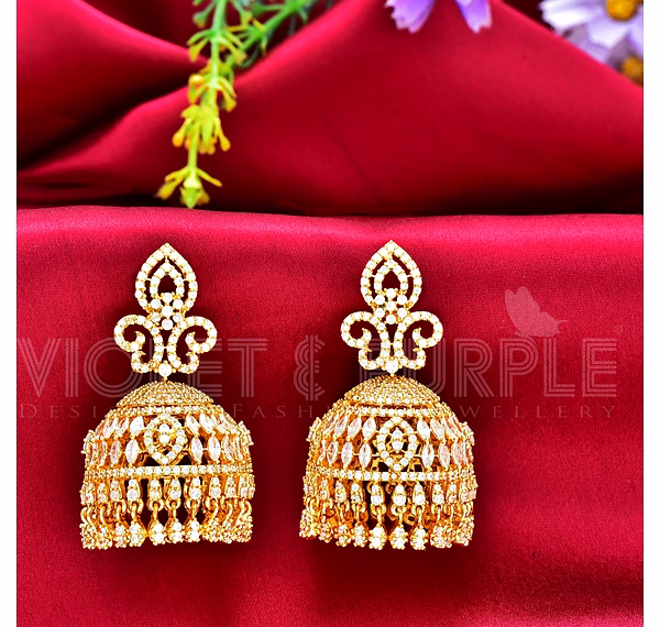This beautiful pair of Gold plated Jhumka earrings are made of the highest quality metalwork and studded with dazzling White American Diamonds. An eclectic fusion of unique design, bold colors and ethnic taste, it's perfect for any occasion.