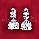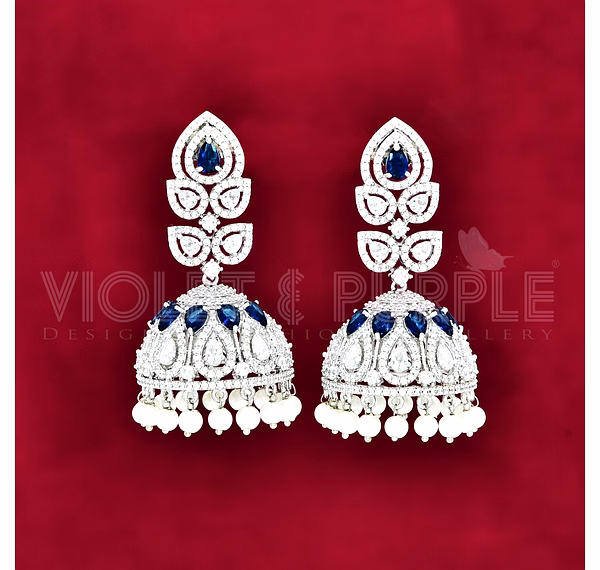 This beautiful pair of White-Rhodium plated Jhumka earrings are made of the highest quality metalwork and studded with dazzling Navy-Blue & White American Diamonds. An eclectic fusion of unique design, bold colors and ethnic taste, it's perfect for any occasion.