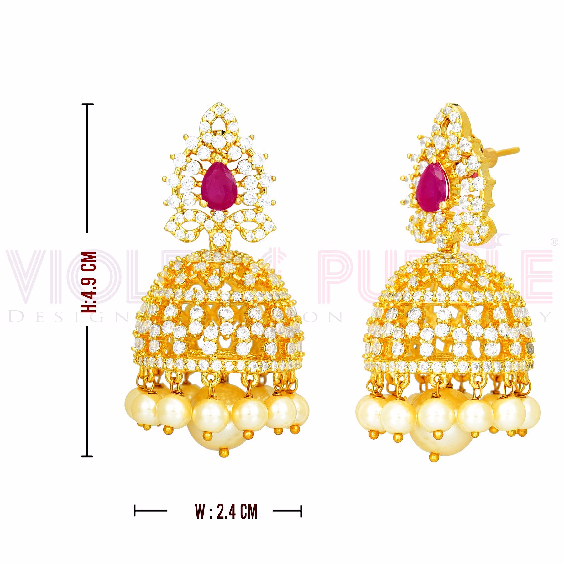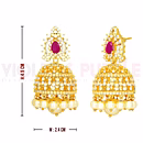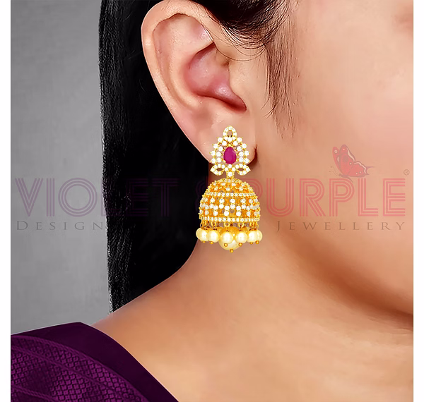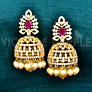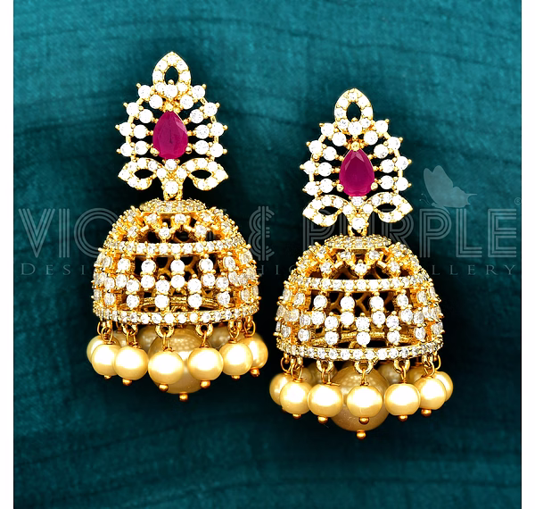 This beautiful pair of Gold plated Jhumka earrings are made of the highest quality metalwork and studded with dazzling Ruby and White American Diamonds. Whether for a friend's party or a traditional wedding gala. it's perfect for any occasion.