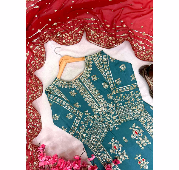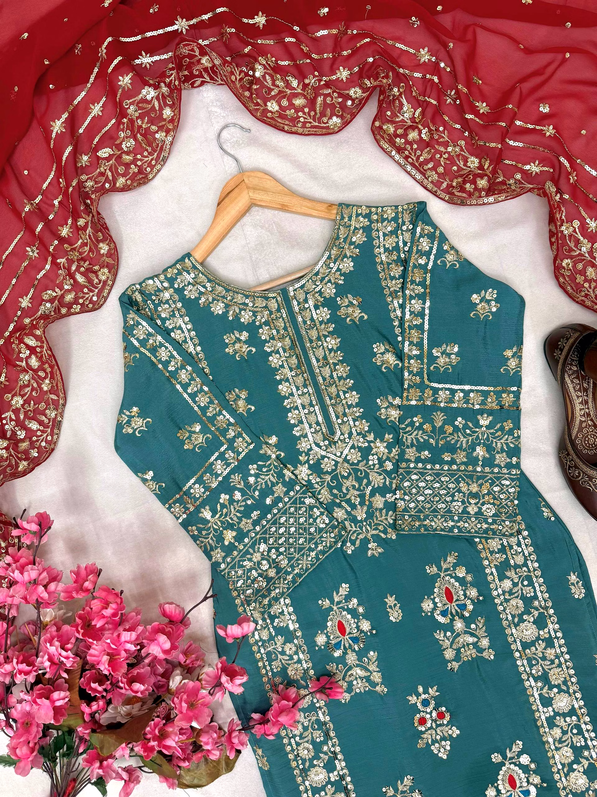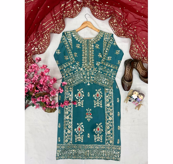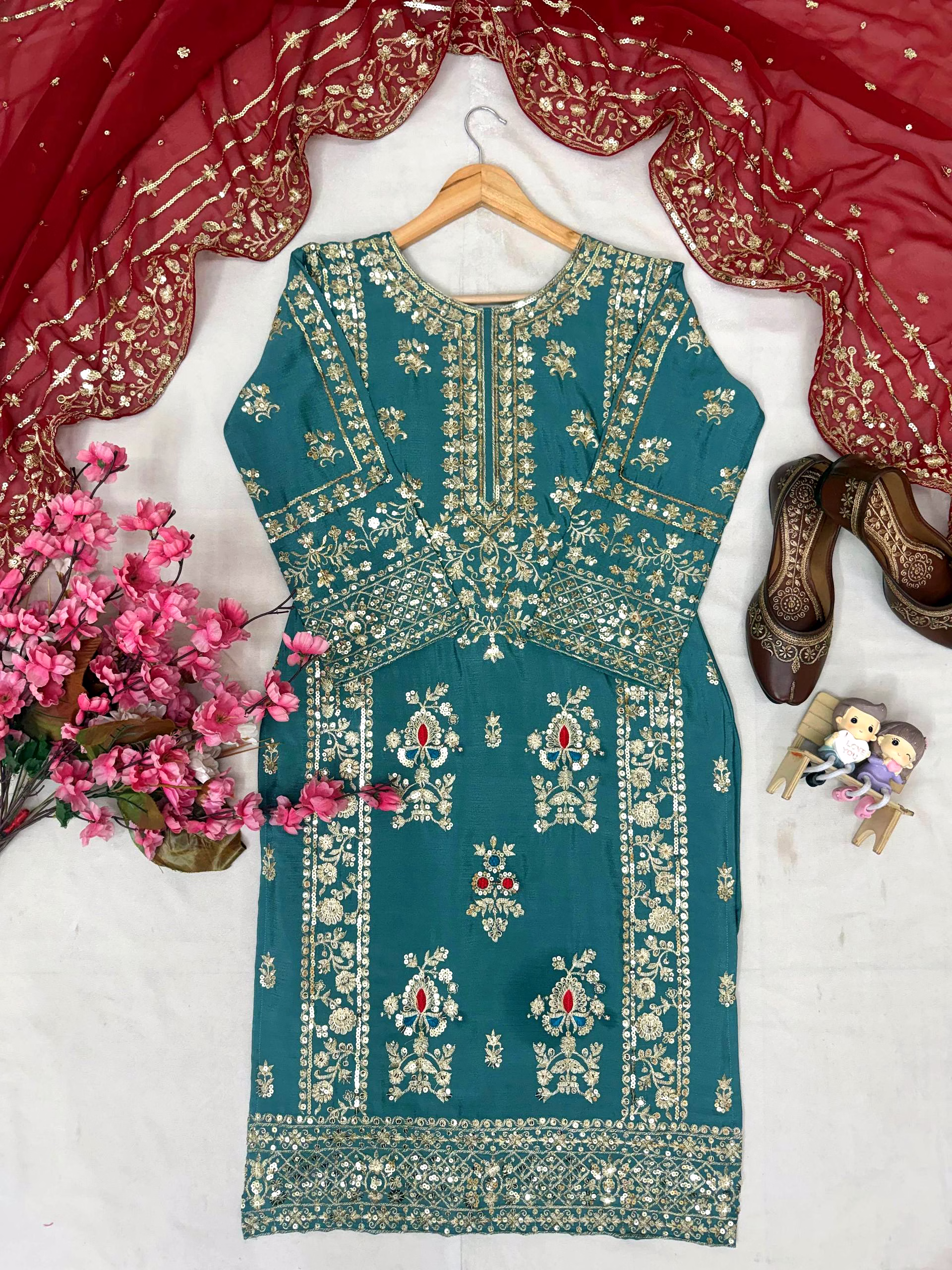 Experience the timeless appeal of Cyan Chinon Silk paired with flawless Sequence Work, creating a kurti that exudes charm and grace. Embrace quality and style effortlessly with this must-have piece for fashion-forward individuals.