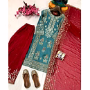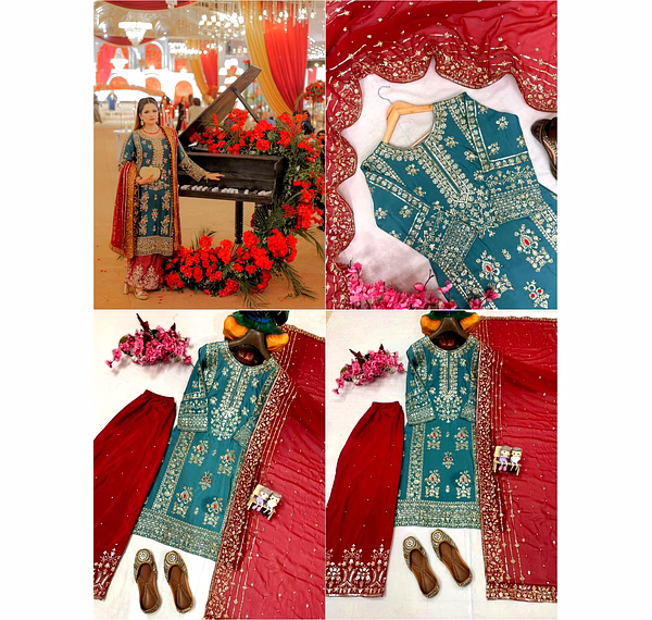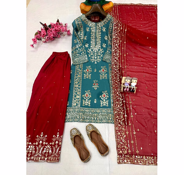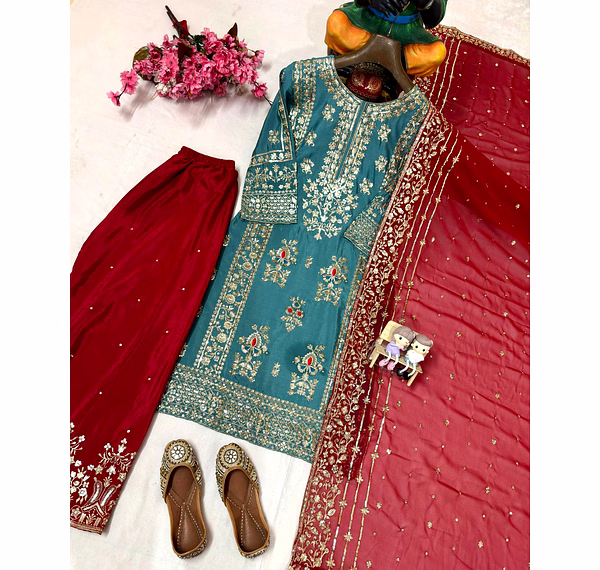 Elevate your style with our stunning Cyan Chinon Silk Kurti adorned with exquisite Sequence Work. This elegant piece offers a perfect blend of traditional craftsmanship and contemporary design.
