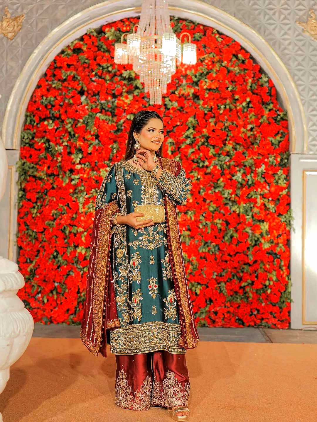 Indulge in the luxurious beauty of Cyan Chinon Silk, a fabric known for its lustrous appearance and comfortable feel against the skin. The intricate Sequence Work adds a touch of glamour, making this kurti a statement piece for any occasion.