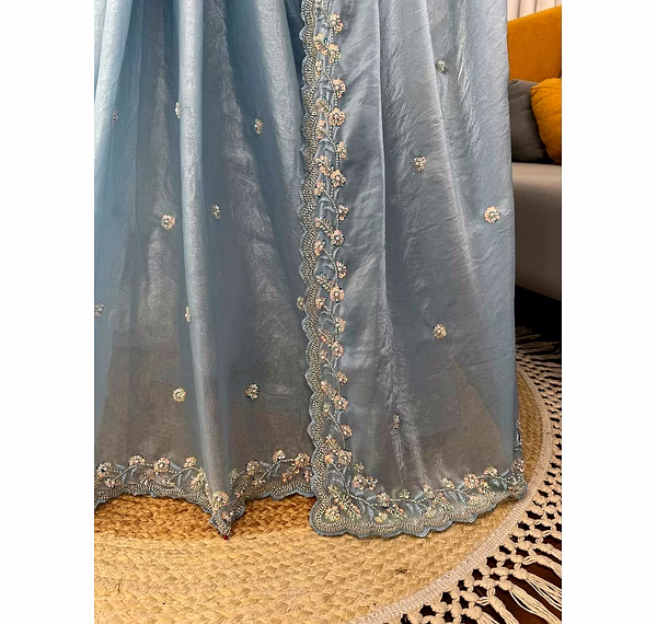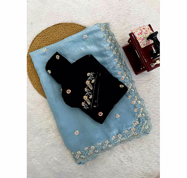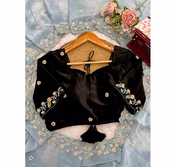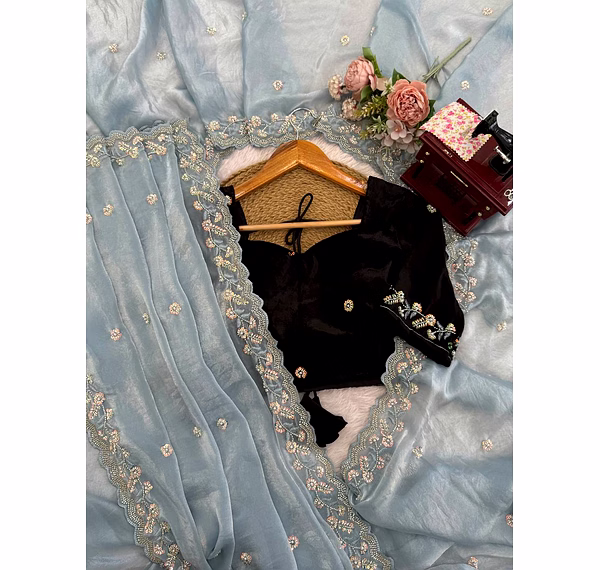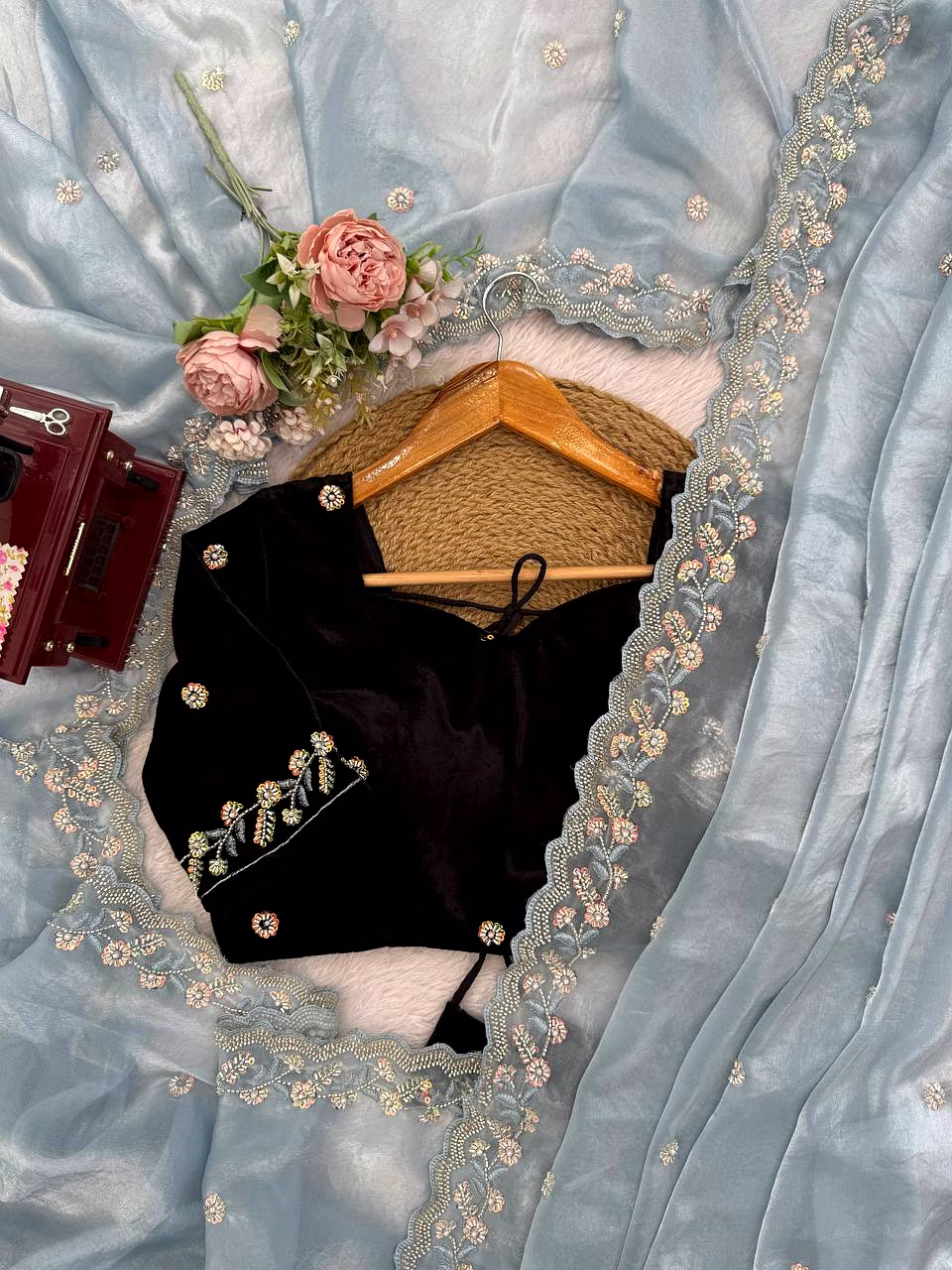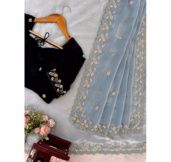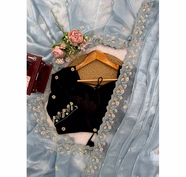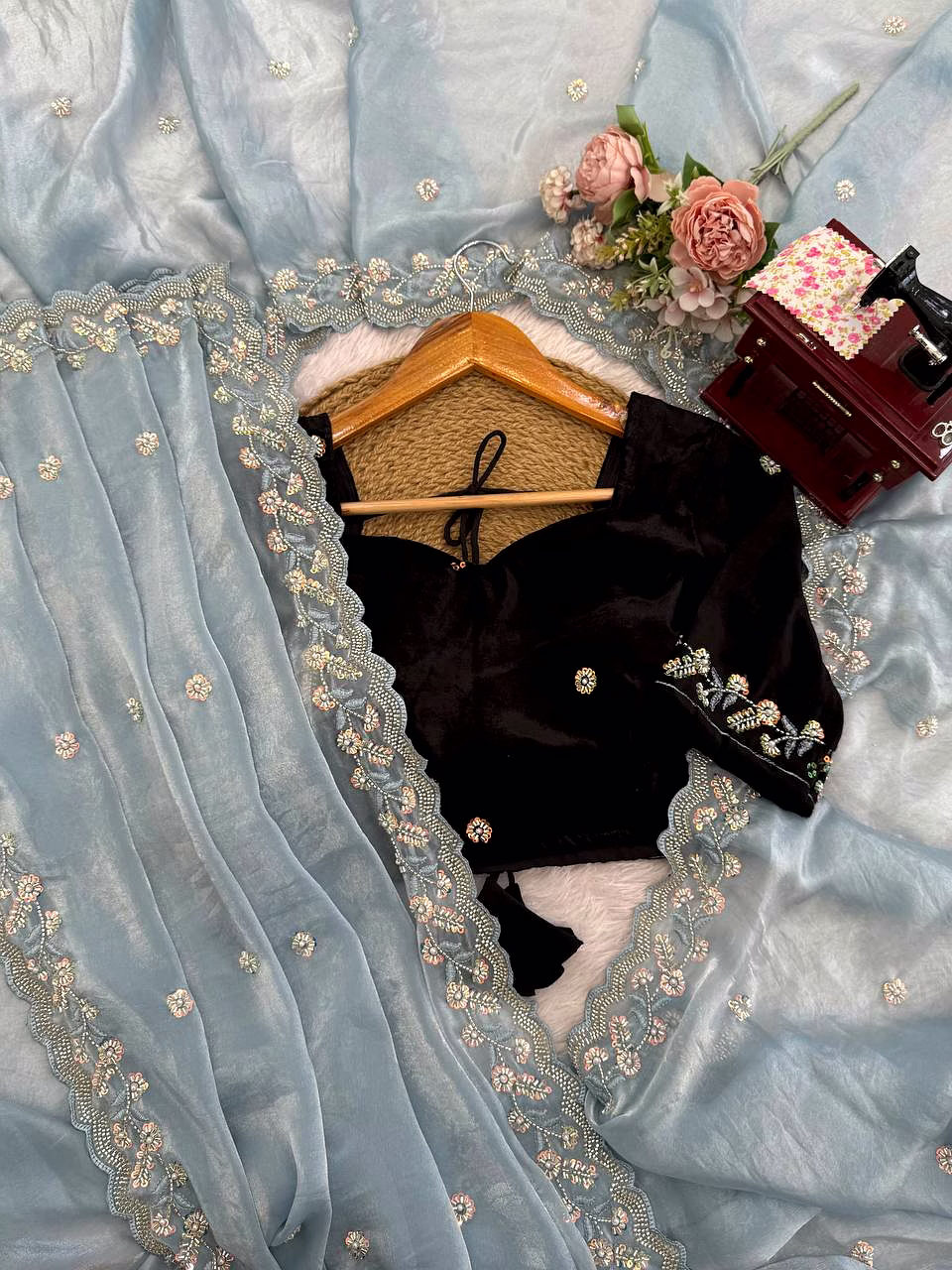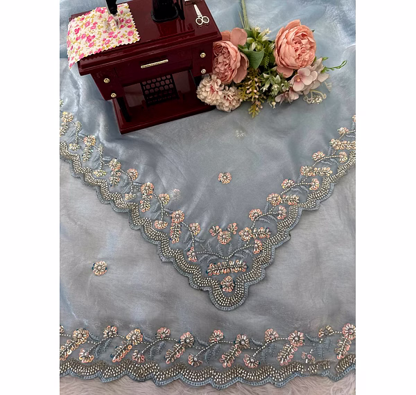 This saree features delicate beadwork embellishment, carefully placed to enhance the overall look without overpowering its refined design. Inspired by high-fashion designer sarees, it balances minimal glamour with festive charm, making it suitable for both grand celebrations and elegant evening gatherings.