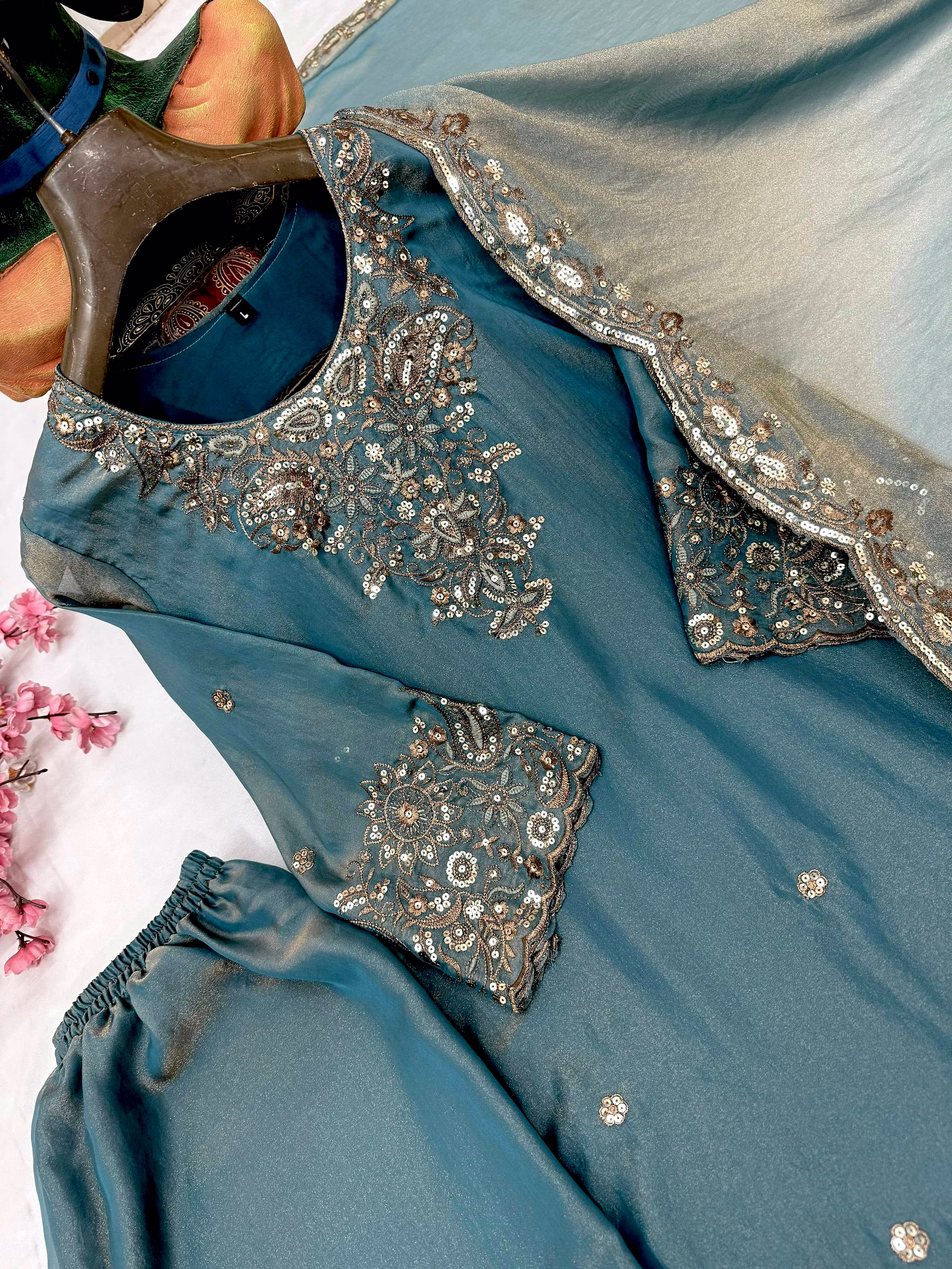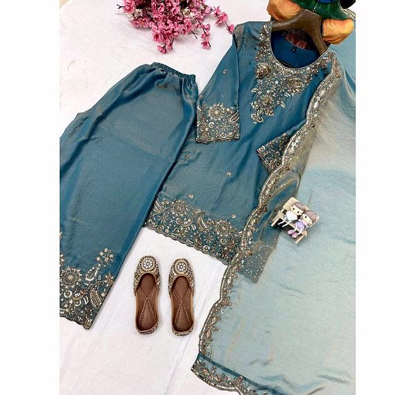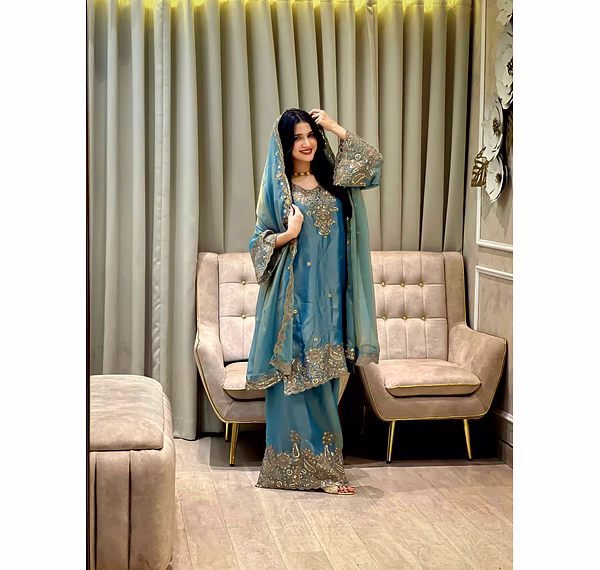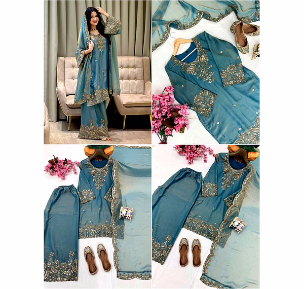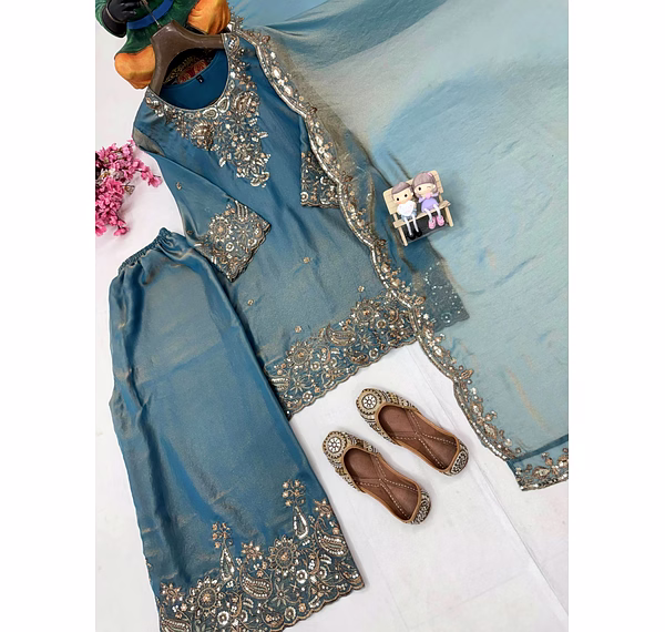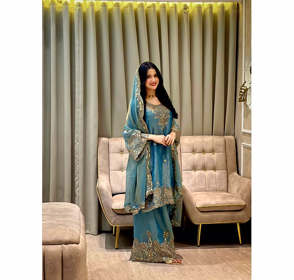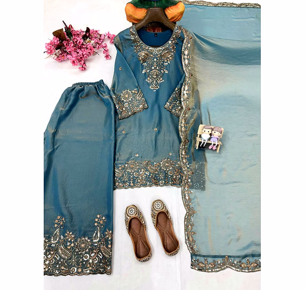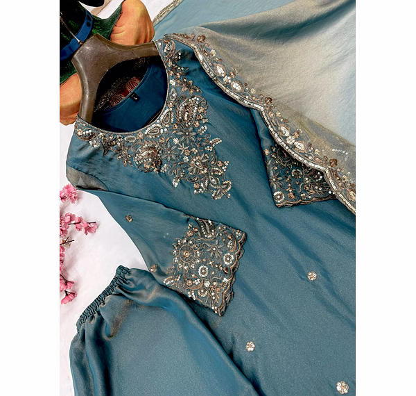 Step into a world of elegance with our Cyan Moss Silk Kurti. The intricate Sequence Work adds a touch of sophistication, making it a perfect choice for any occasion. Embrace luxury and style with this stunning piece.
