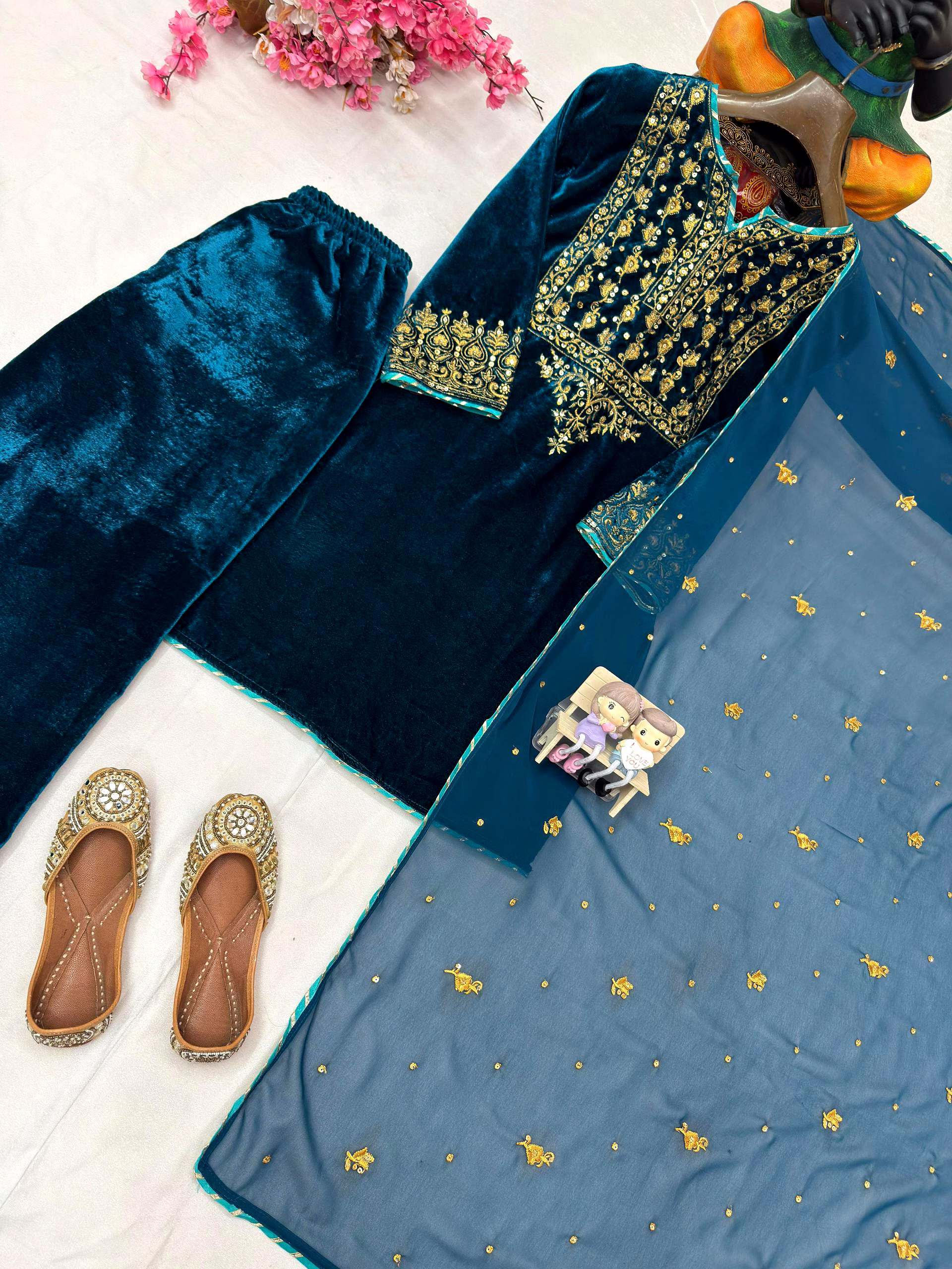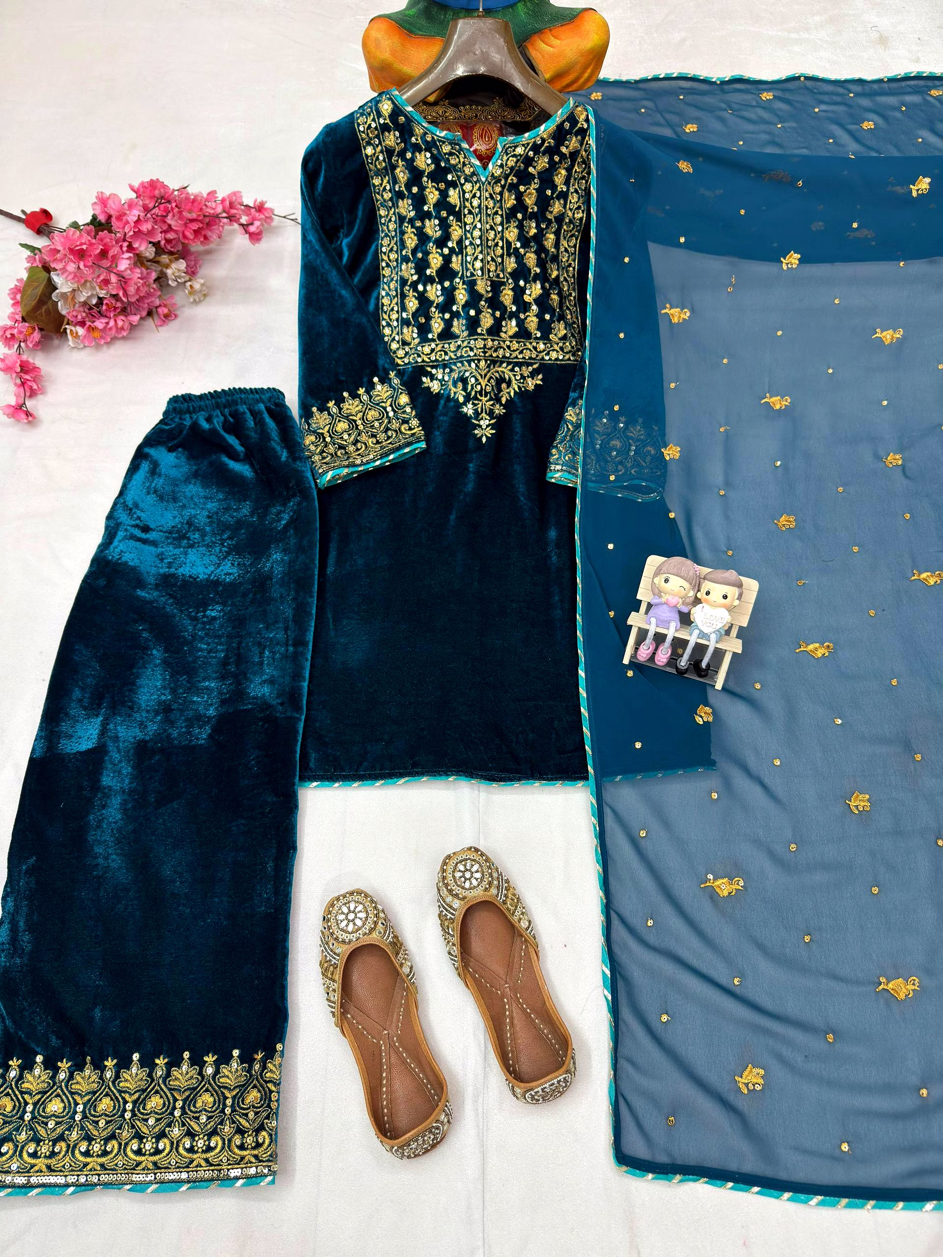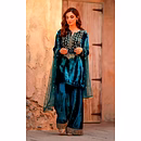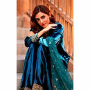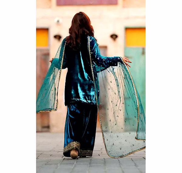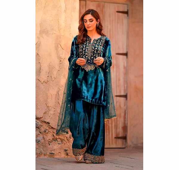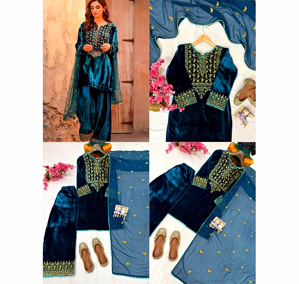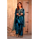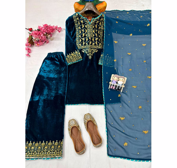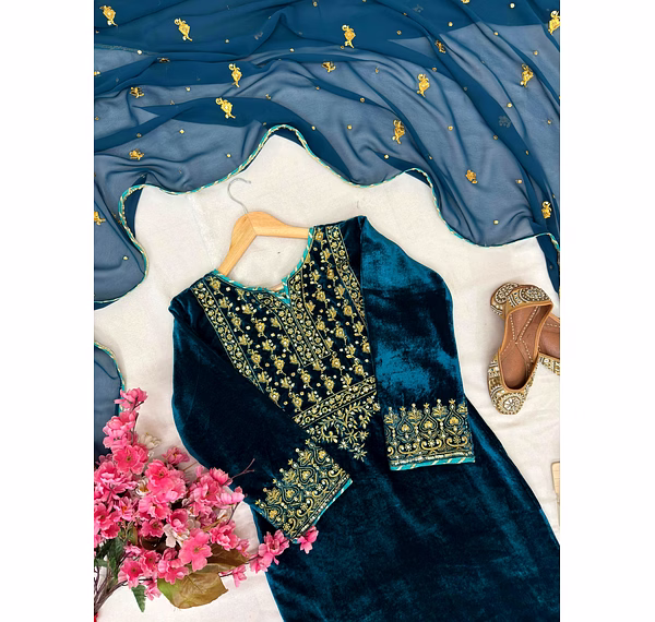The soothing cyan shade brings freshness, while the luxurious velvet texture adds depth, making this kurti ideal for both daytime festivities and evening celebrations.