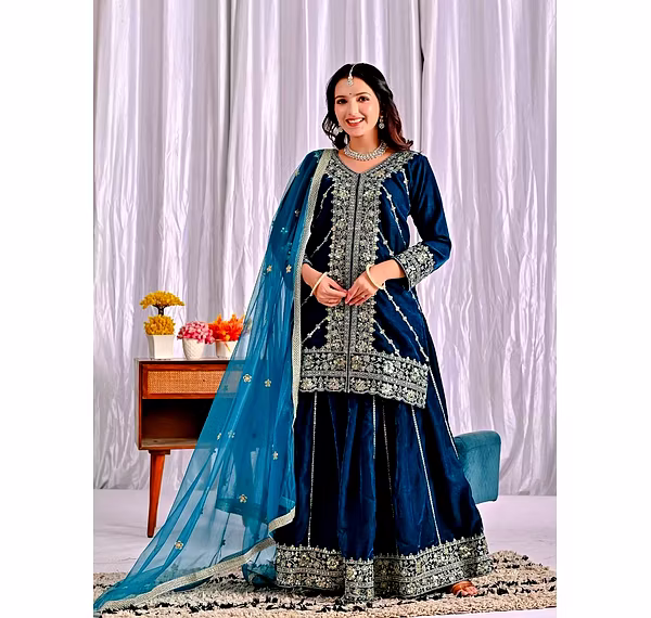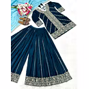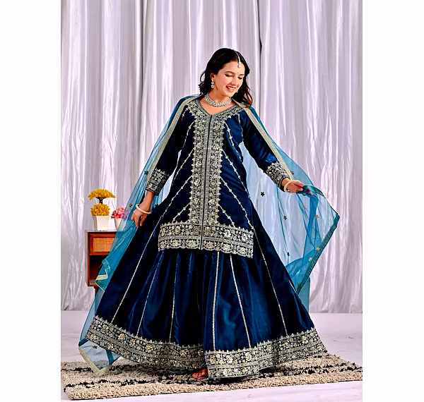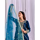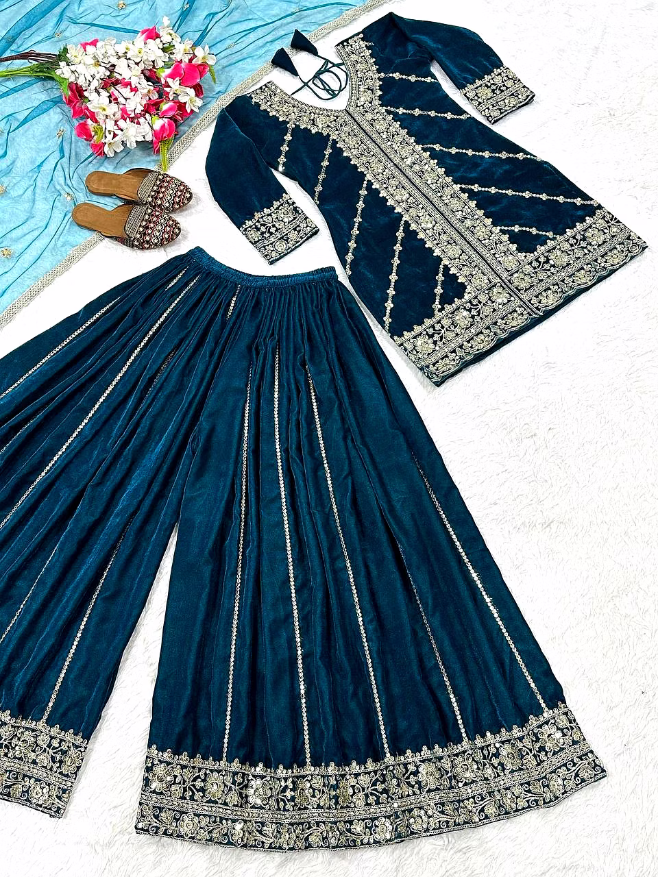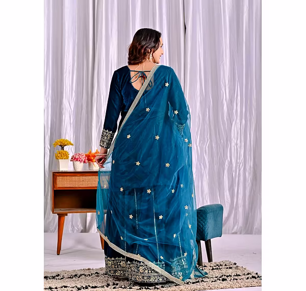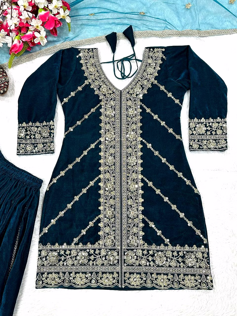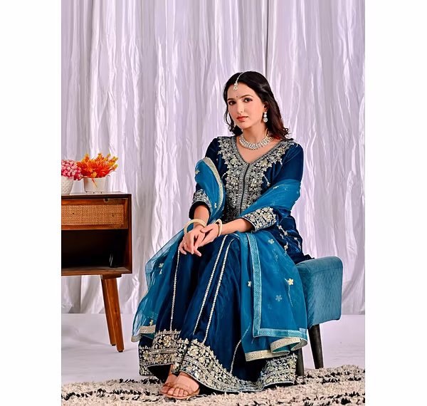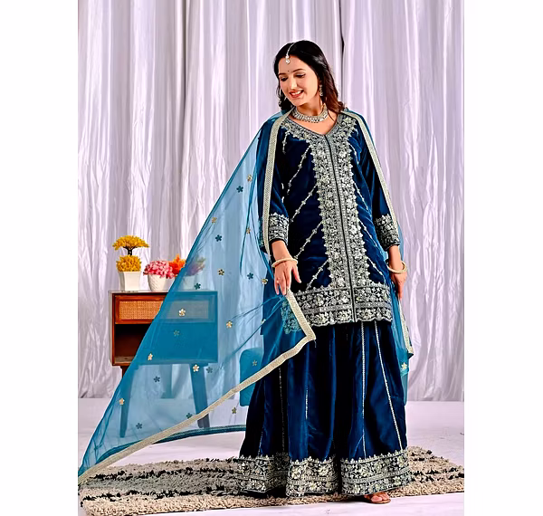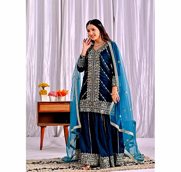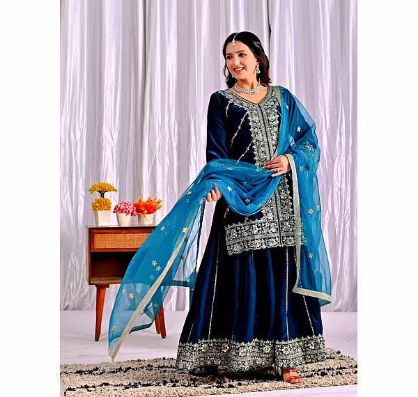 Elevate your festive wardrobe with the Cyan Velvet Sharara Suit, a masterpiece that resonates with sophistication and allure. From the detailed thread embroidery to the rich cyan hue, every element of this outfit is crafted to make you feel exceptional. Shine bright at every event with this luxurious ensemble that promises warmth, comfort, and endless compliments.