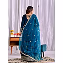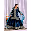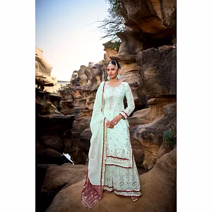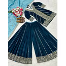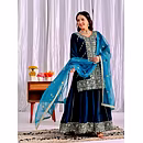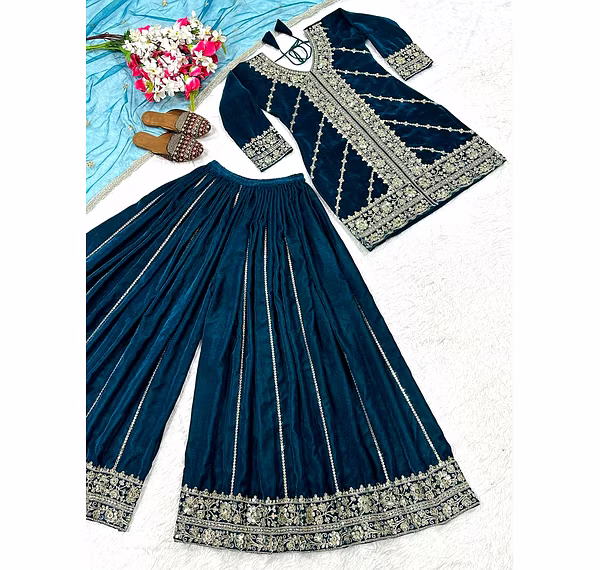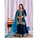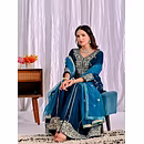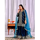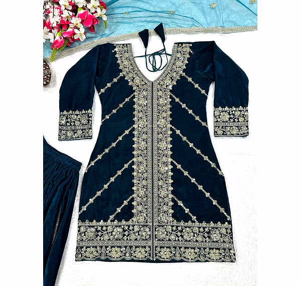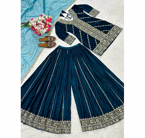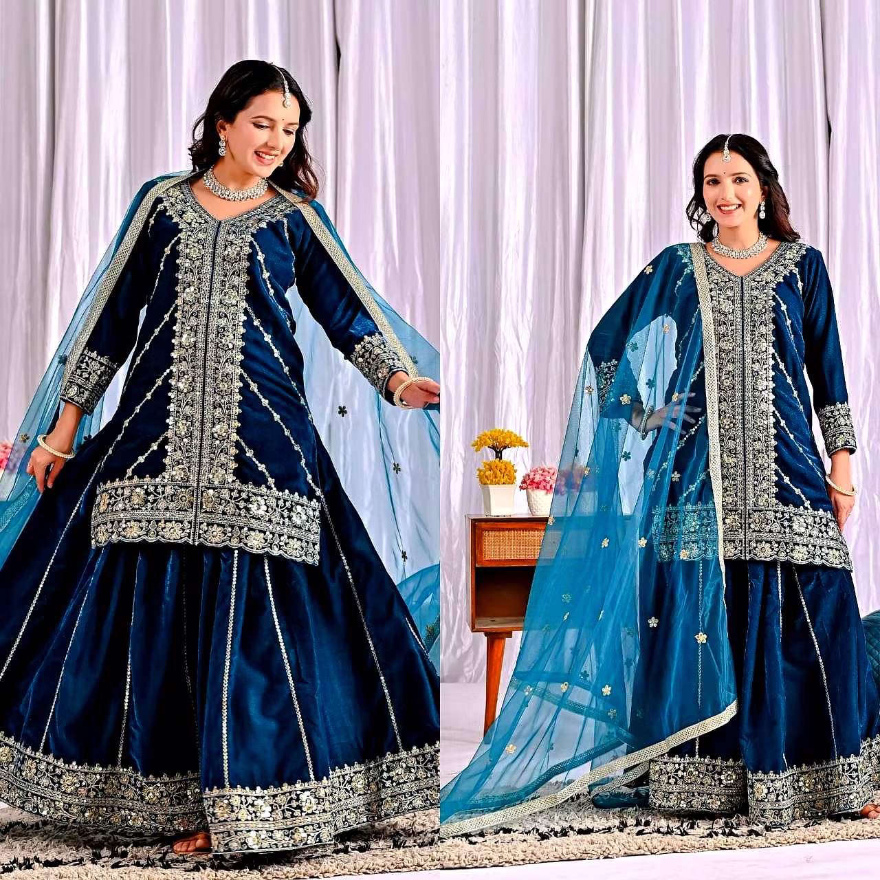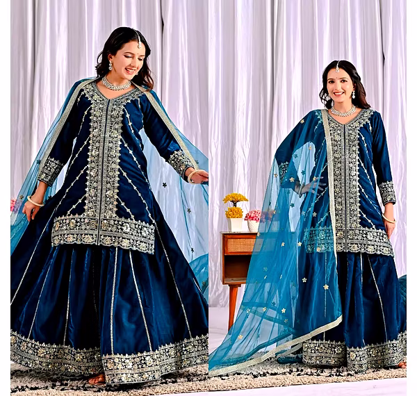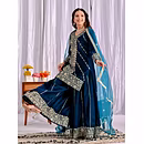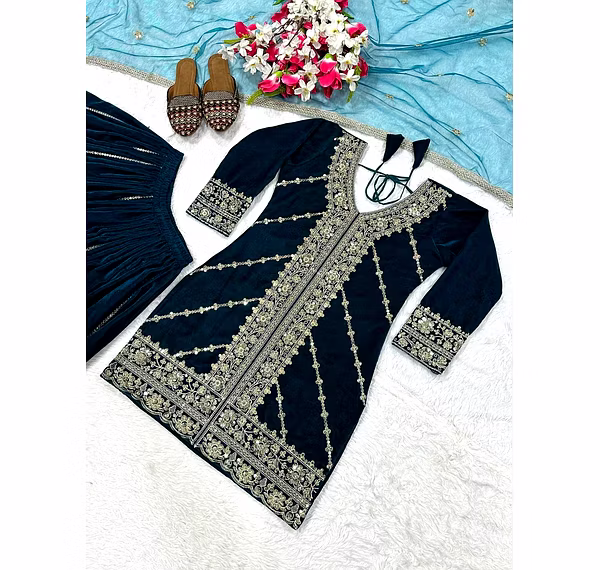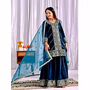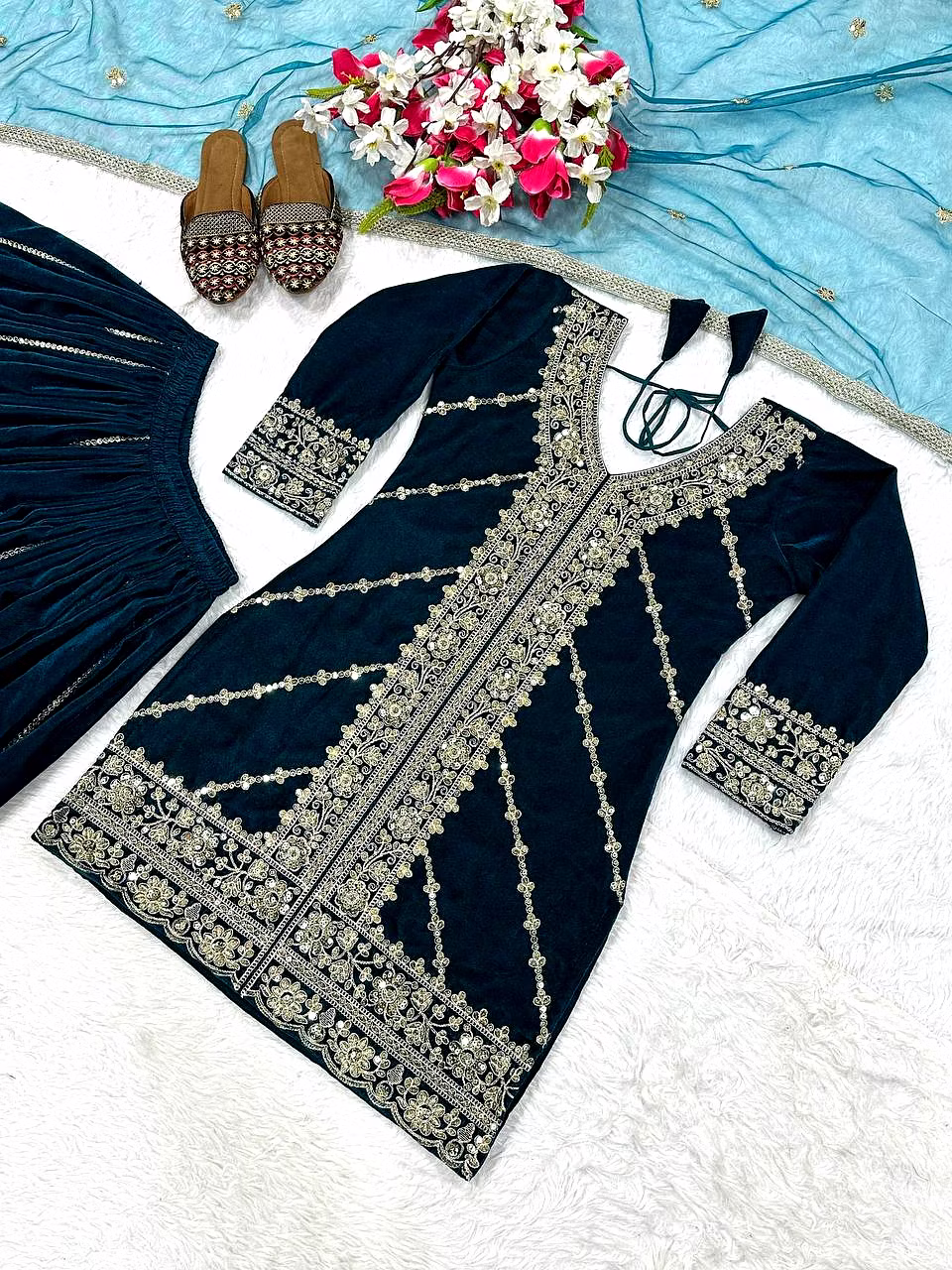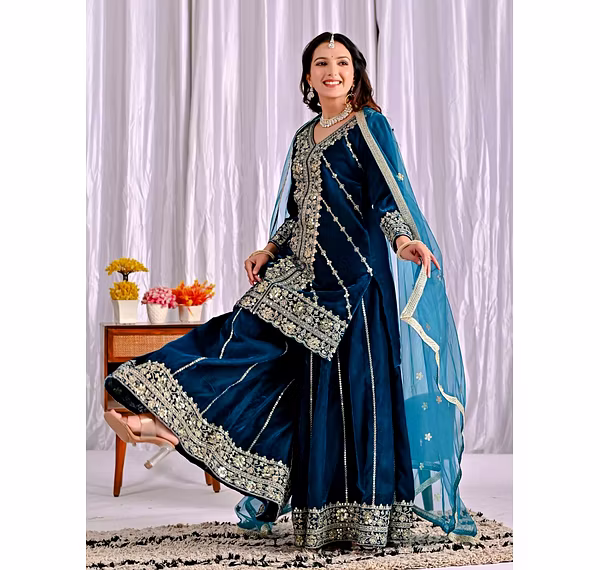 Elevate your festive wardrobe with the Cyan Velvet Sharara Suit, a masterpiece that resonates with sophistication and allure. From the detailed thread embroidery to the rich cyan hue, every element of this outfit is crafted to make you feel exceptional. Shine bright at every event with this luxurious ensemble that promises warmth, comfort, and endless compliments.