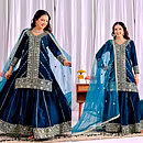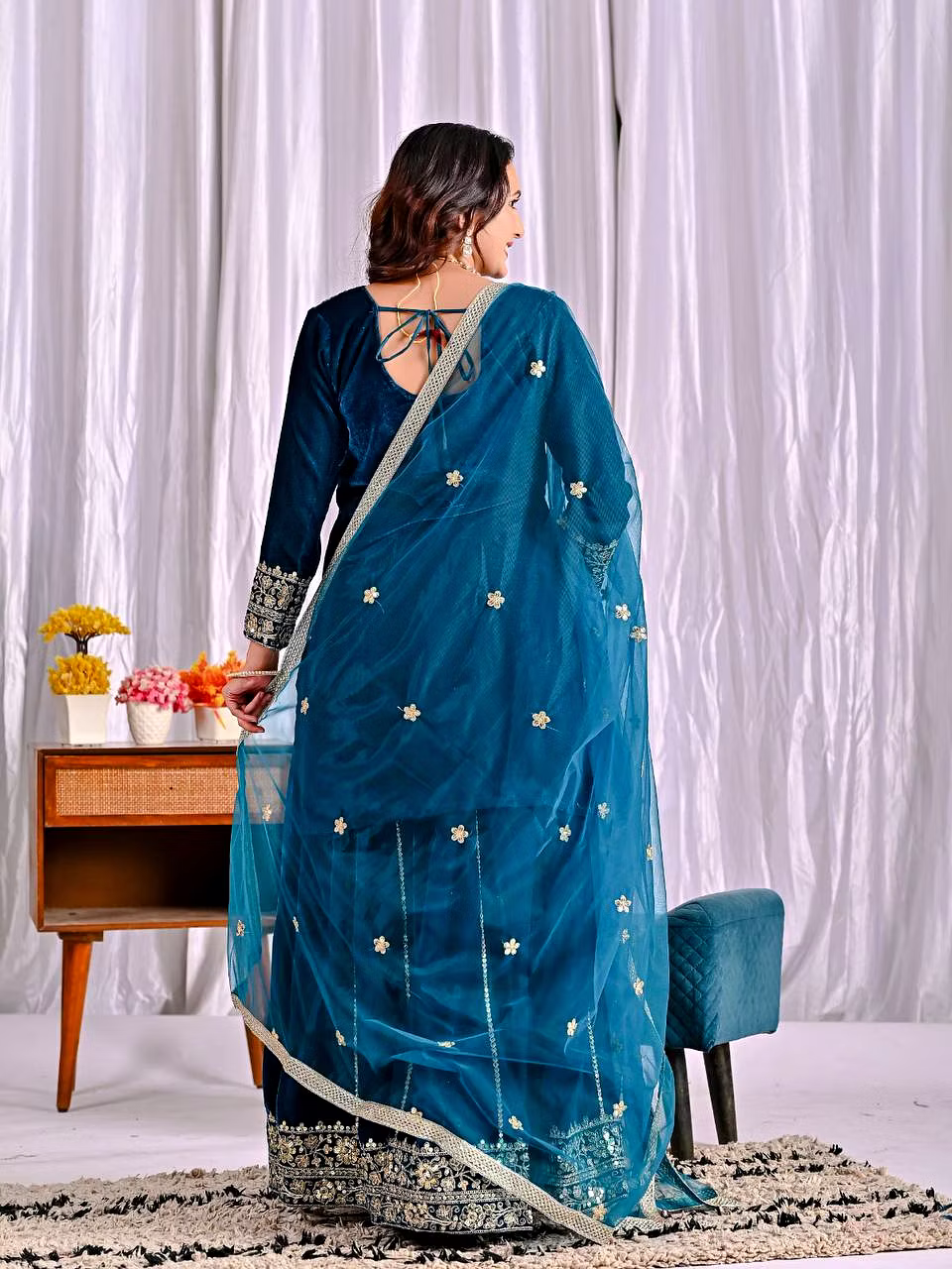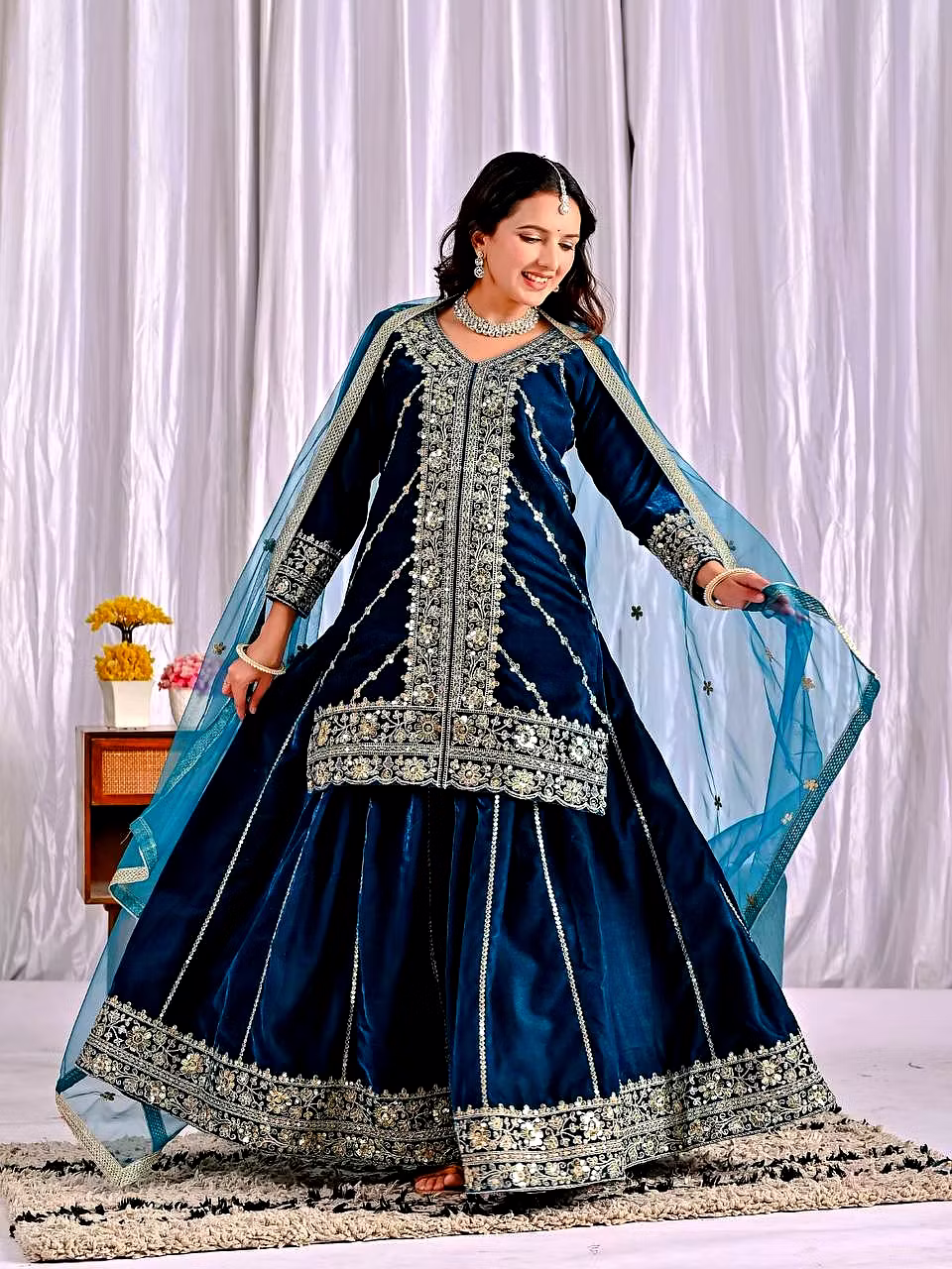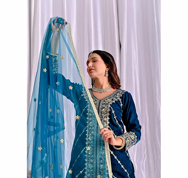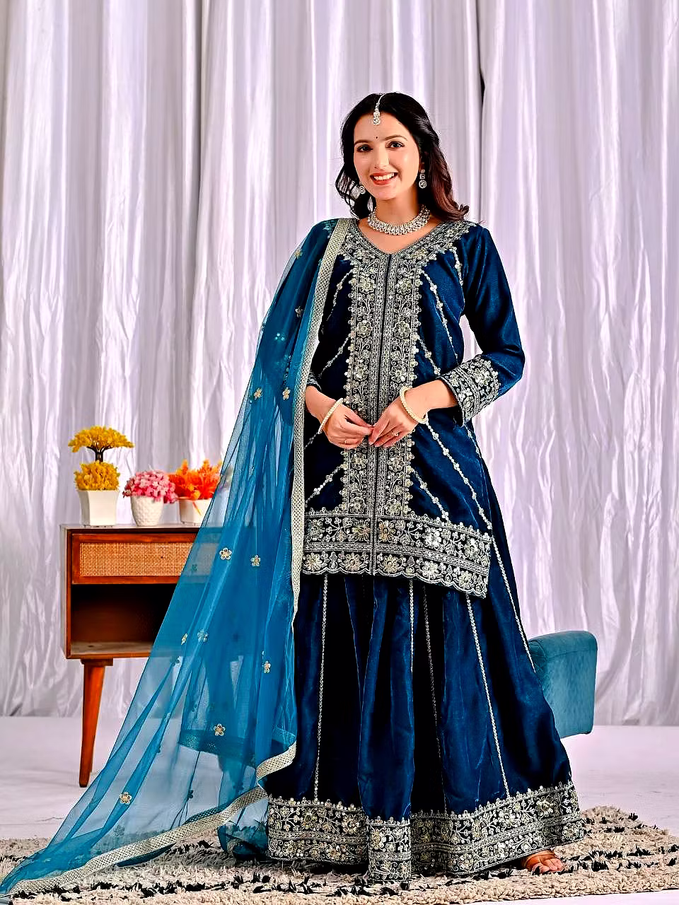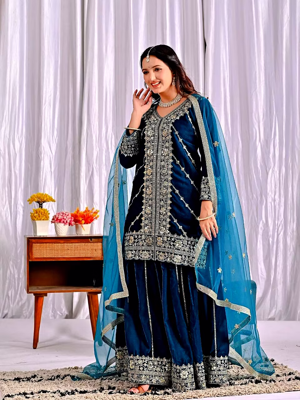 Experience winter luxury with the Cyan Velvet Sharara Suit, a regal outfit that blends bold colors, rich textures, and festive elegance. Perfect for celebrations and special events.
