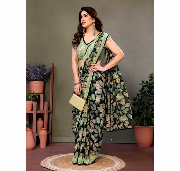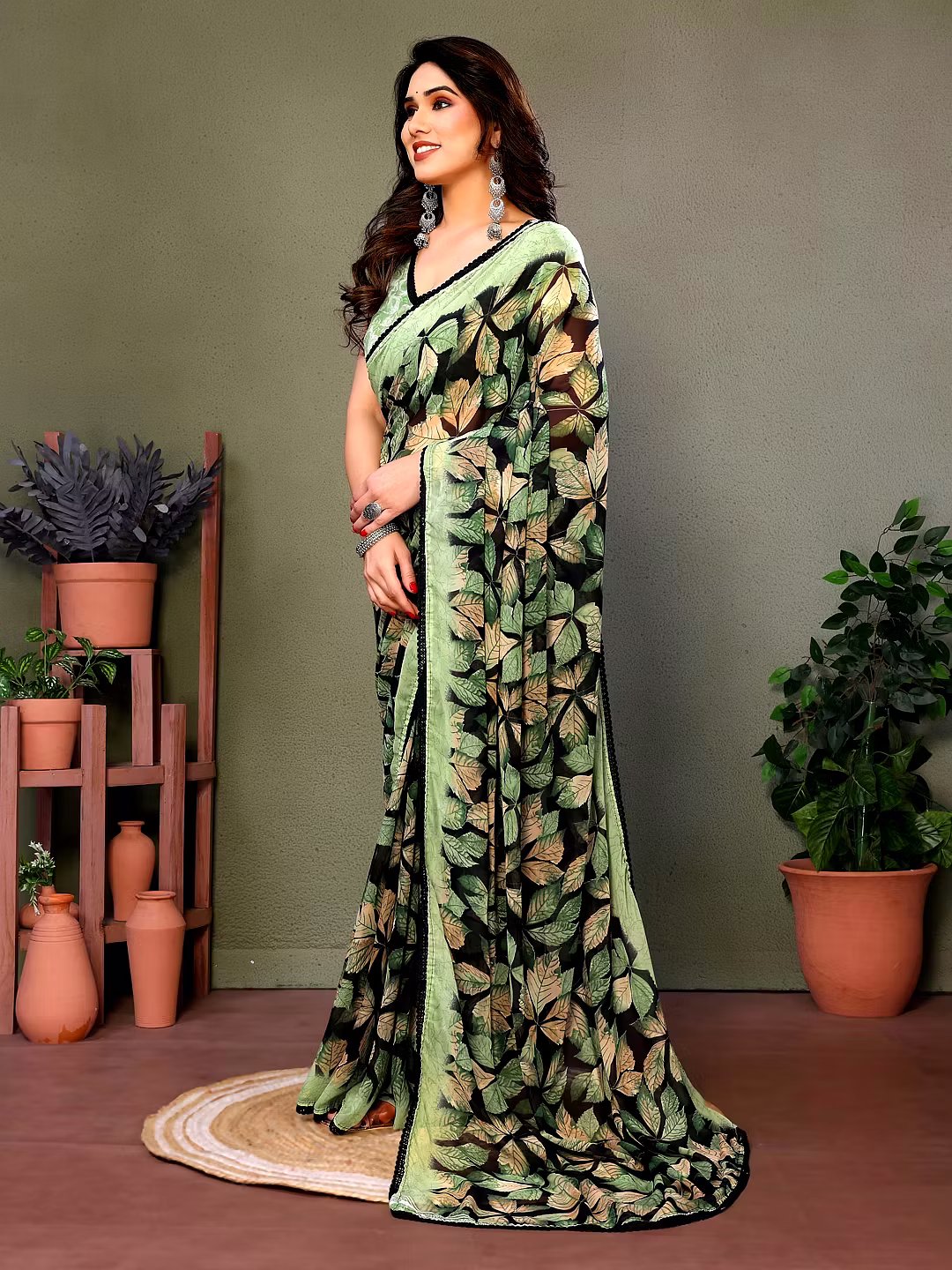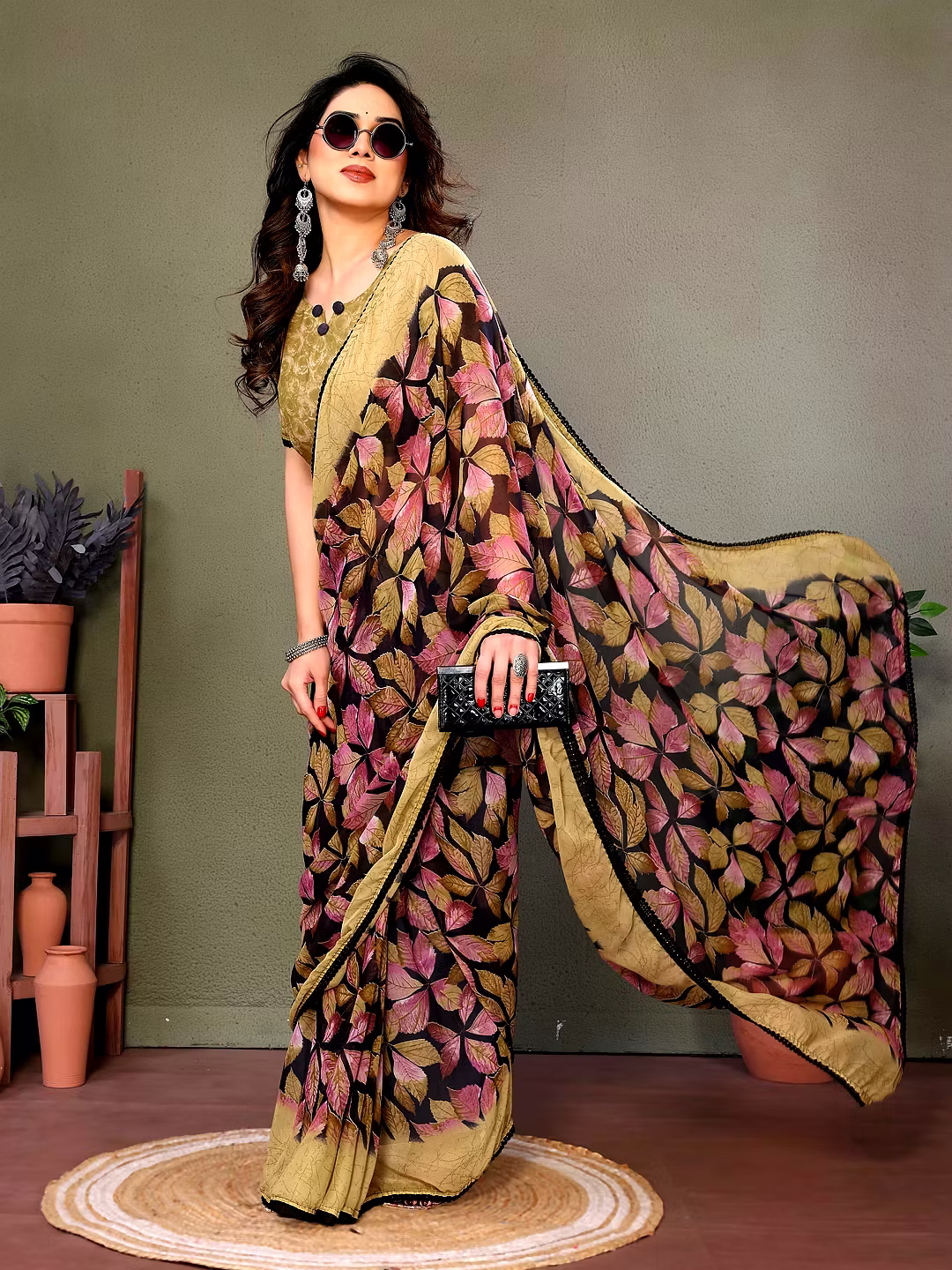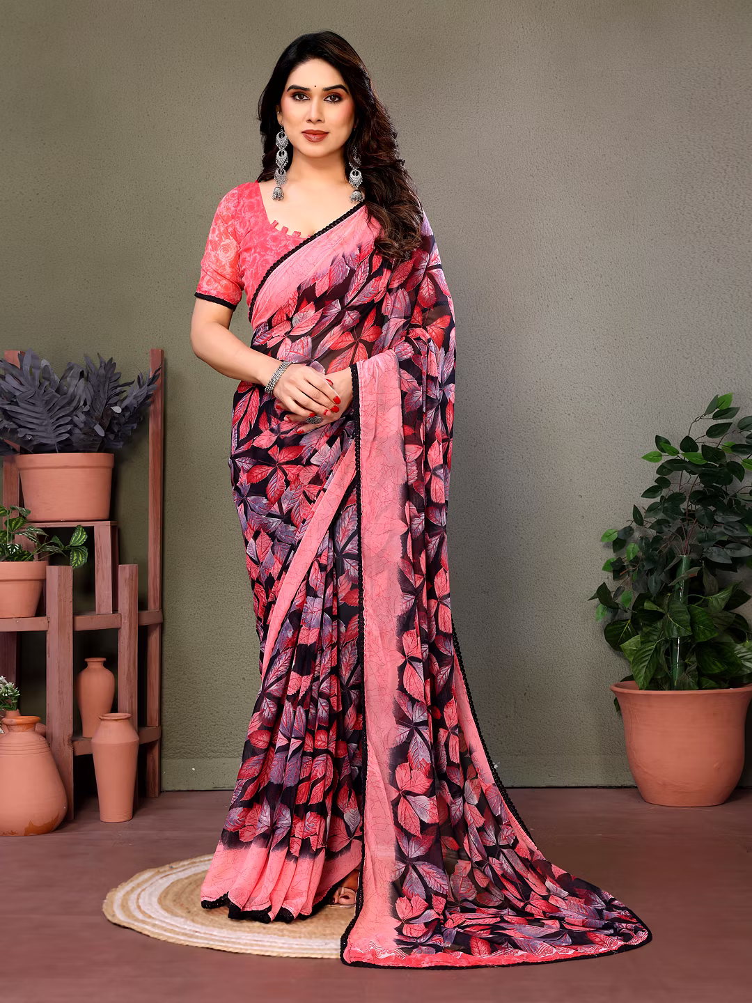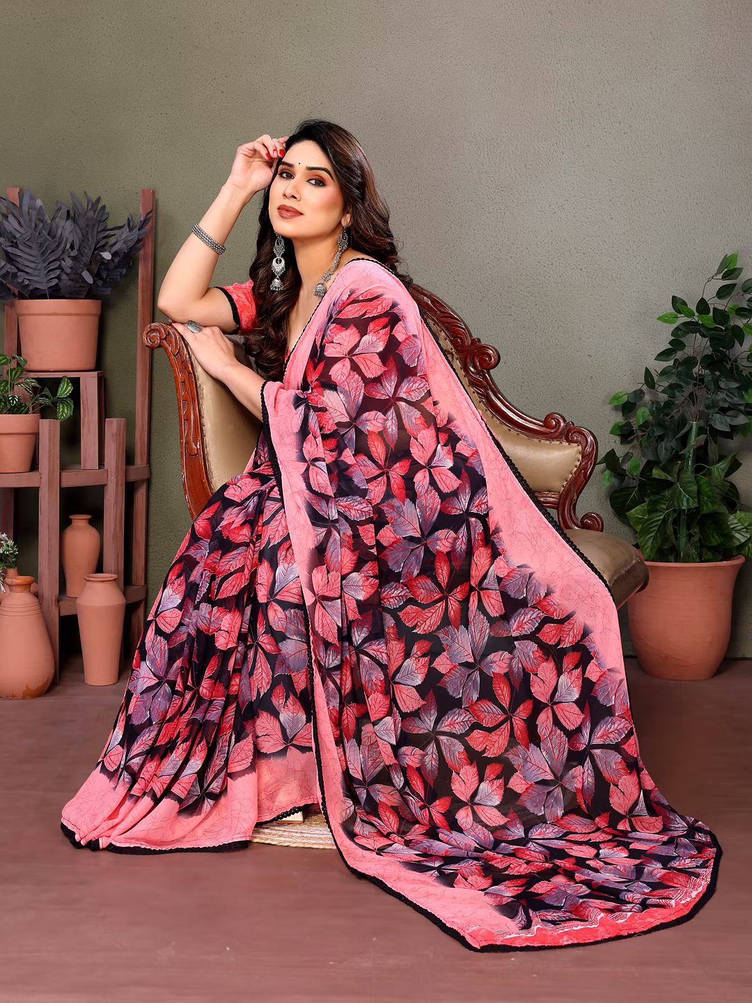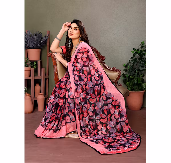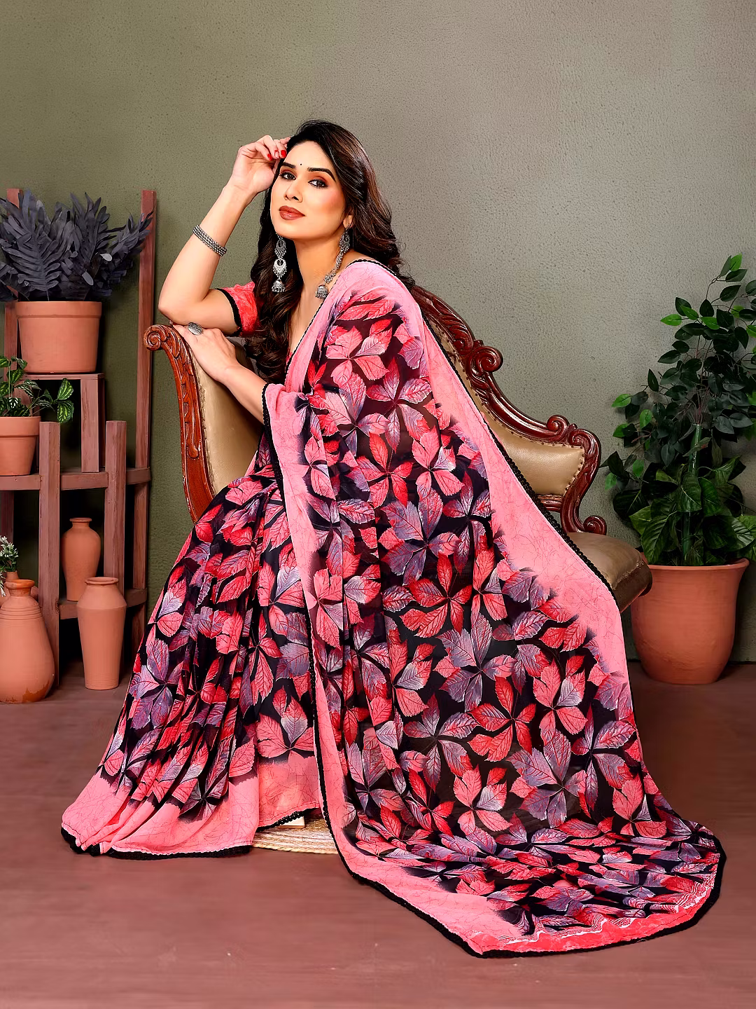 Indulge in the beauty of designer prints on our georgette saree. The intricate patterns and vibrant colors add a touch of sophistication to your look. With a range of designs to choose from, you'll find the perfect saree for every mood and occasion.