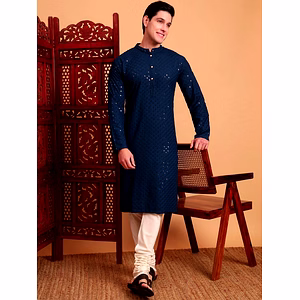 Deep Blue Ritesh Chest Embroidery Designed Cotton Men's Kurta