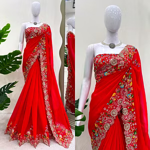 Imagine the allure of cascading sequins that shimmer in the light, creating a mesmerizing spectacle. Feel the luxurious drape of high-quality georgette fabric against your skin, exuding sophistication and royalty.