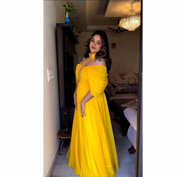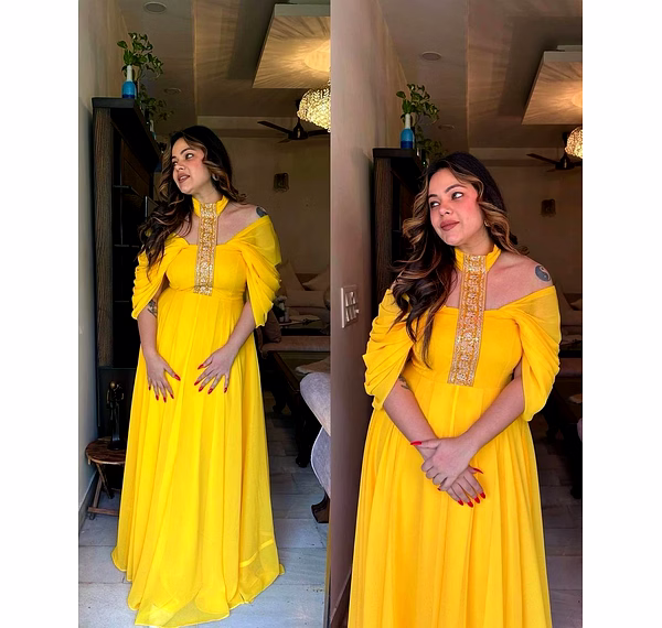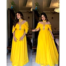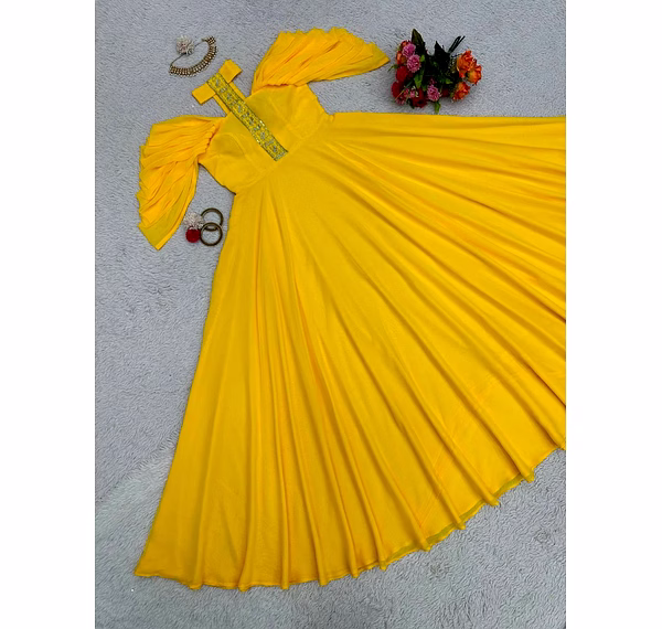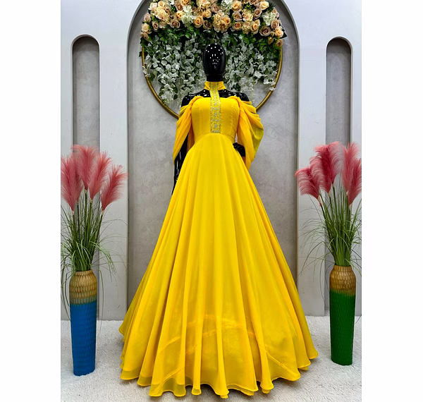 The Designer Padded Gown is a stunning piece of attire that exudes elegance and sophistication. Crafted from high-quality georgette fabric, this gown promises to make you feel like a true fashionista. The intricate thread and sequence work on this gown adds a touch of glamour and dazzle, making it perfect for any special occasion. The meticulous craftsmanship is evident in every stitch, ensuring that you stand out from the crowd and make a lasting impression. Available in sizes M-XL, this gown is designed to flatter various body types and sizes. The comfortable fit allows for ease of movement, making it ideal for events that require you to dance the night away or socialize with grace and poise. The 8-meter flair of this gown adds a dramatic and ethereal element to your overall look. As you twirl and spin, the gown gracefully flows, creating a mesmerizing visual effect that is sure to turn heads. Weighing only 0.600 grams, this gown is lightweight and easy to wear, ensuring that you remain comfortable throughout the event. The padded design not only enhances the silhouette but also provides additional support and structure, allowing you to feel confident and at ease. This Designer Padded Gown is a must-have addition to any fashion-conscious woman's wardrobe. Whether it's a wedding, cocktail party, or red carpet event, this gown will make you the center of attention. Its timeless appeal and impeccable craftsmanship ensure that it will remain a statement piece for years to come. So why wait? Embrace your inner fashionista and make a statement with the Designer Padded Gown.