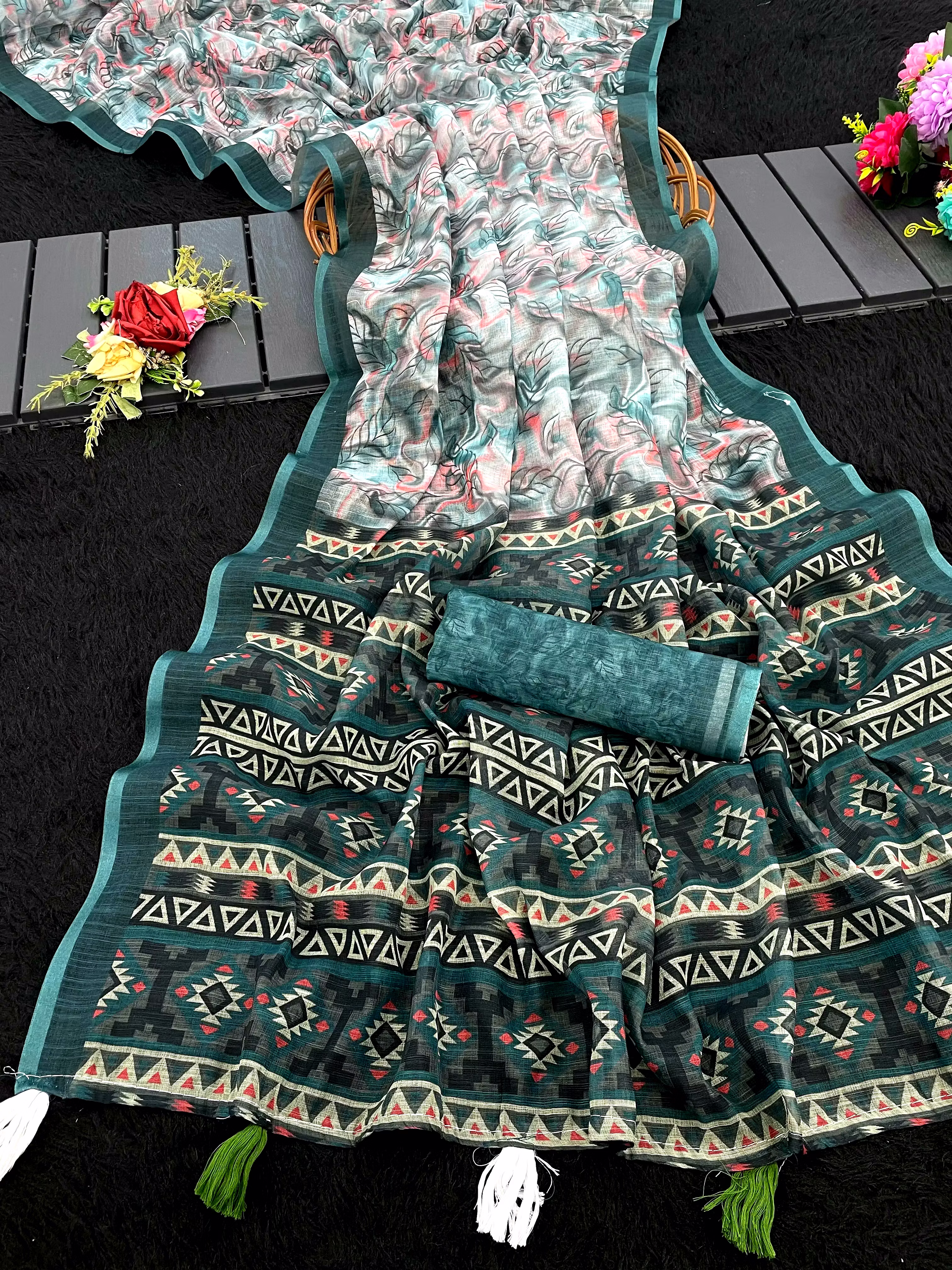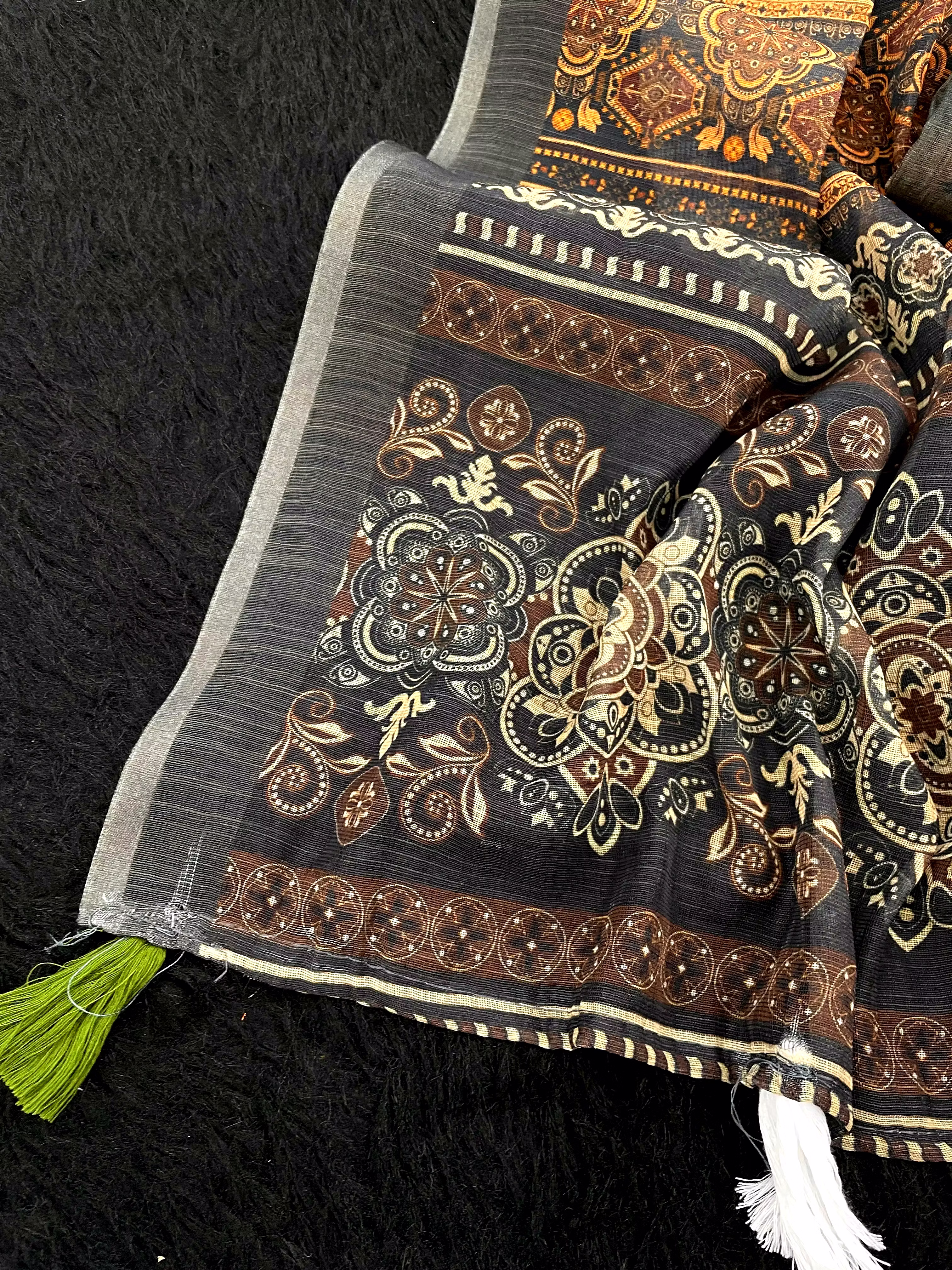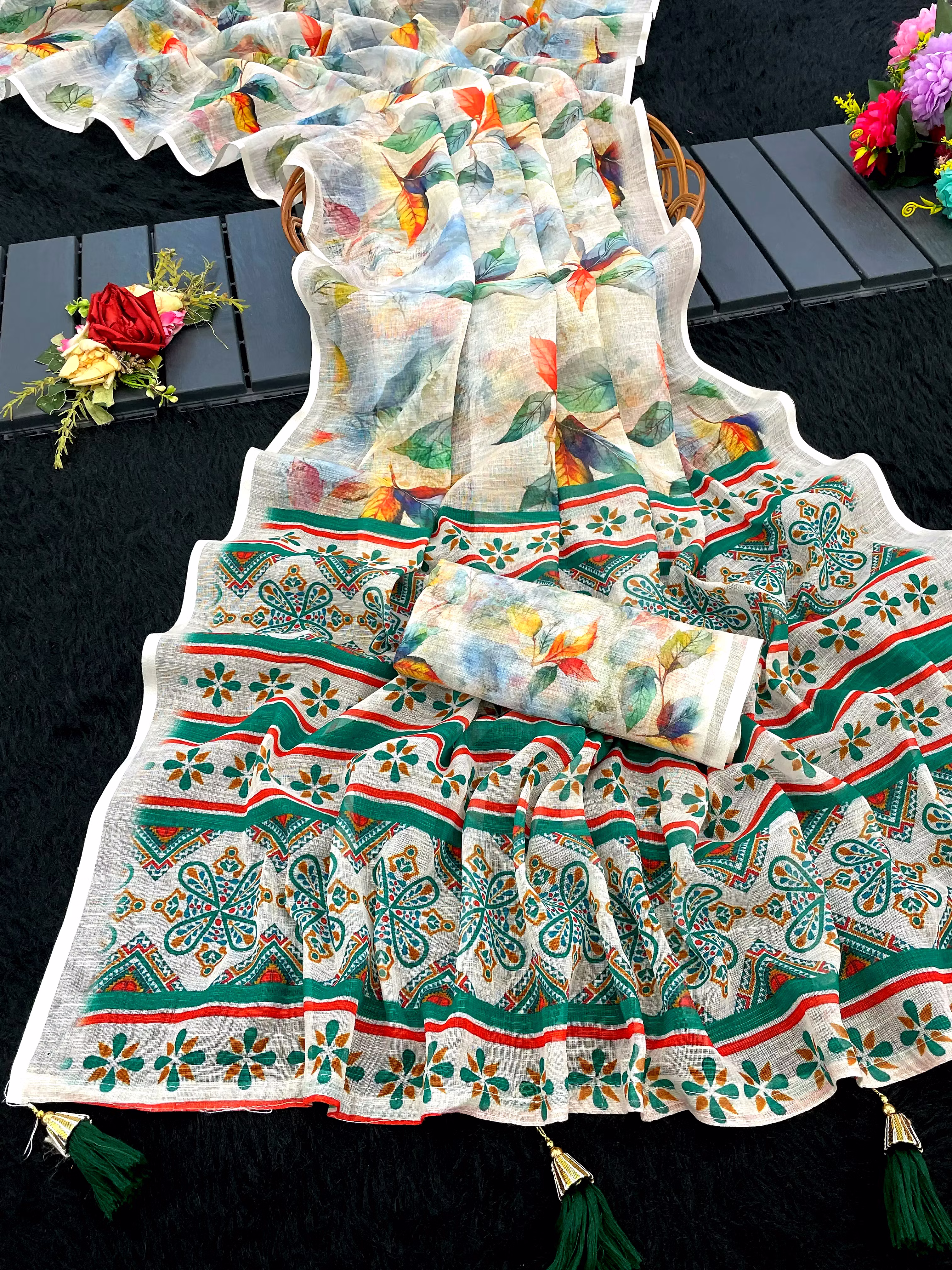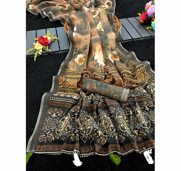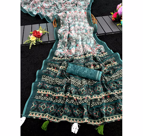 Wrap yourself in elegance with our Digital Print Linen Saree with Latkan. This exquisite saree exudes sophistication and style, perfect for any occasion.