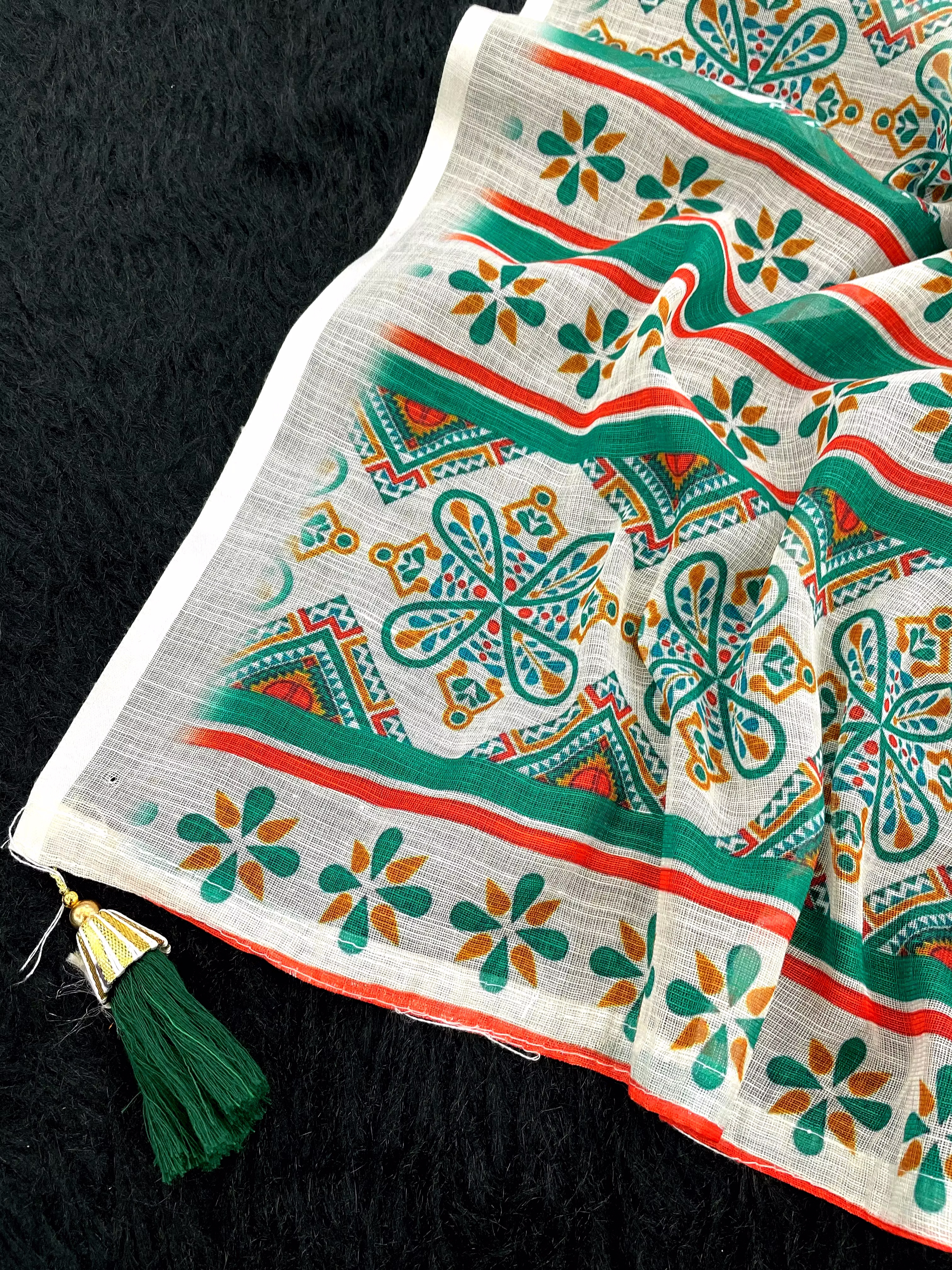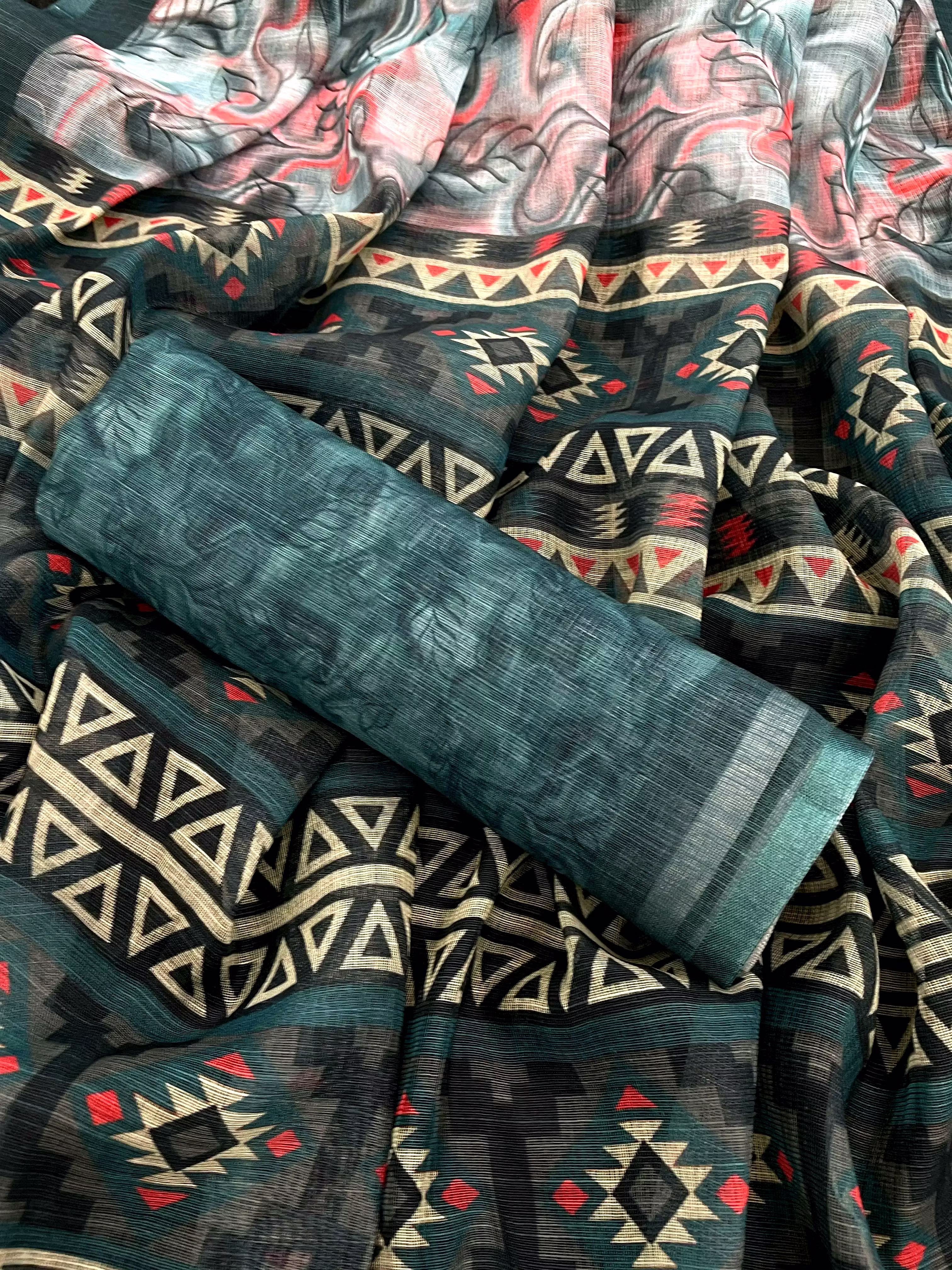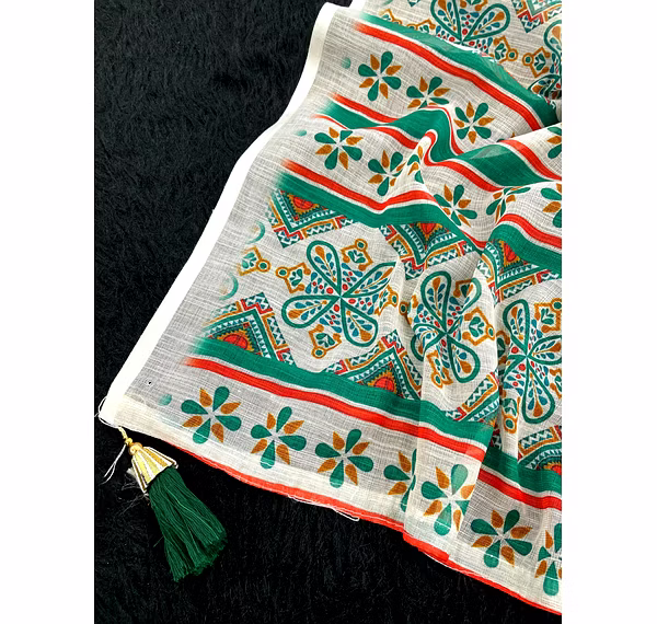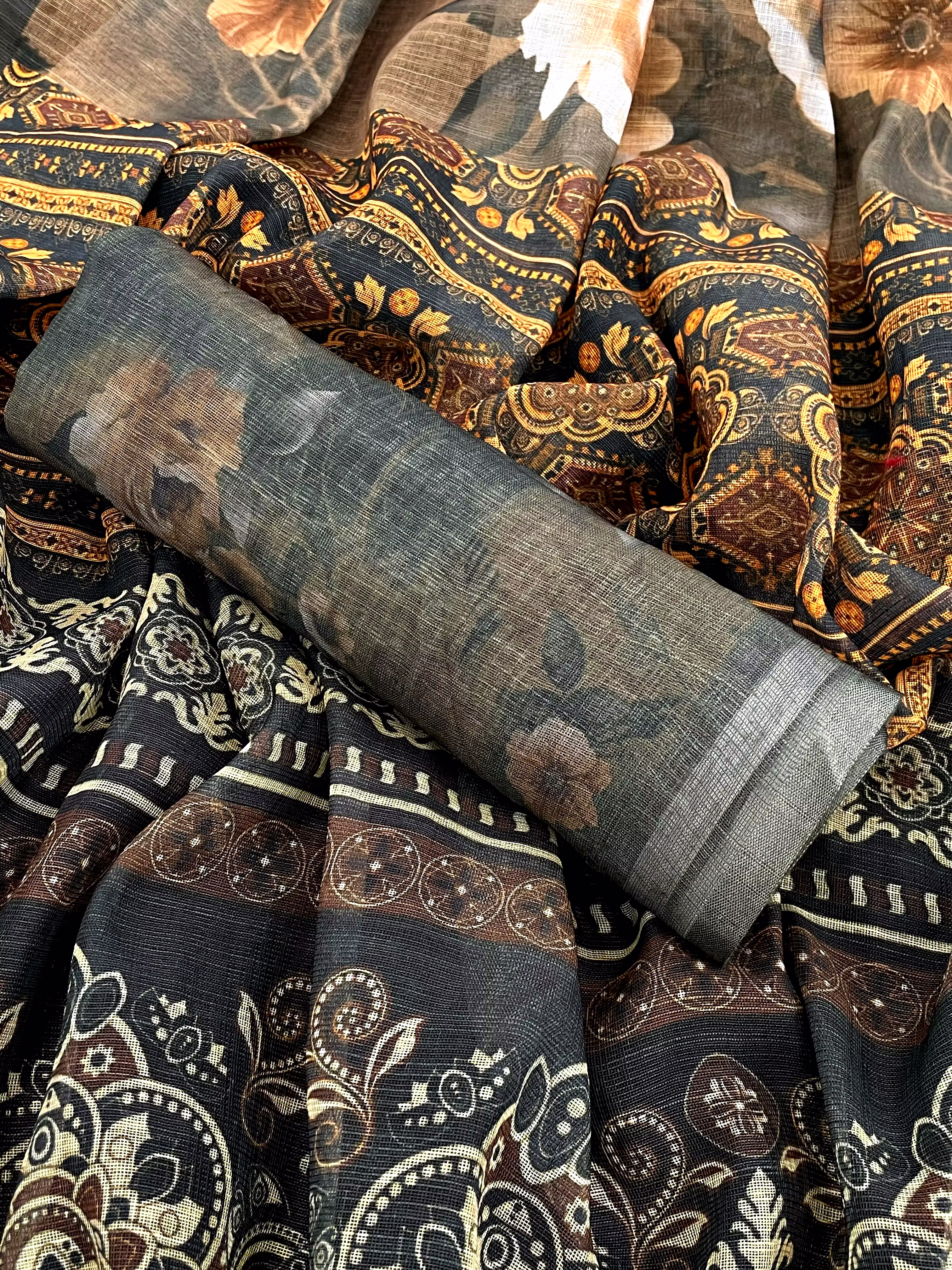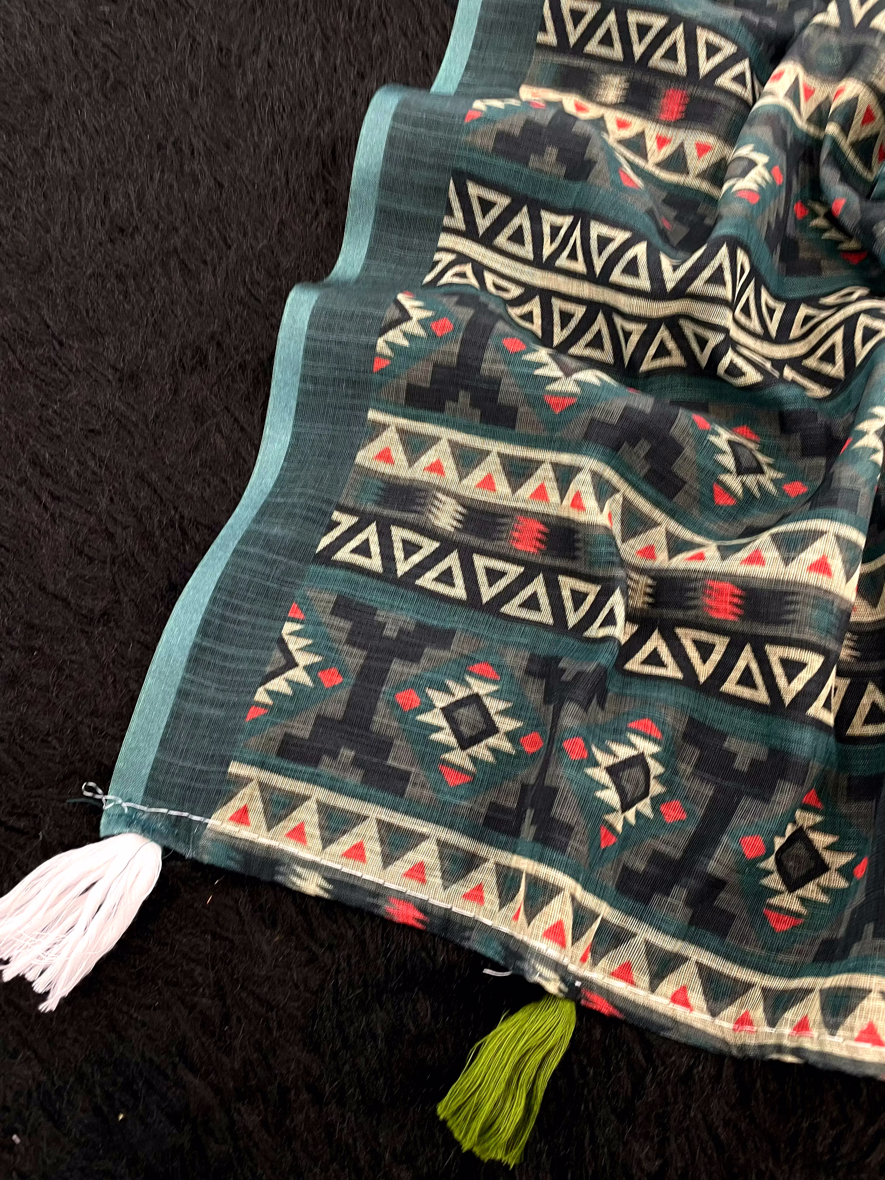 Wrap yourself in elegance with our Digital Print Linen Saree with Latkan. This exquisite saree exudes sophistication and style, perfect for any occasion.