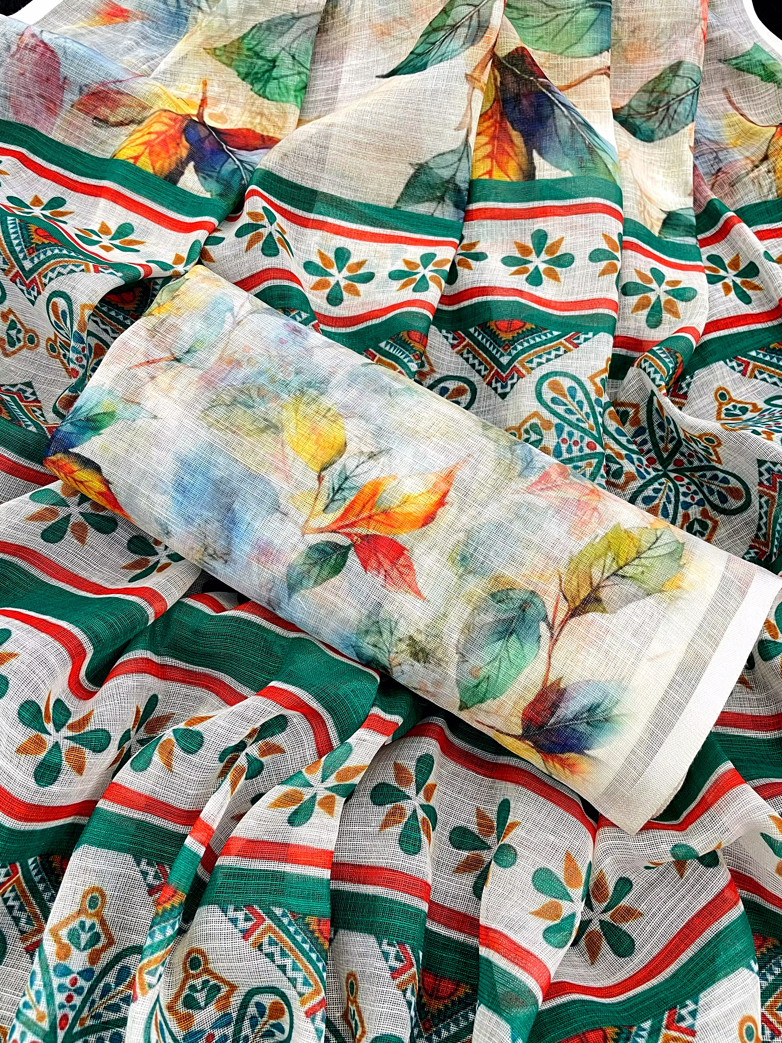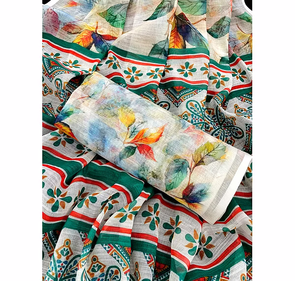 Step into the spotlight with our Digital Print Linen Saree. The intricate details and vibrant colors of this saree will make you the center of attention at any event.
