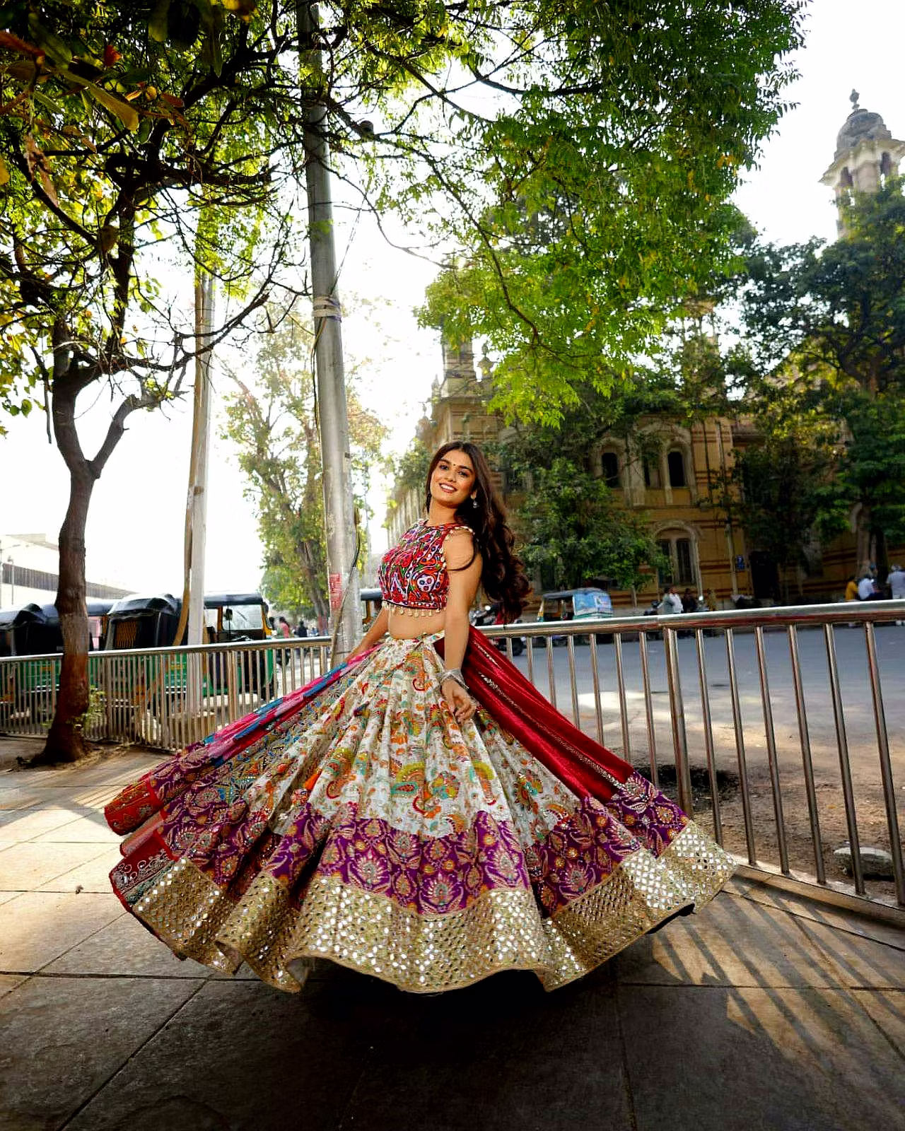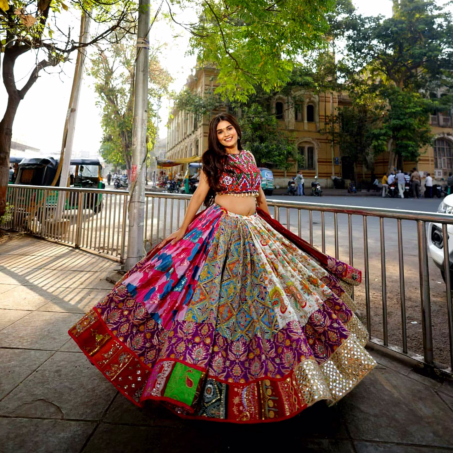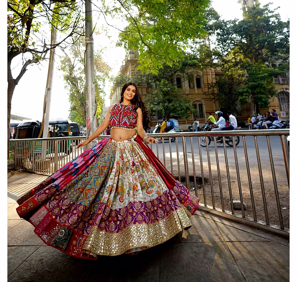 The colorful digital print design of this lehenga choli captures the essence of Navratri, bringing a burst of joy and energy to your outfit. Dance with confidence and radiate positivity in this vibrant ensemble.