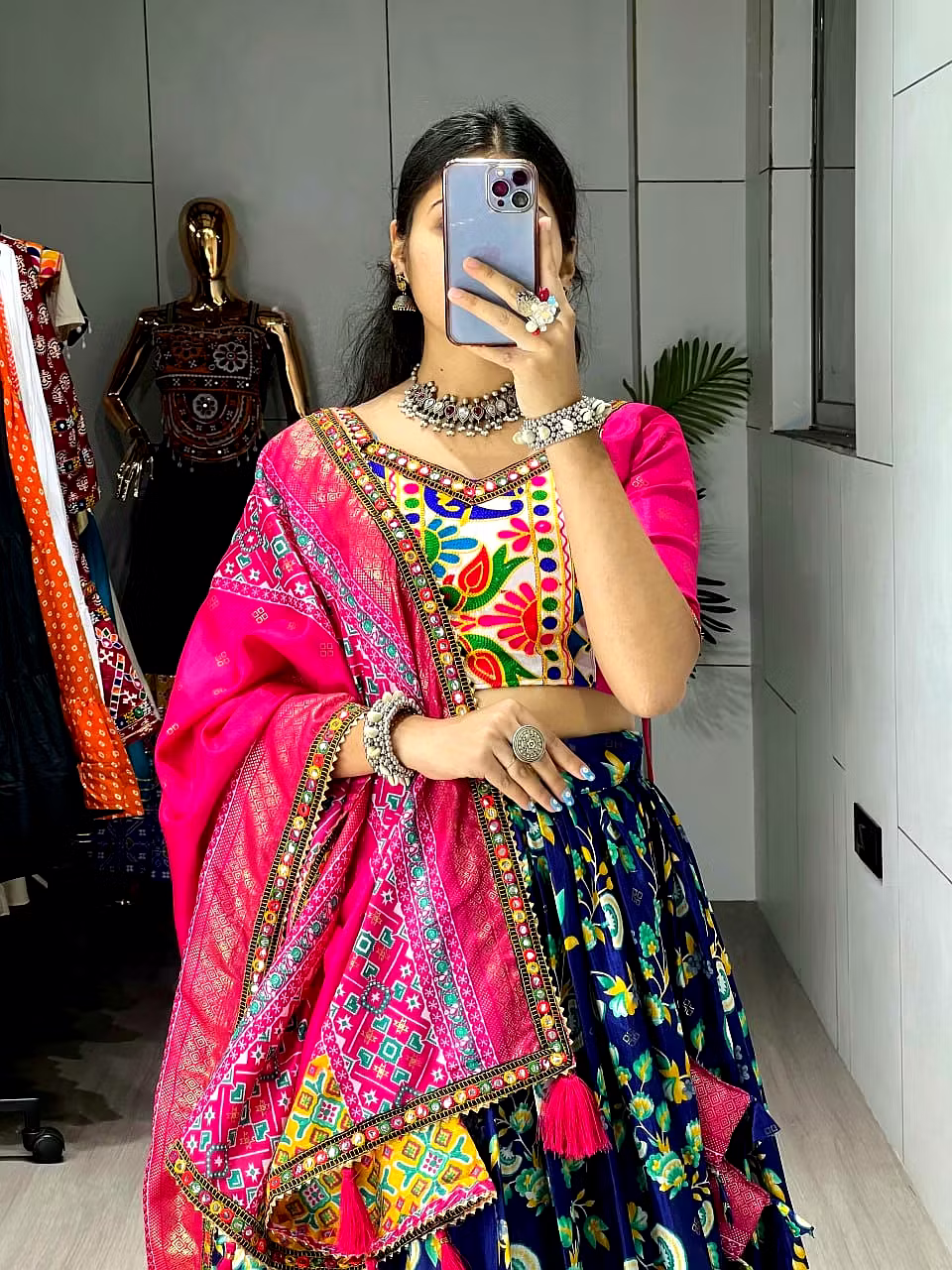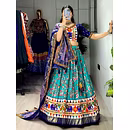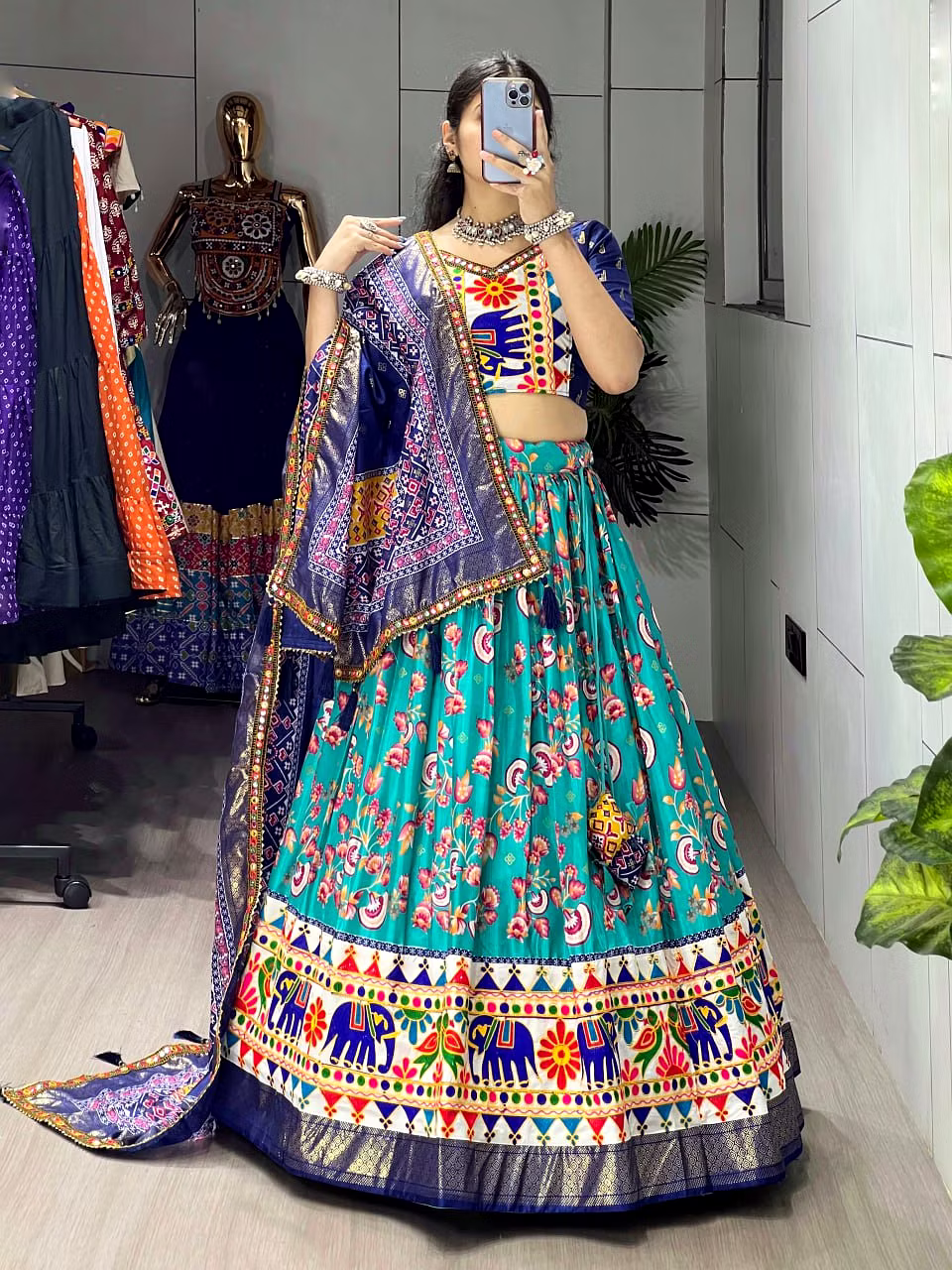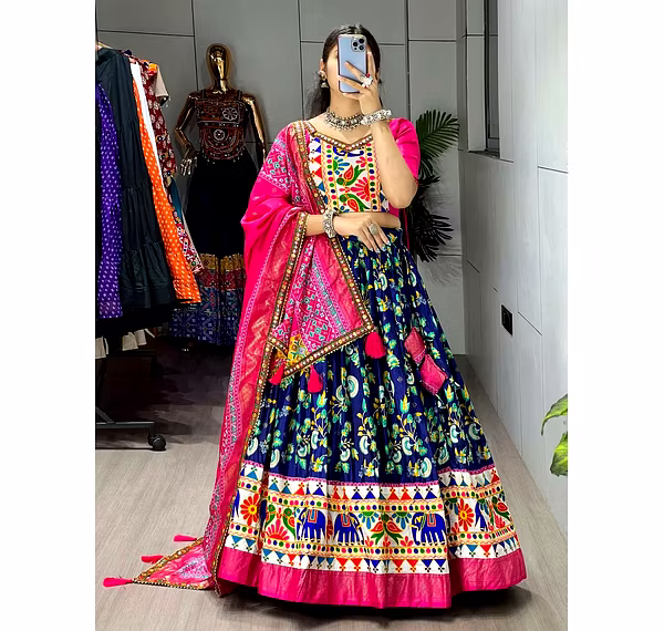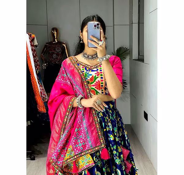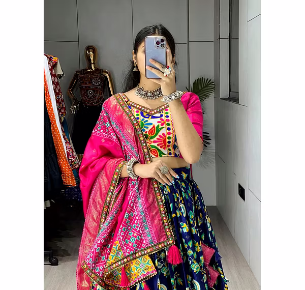 Embrace the vibrance of Navratri celebrations with this exquisite Patola Lehenga. The vibrant colors and exquisite Gamthi work border add a touch of grace, ensuring you stand out with sheer elegance.