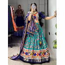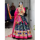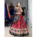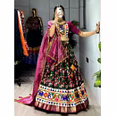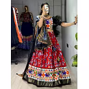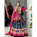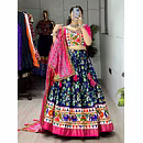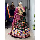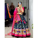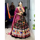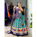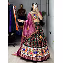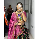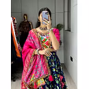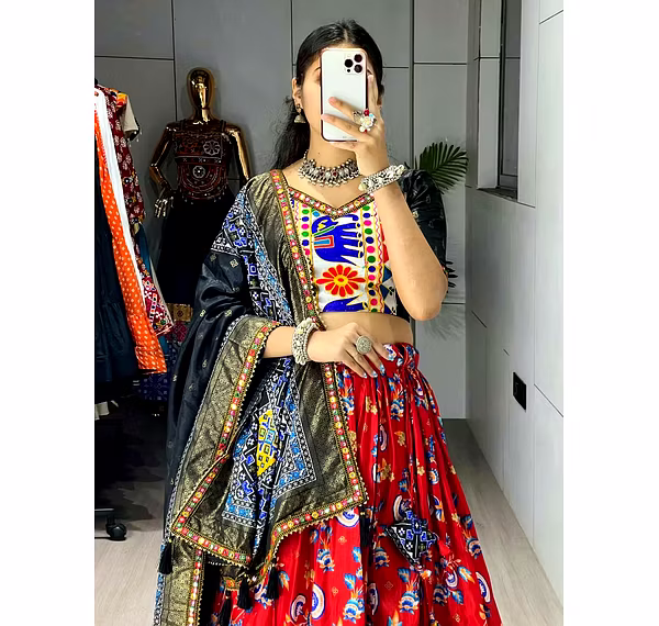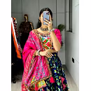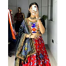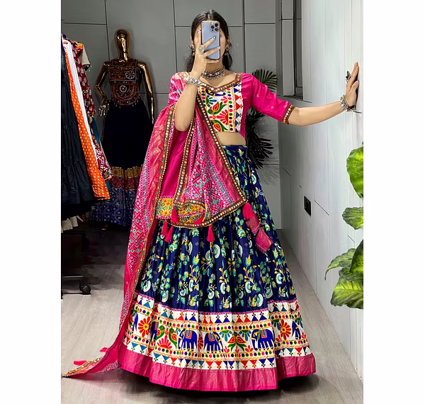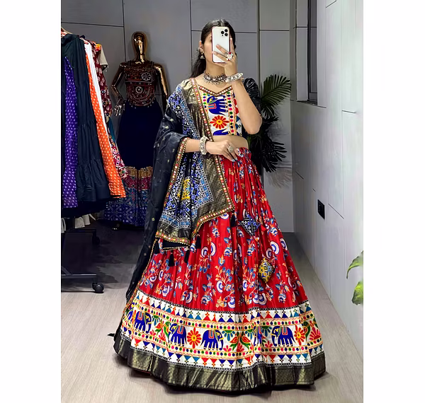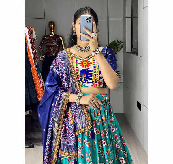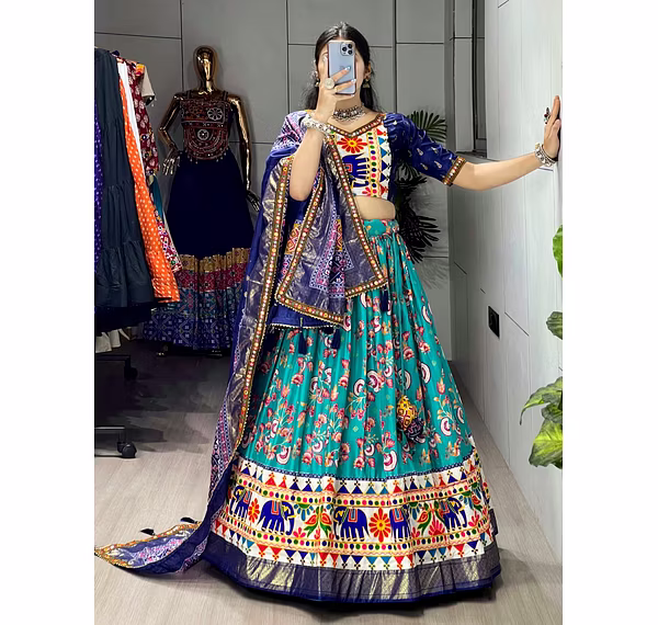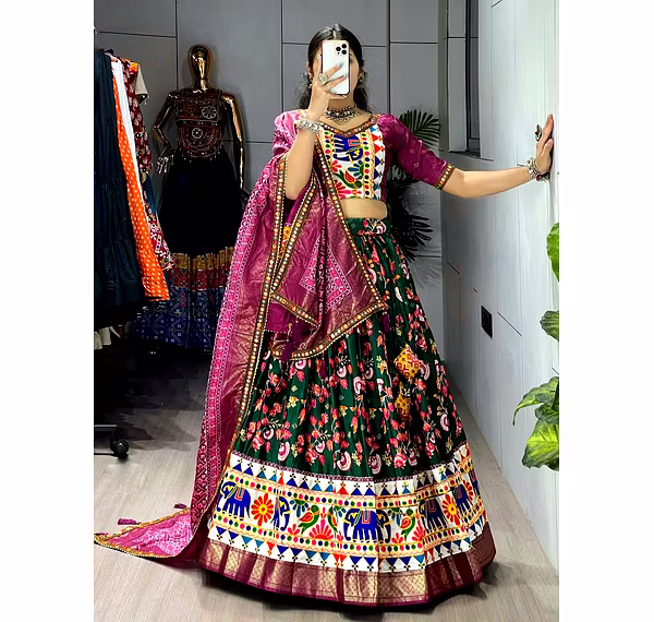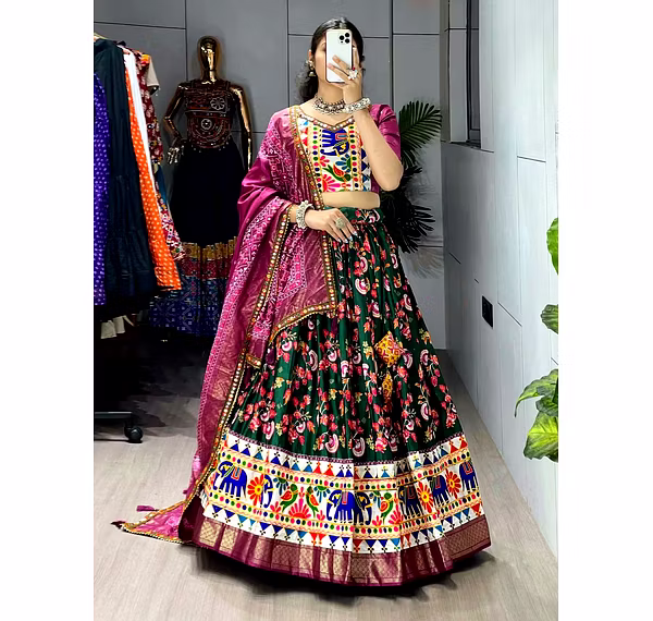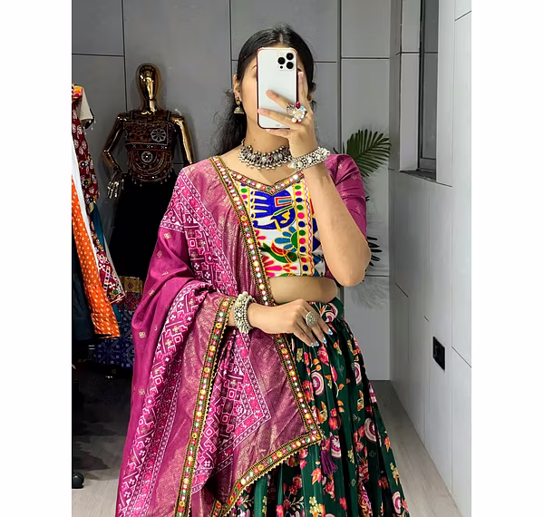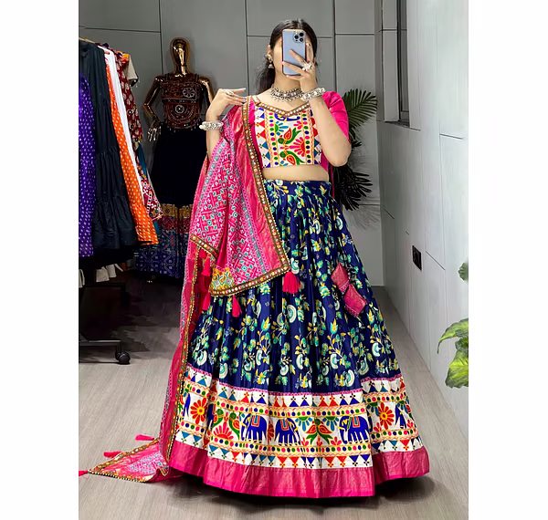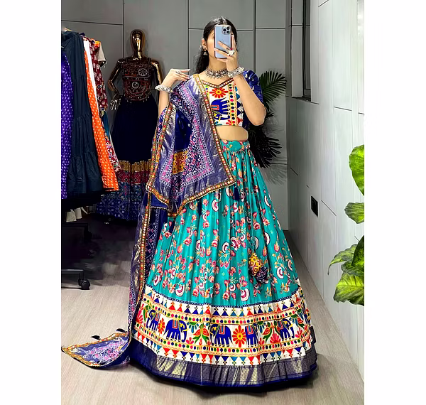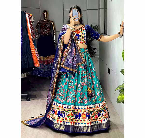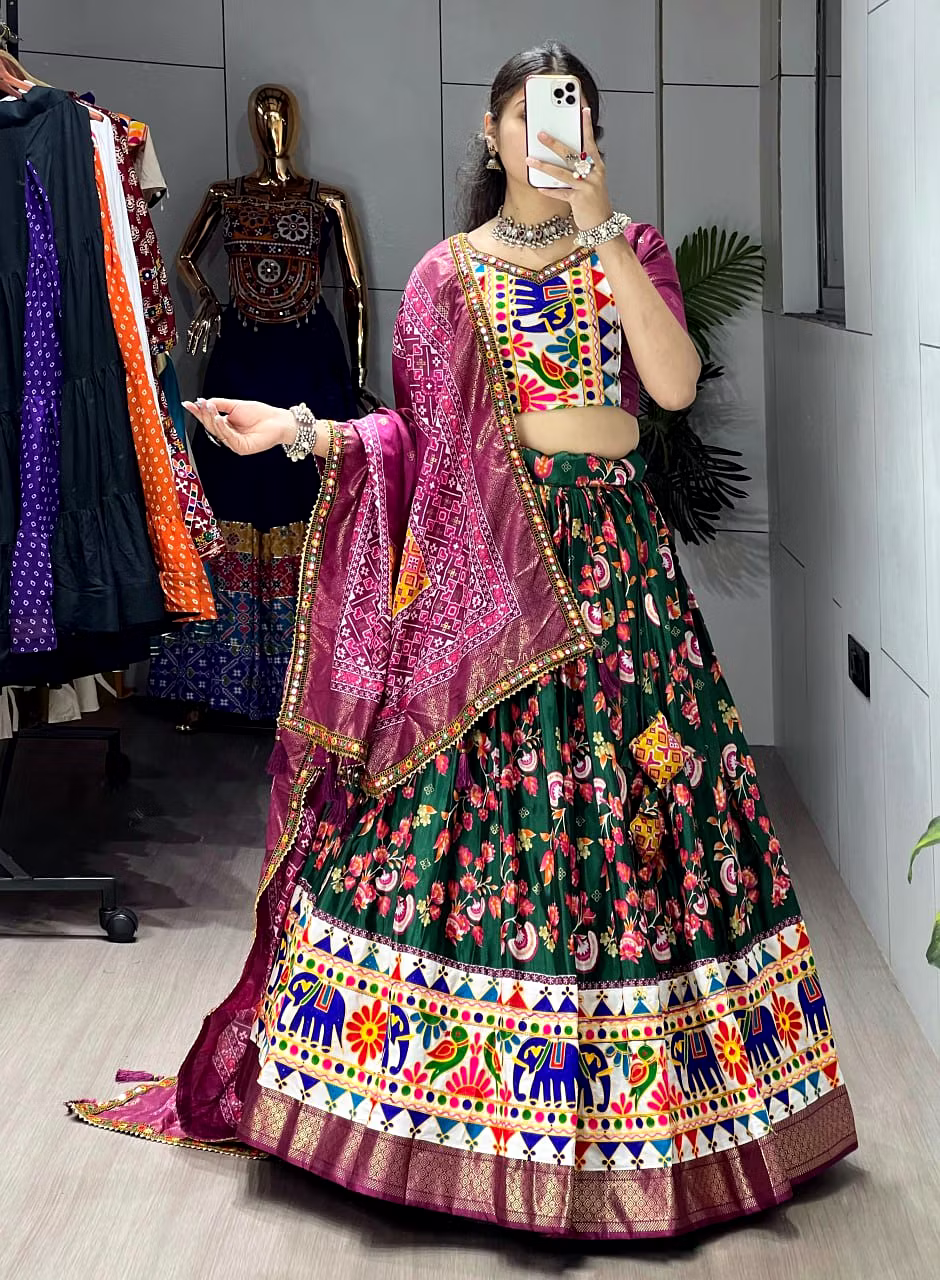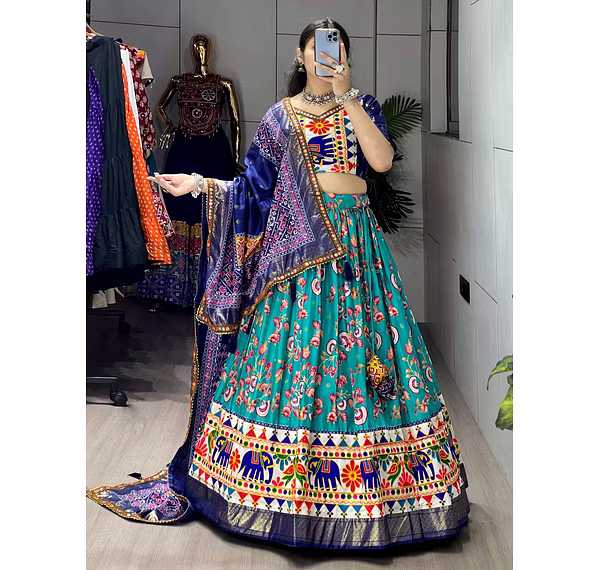 Elevate your Navratri look with our exquisite Dola Silk Patola Lehenga featuring stunning Gamthi work border. Perfect for festive celebrations.
