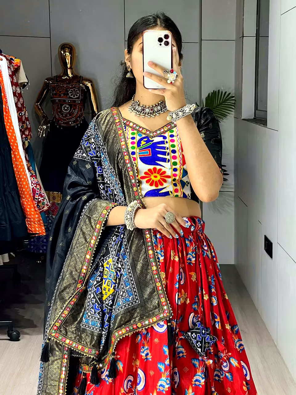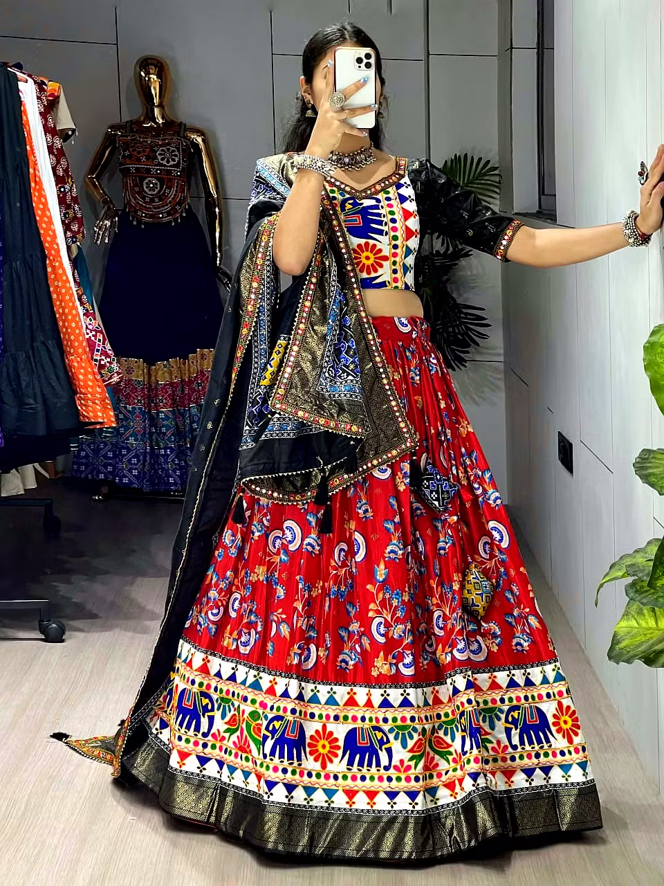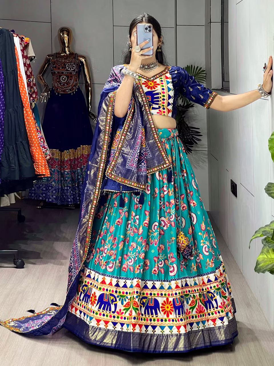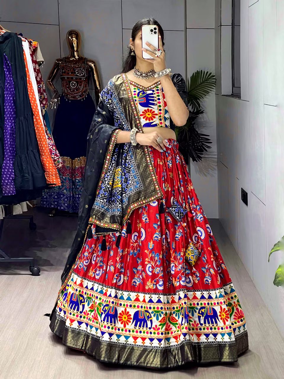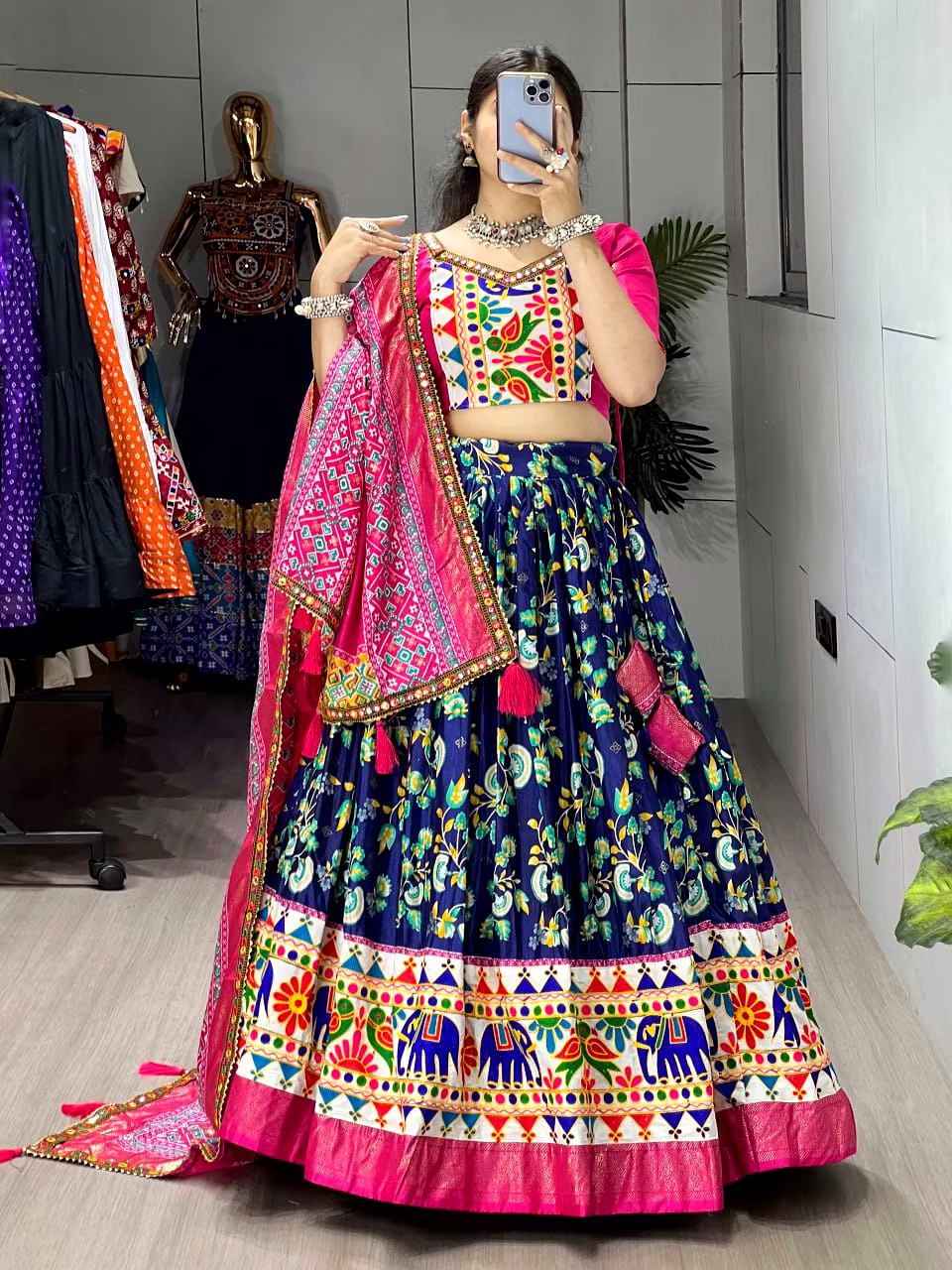 Elevate your Navratri look with our exquisite Dola Silk Patola Lehenga featuring stunning Gamthi work border. Perfect for festive celebrations.
