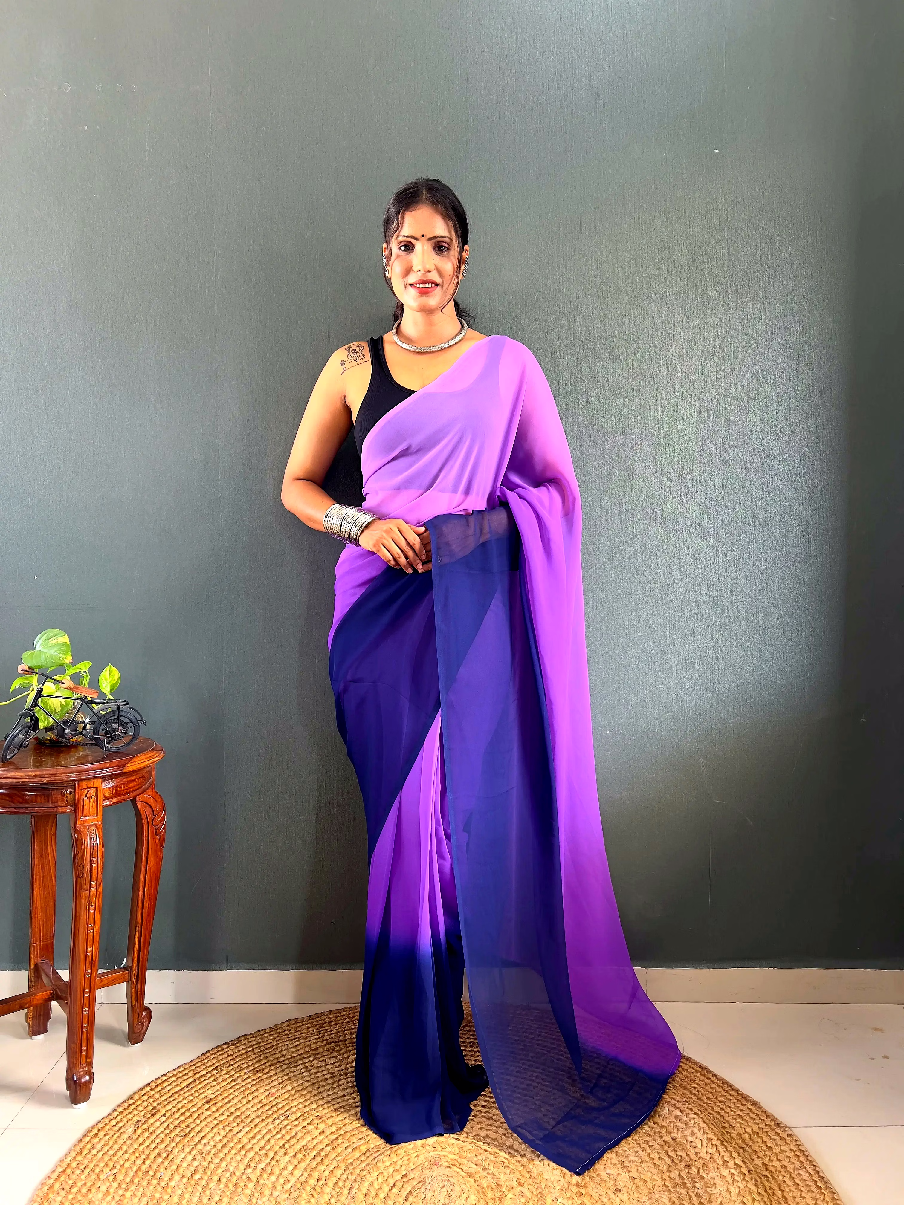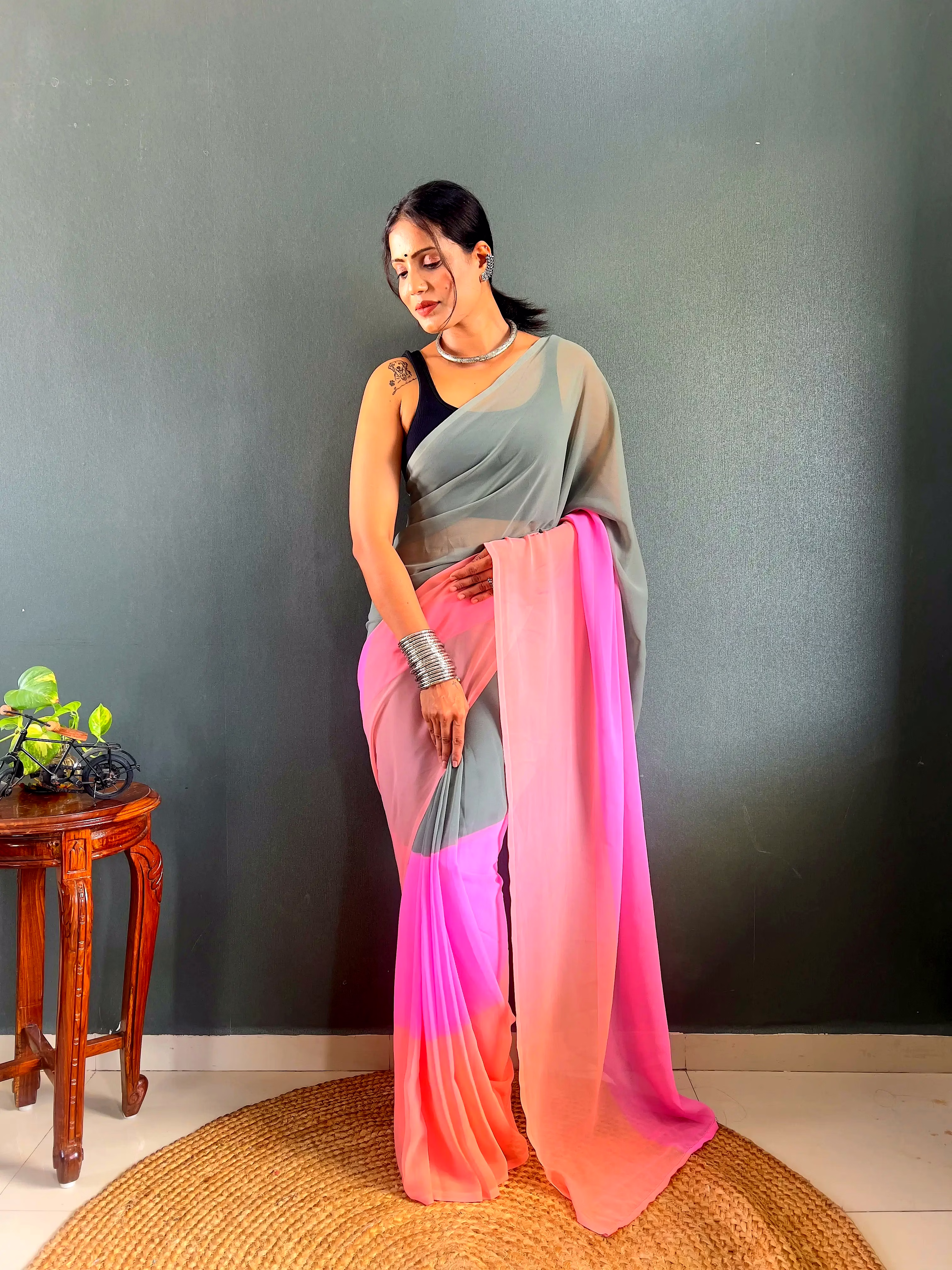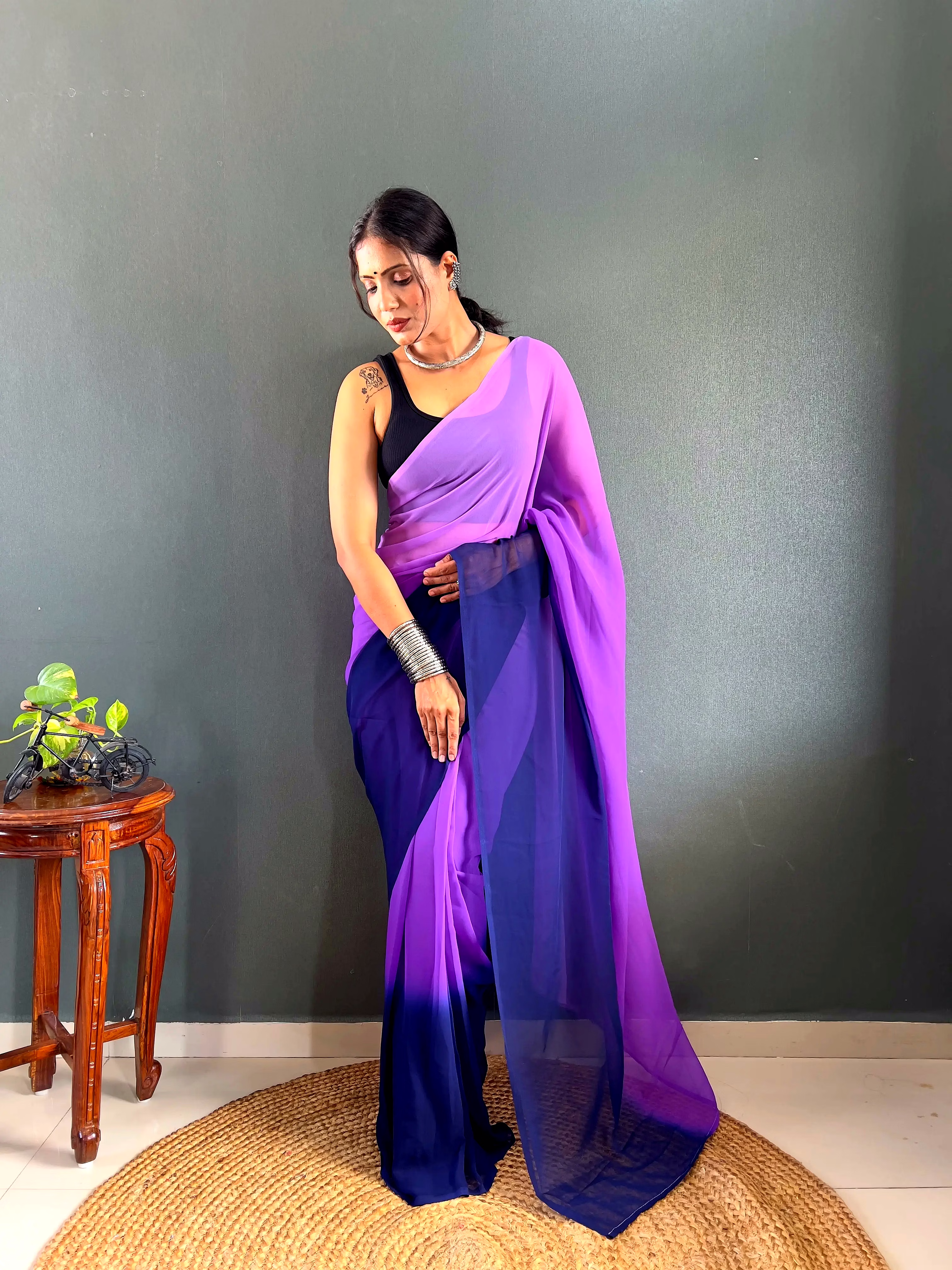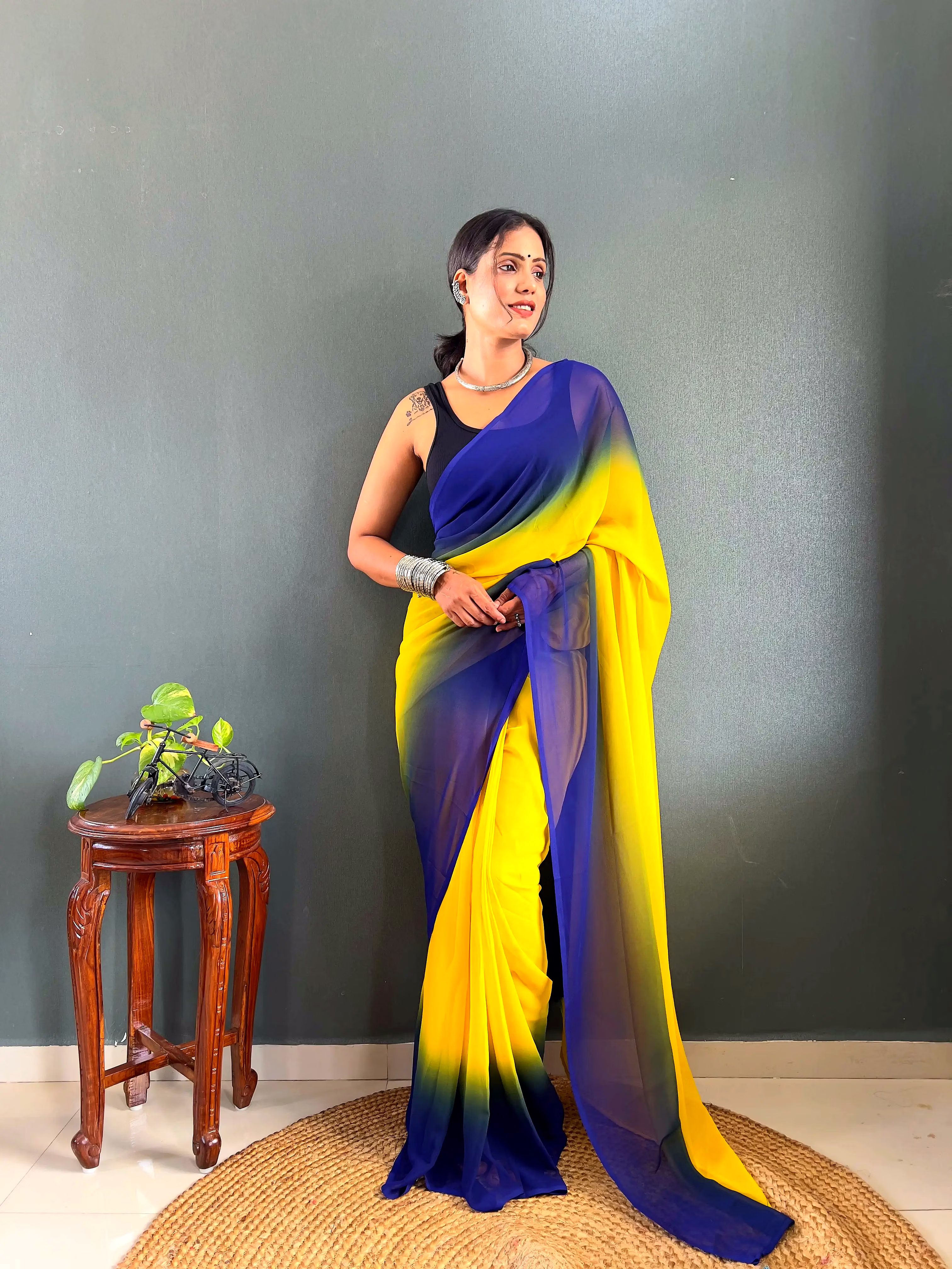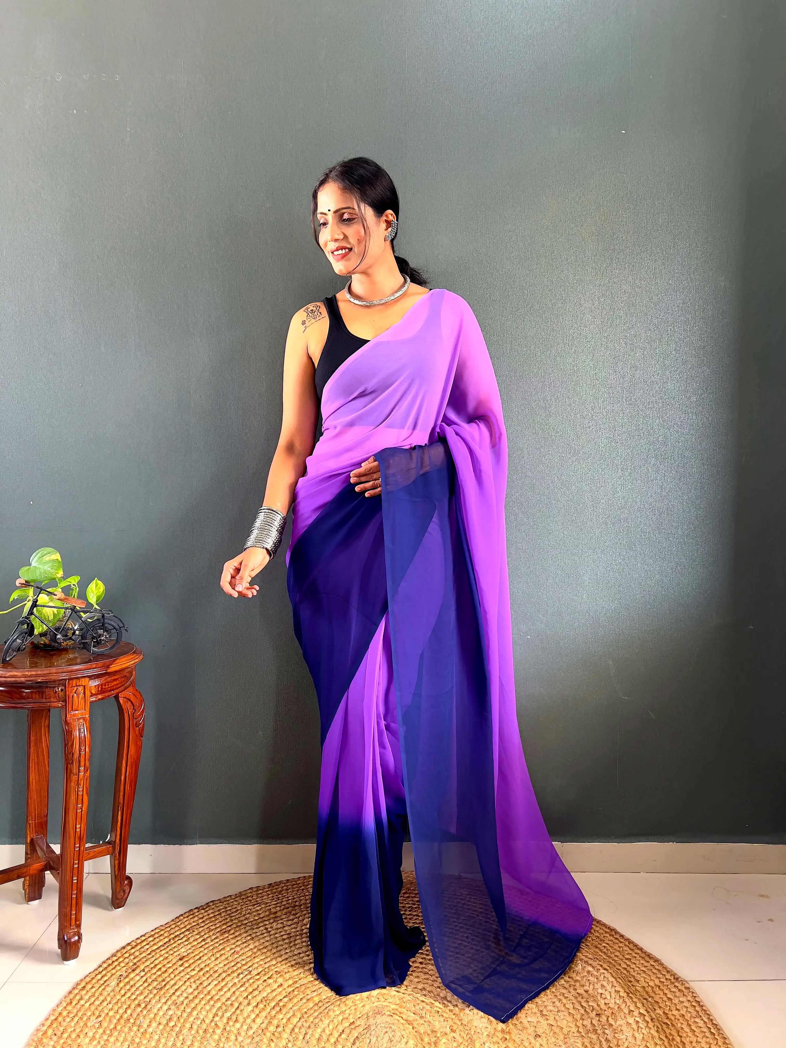 Elevate your style effortlessly with our Dual Tone Georgette Ready to Wear Saree. Embrace convenience and elegance in one stunning piece.