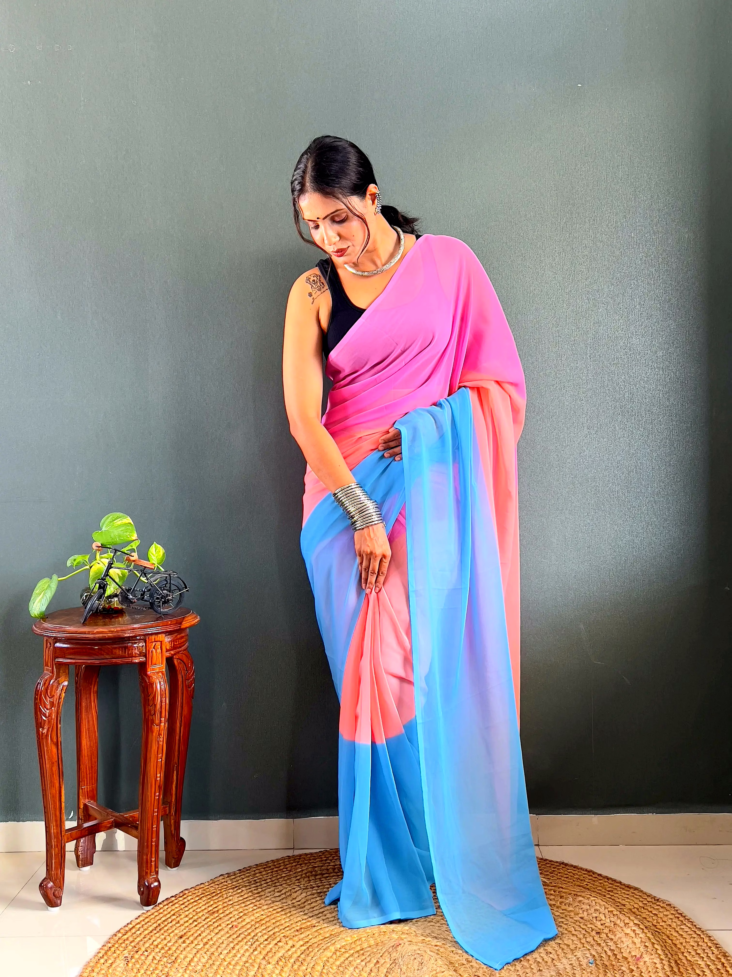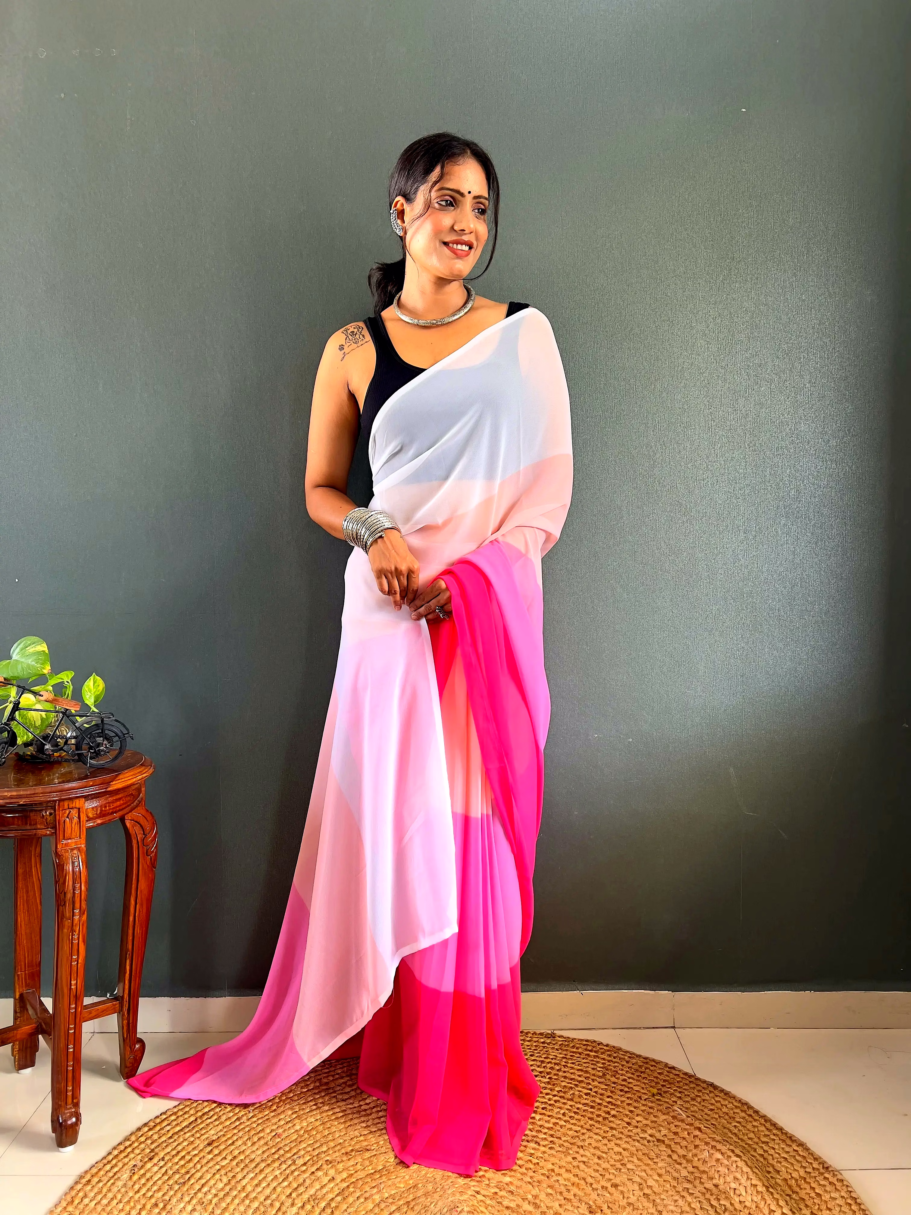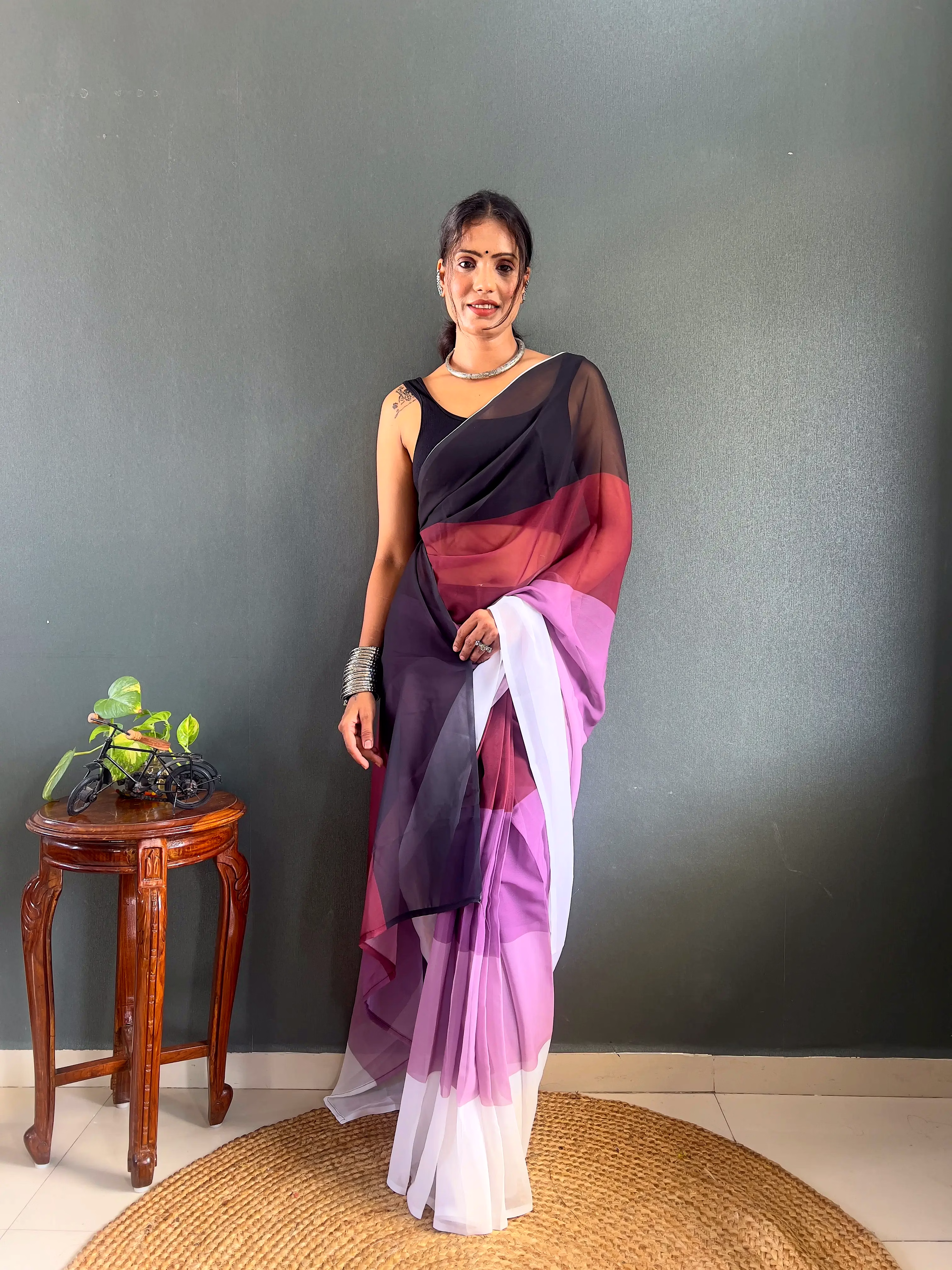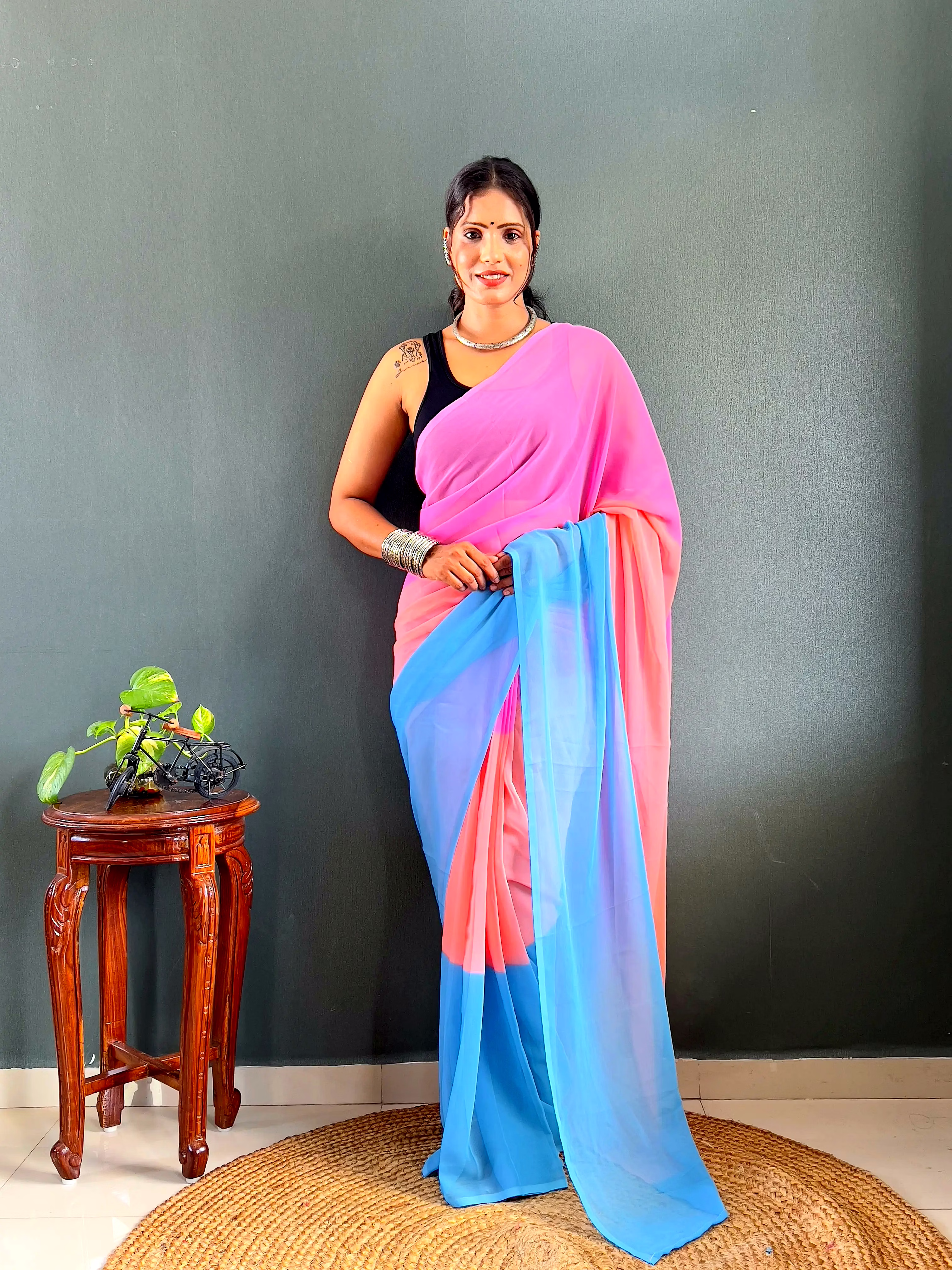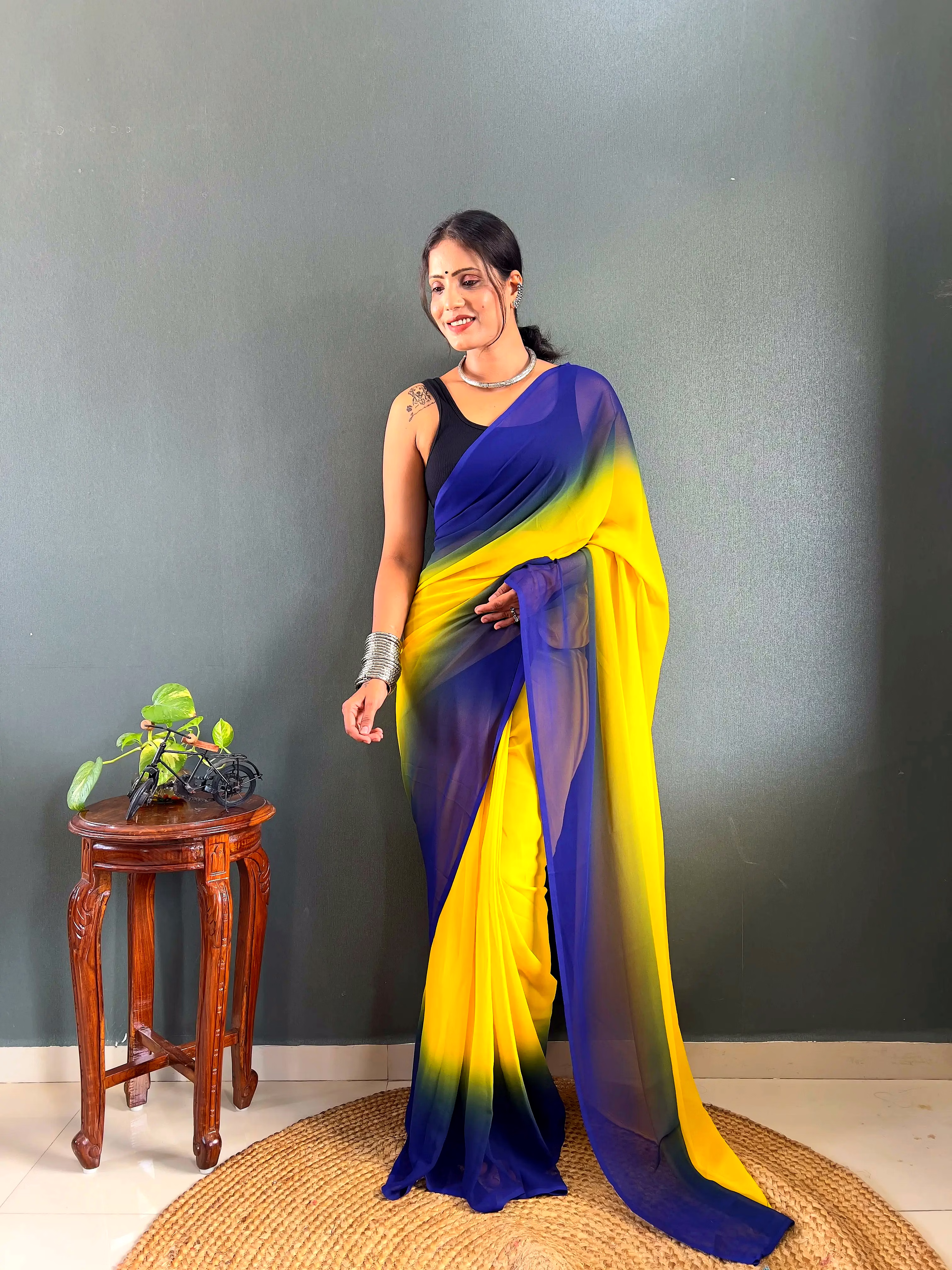 Elevate your style effortlessly with our Dual Tone Georgette Ready to Wear Saree. Embrace convenience and elegance in one stunning piece.