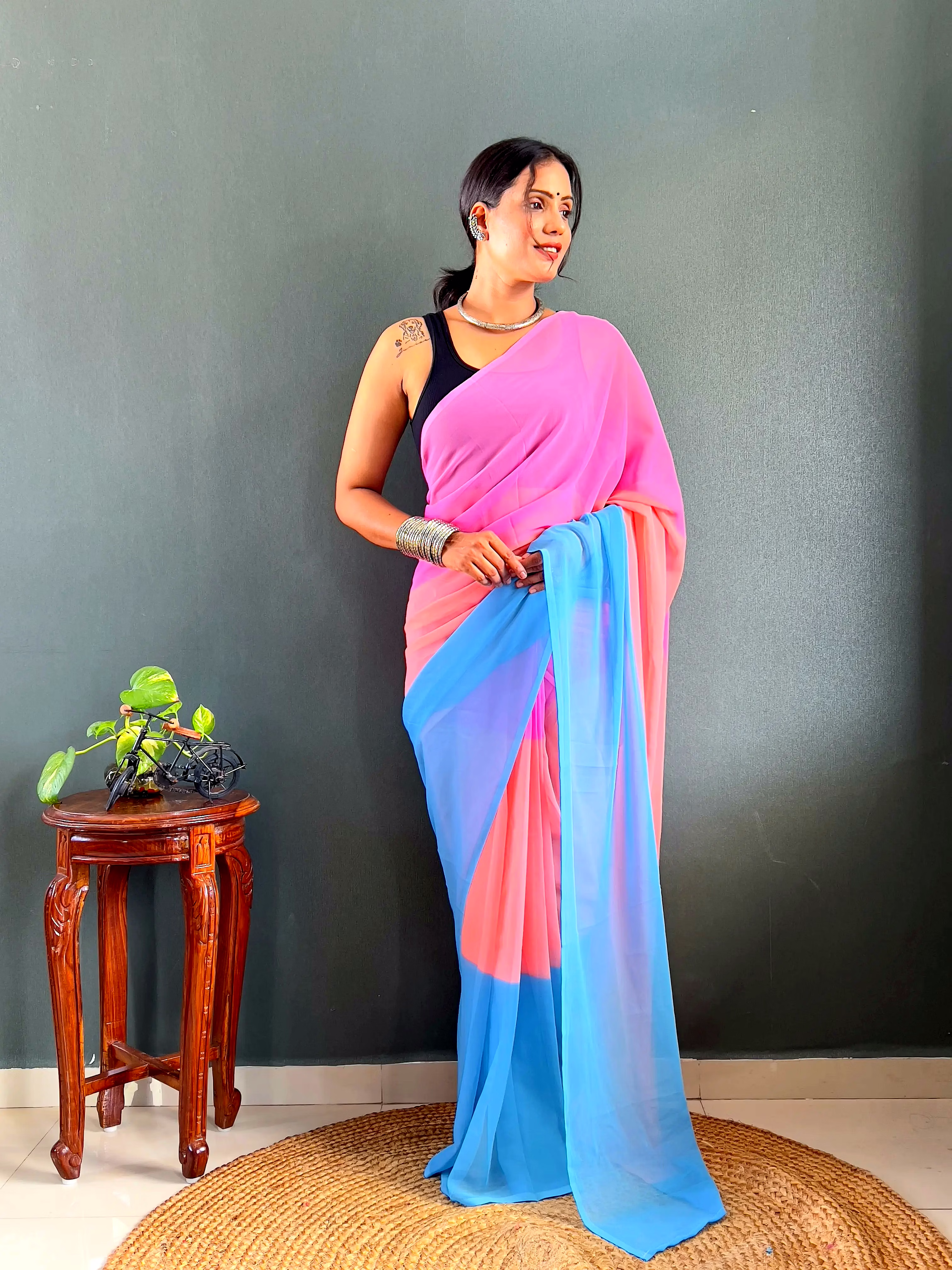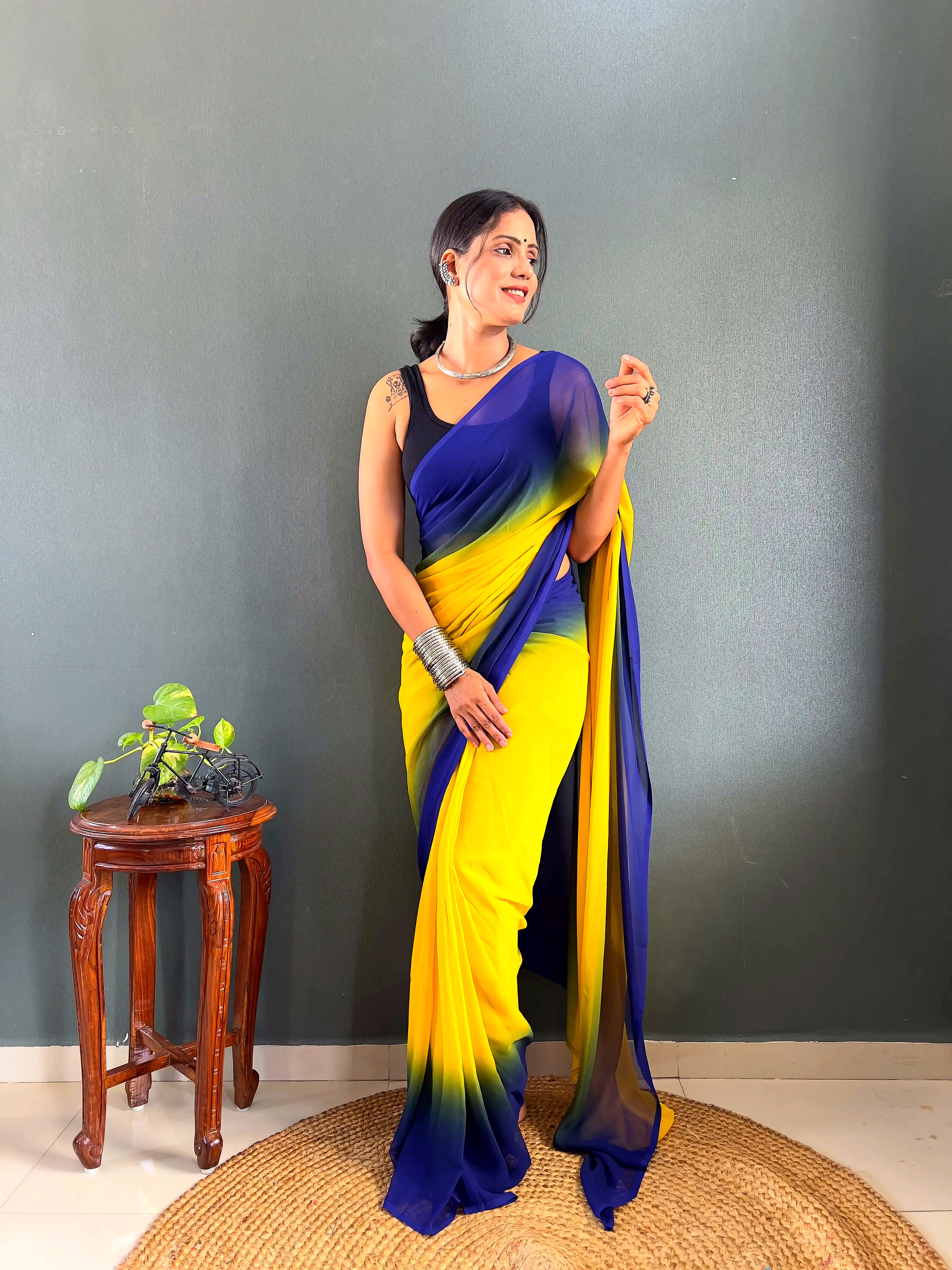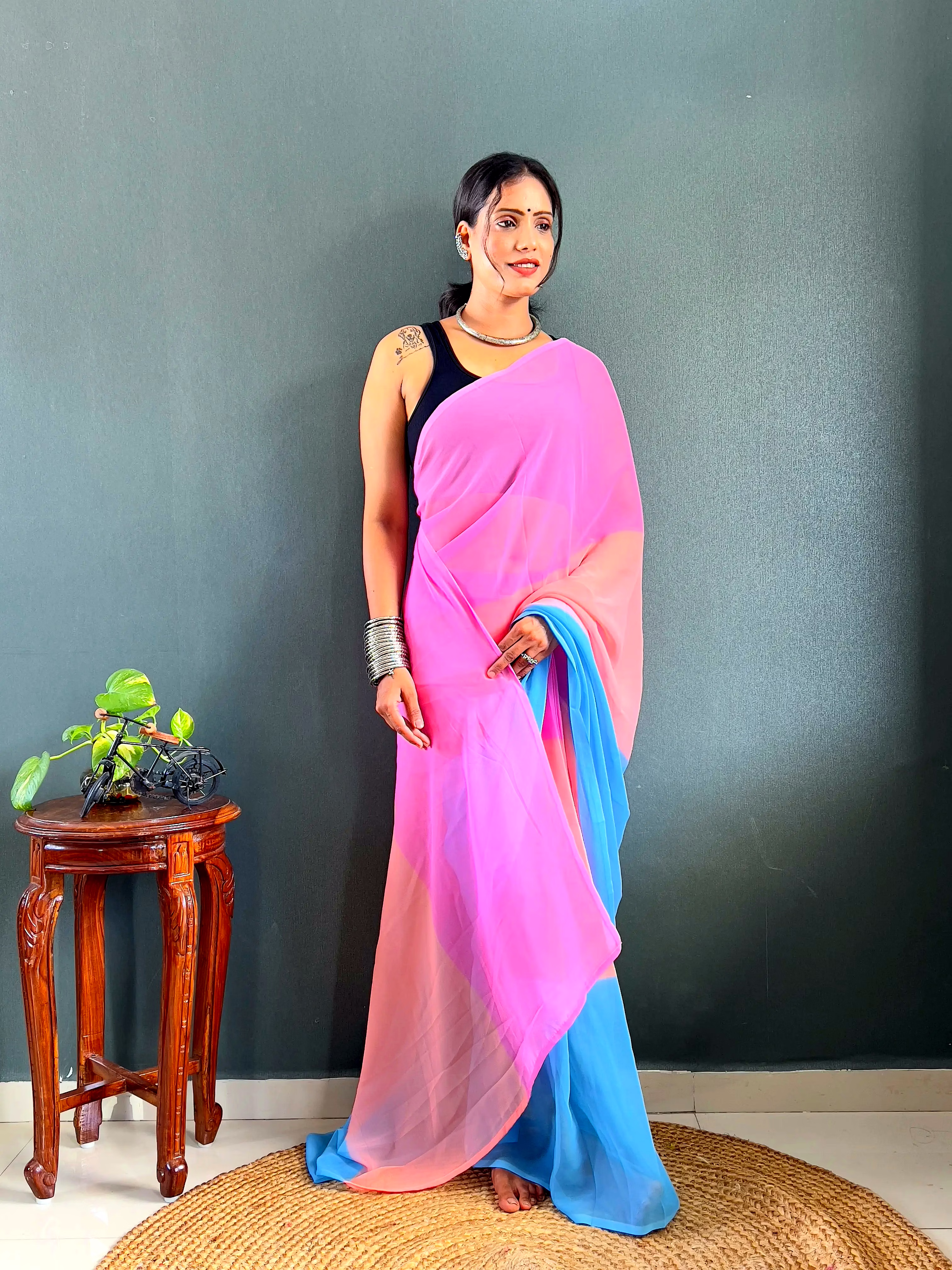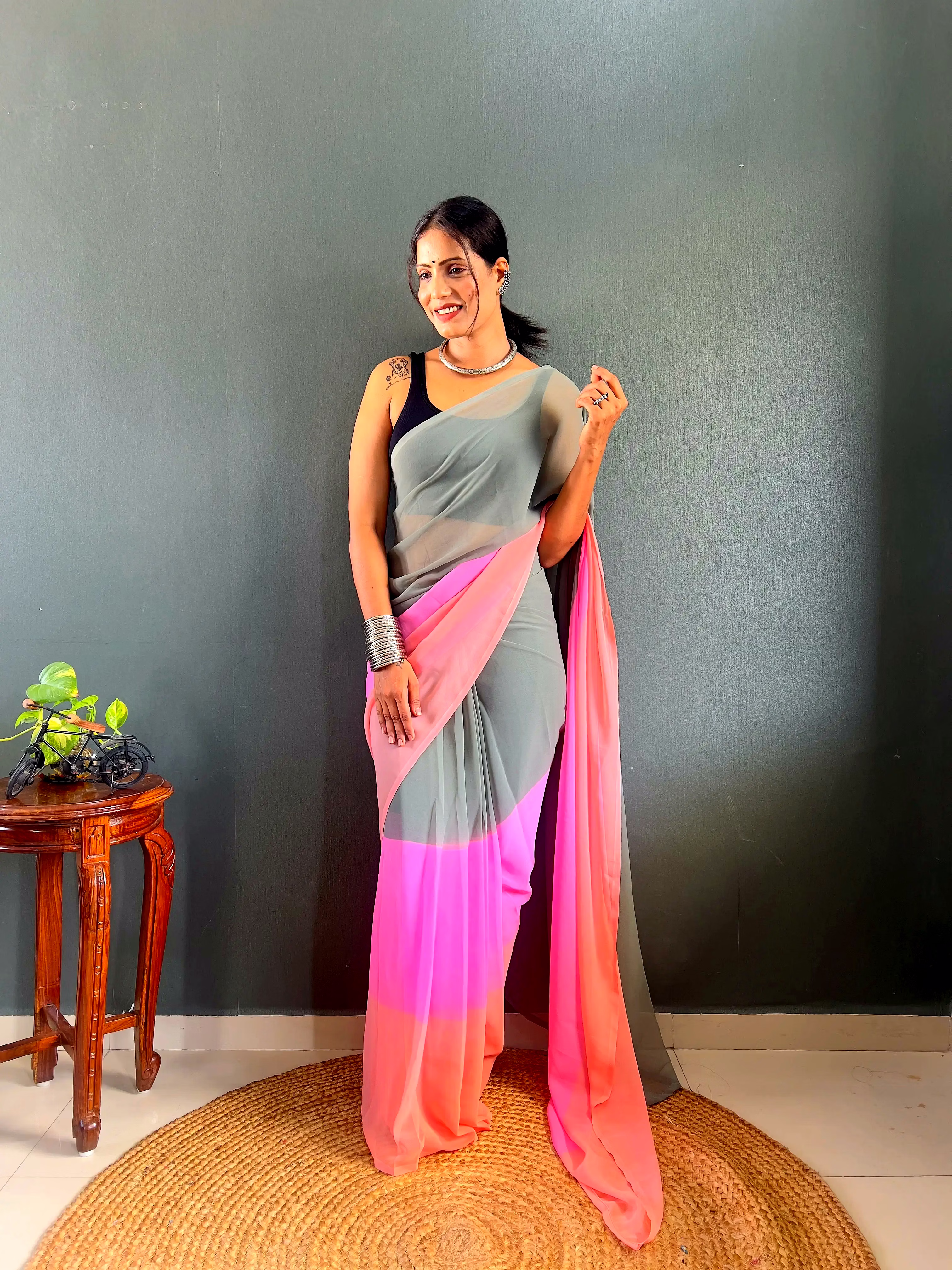 Elevate your style effortlessly with our Dual Tone Georgette Ready to Wear Saree. Embrace convenience and elegance in one stunning piece.