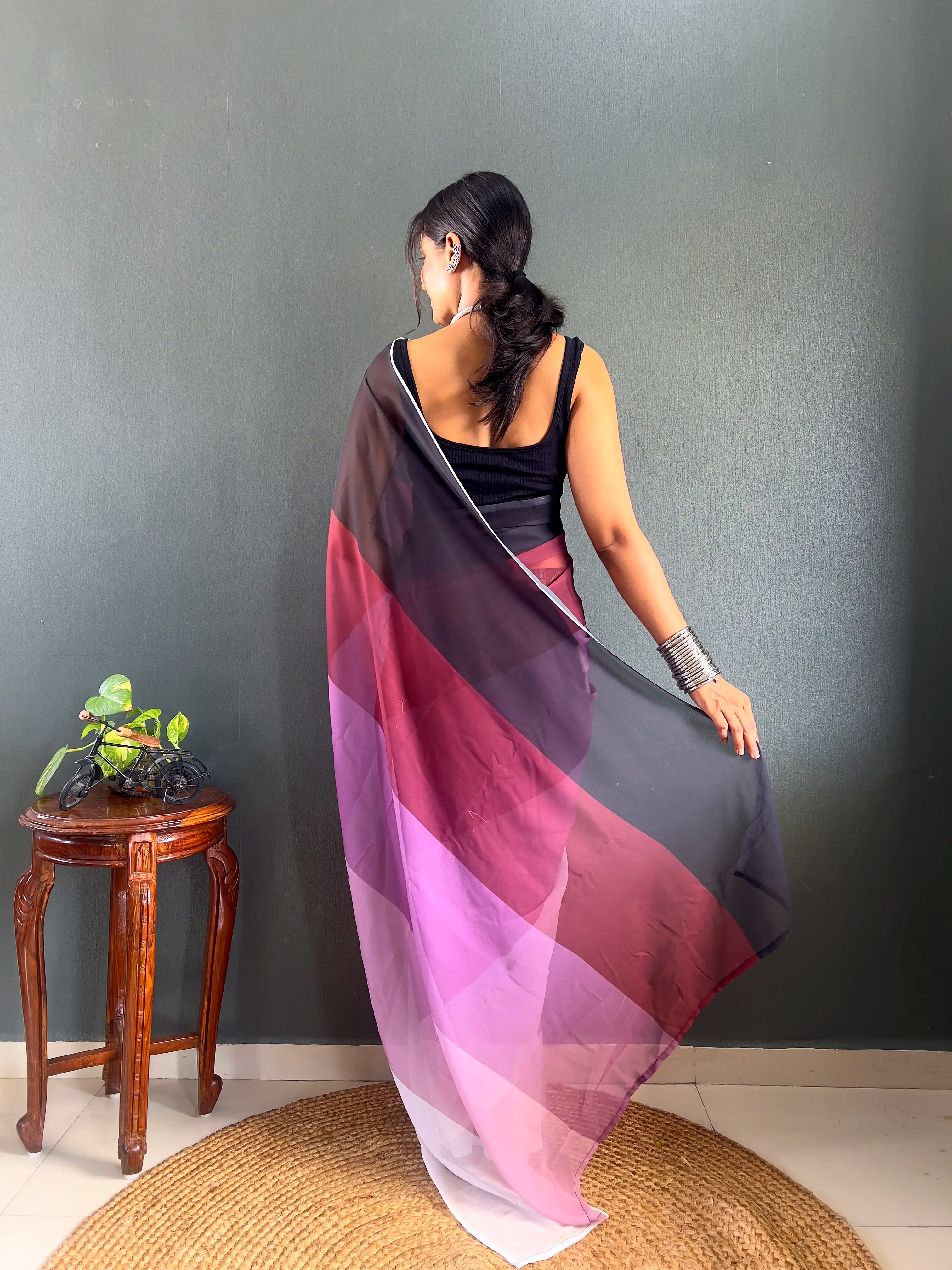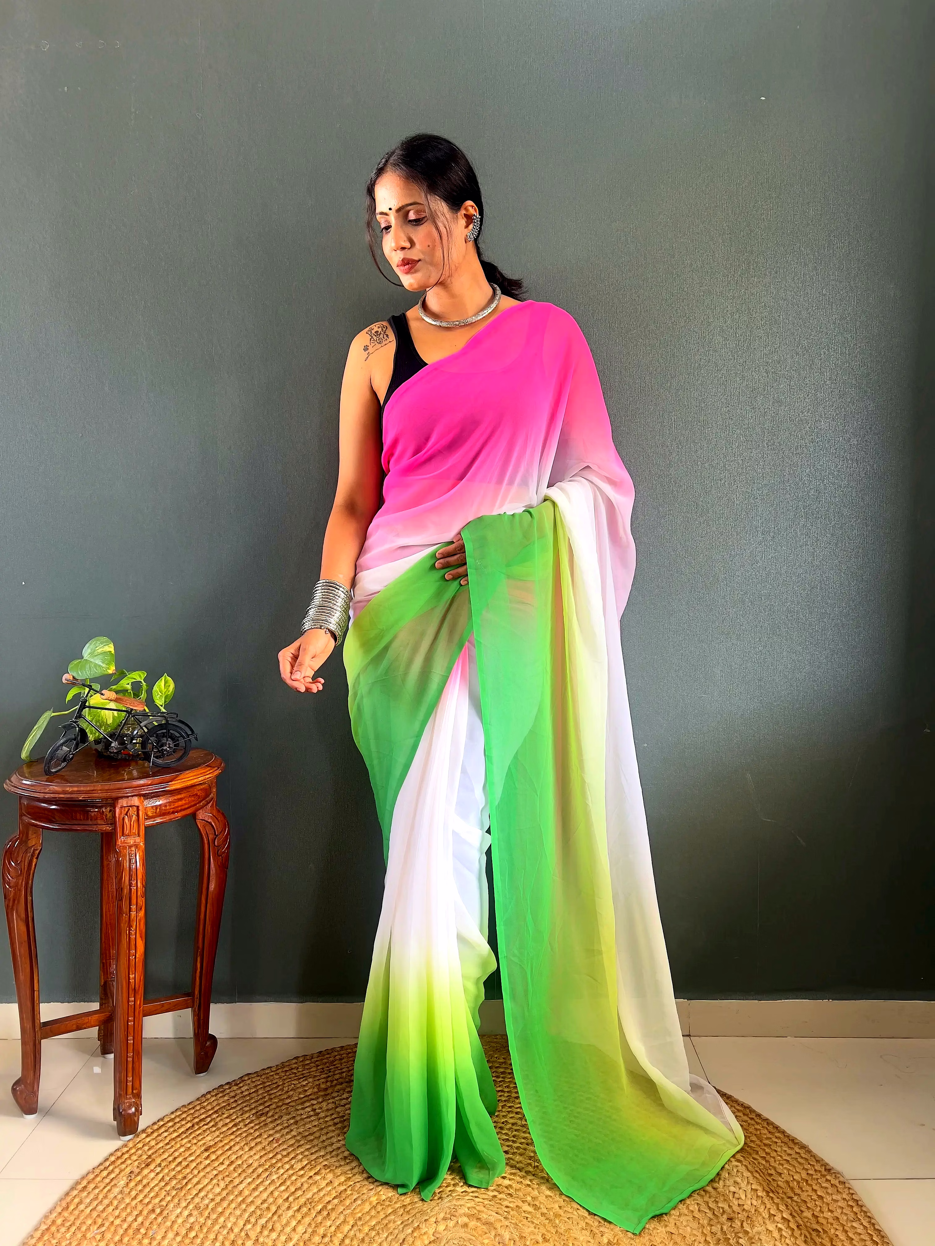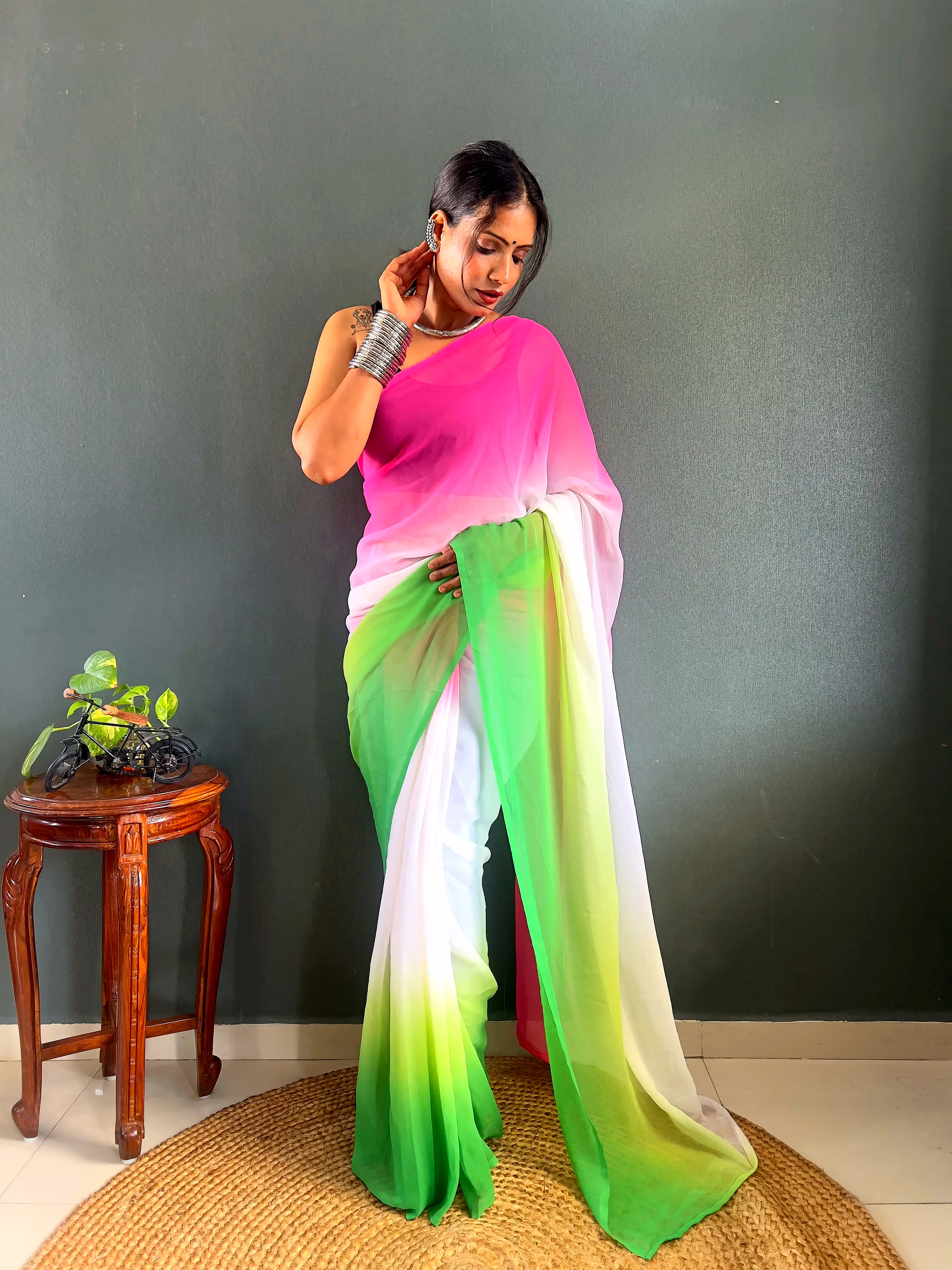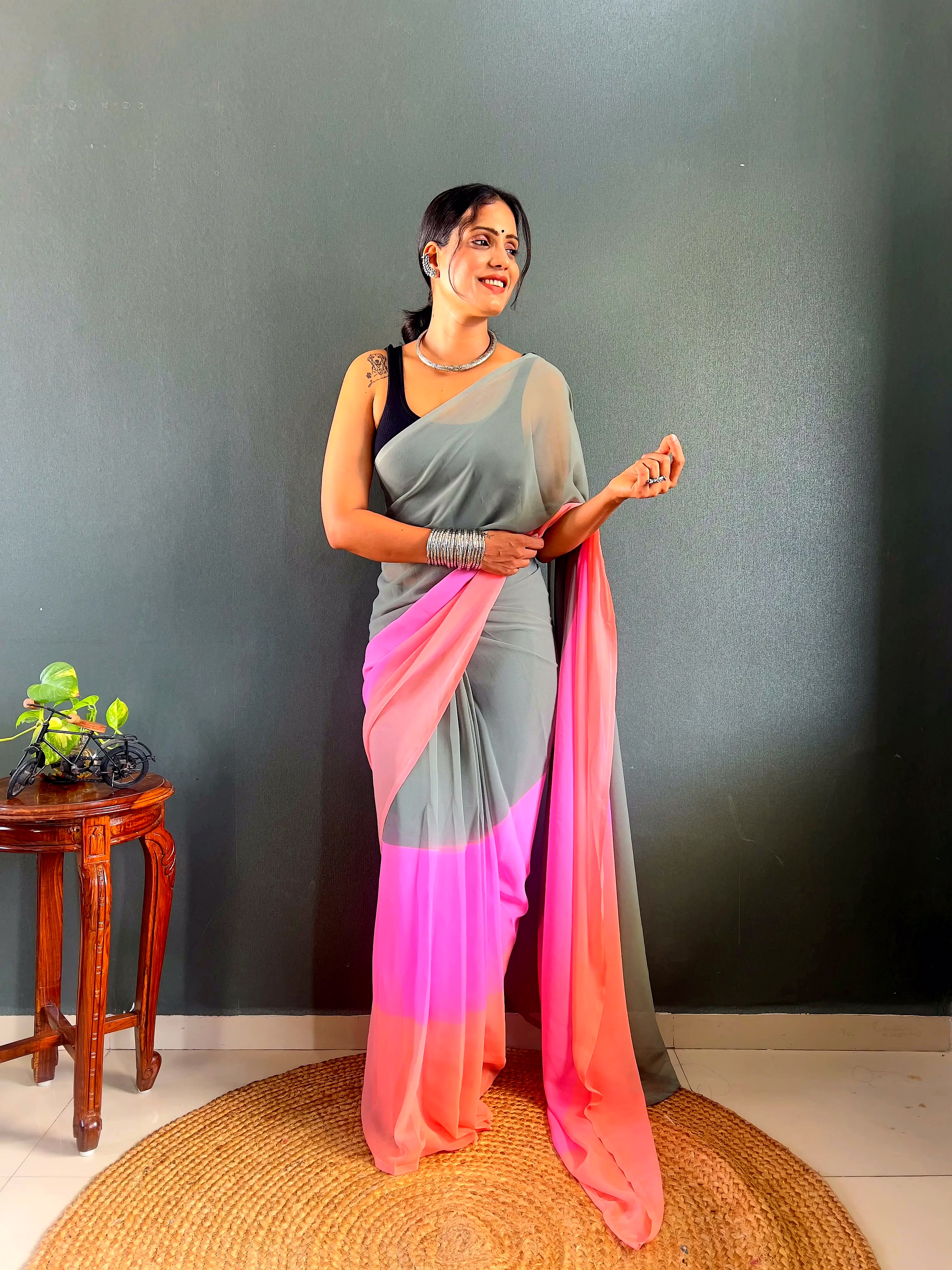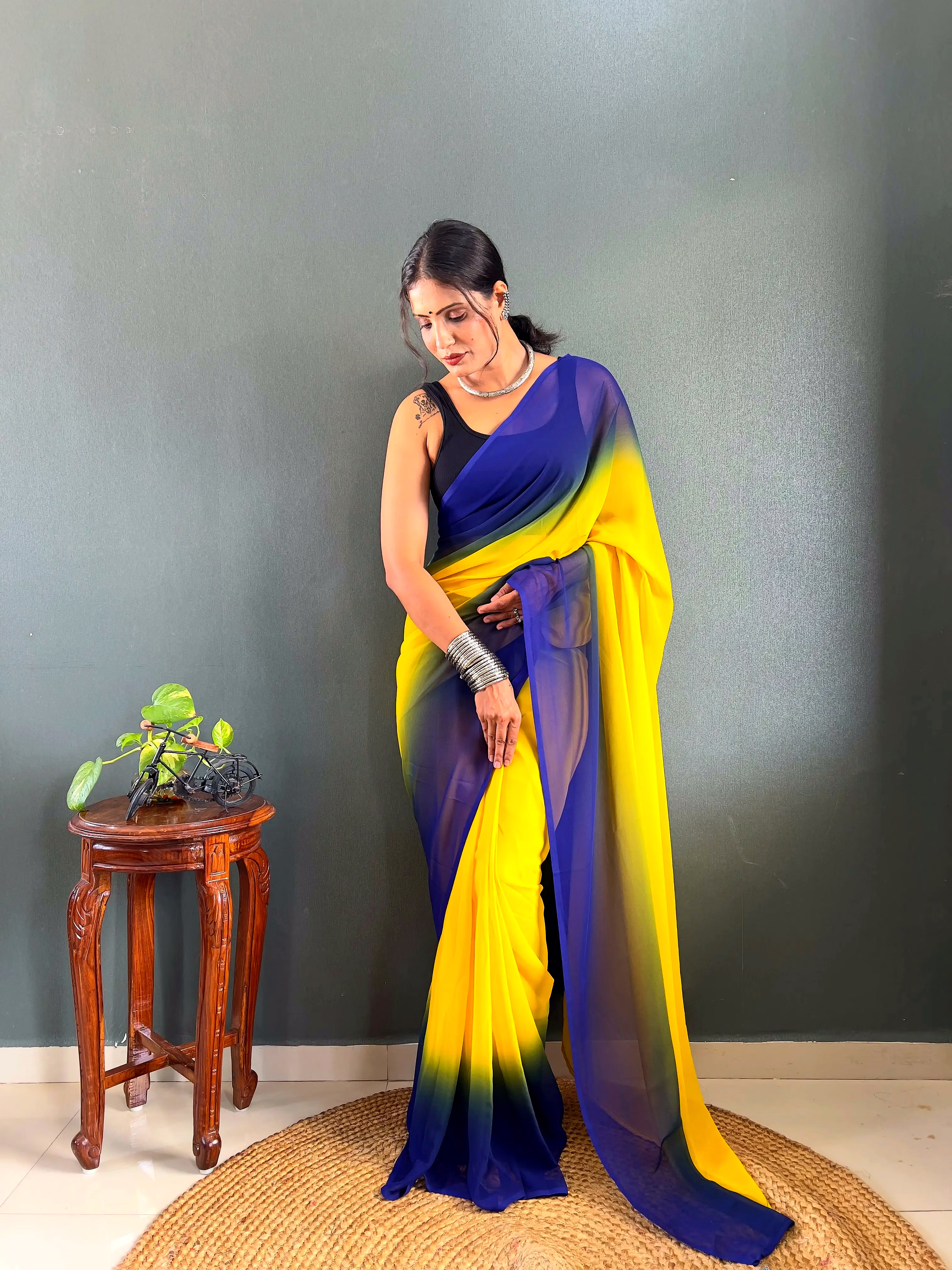 Elevate your style effortlessly with our Dual Tone Georgette Ready to Wear Saree. Embrace convenience and elegance in one stunning piece.